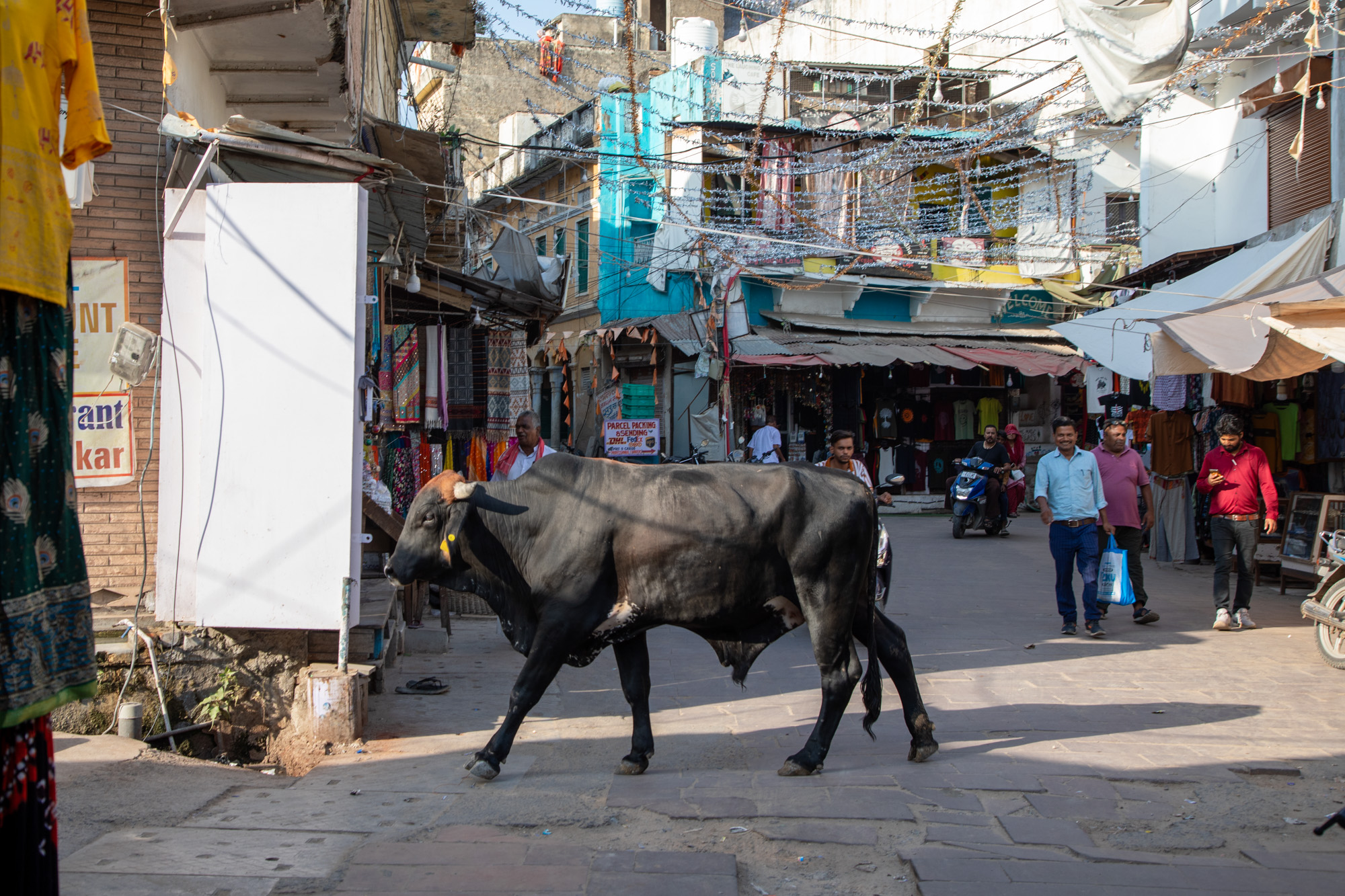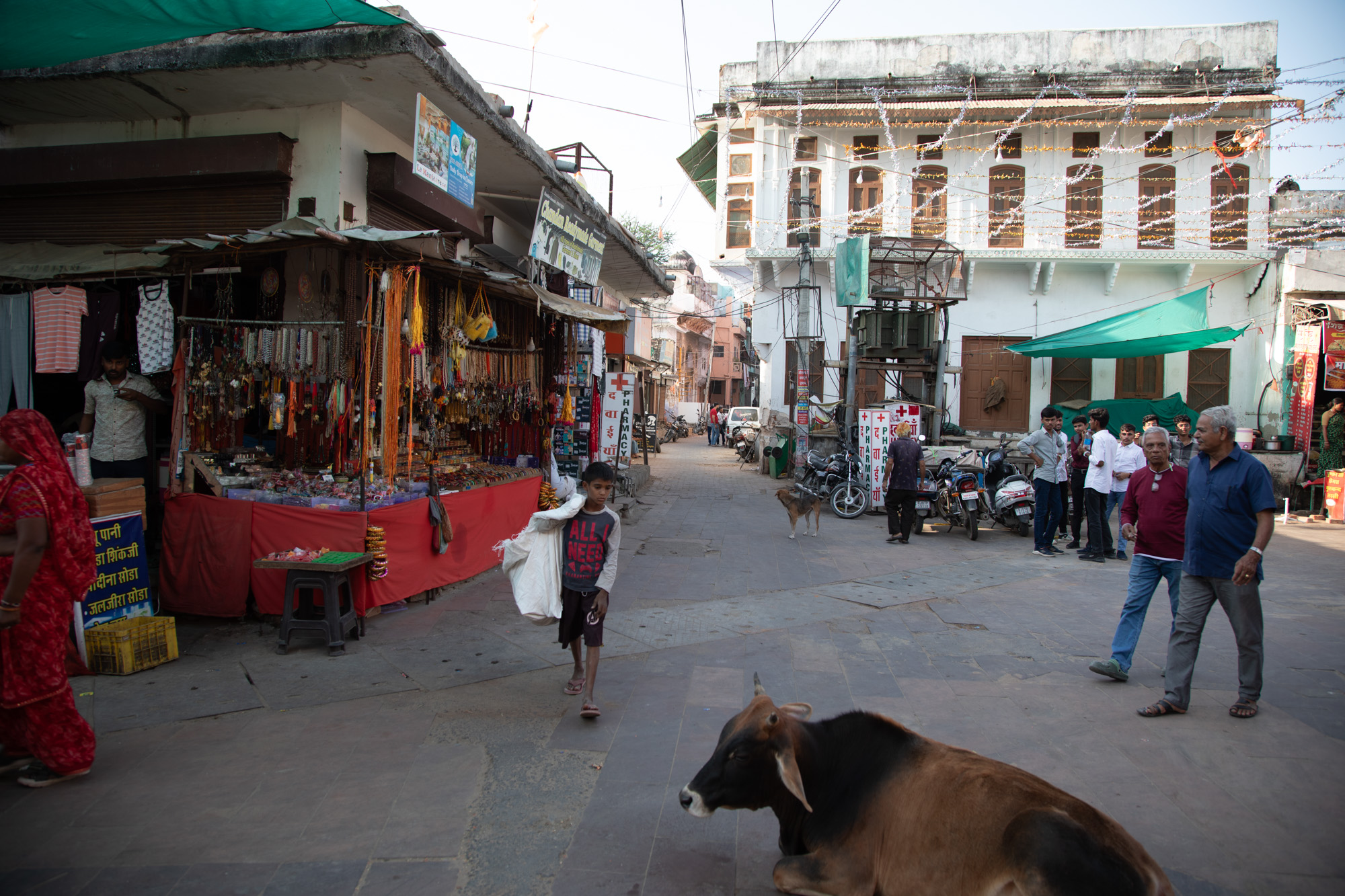 On achète quand même des tongs en cuir (un peu ambigu sachant que juste derrière on ne peut pas marcher avec sur le ghat) et des bijoux dans une échoppe où le vendeur nous a annoncé des prix très intéressants sans vouloir nous prendre pour des pigeons. Il nous a tout de suite proposé un prix raisonnable, alors que tous les autres marchands partaient de beaucoup trop haut, son attitude gentille et douce nous a surpris. On achète donc beaucoup de choses dans son échoppe pour ramener des souvenirs à la famille. Les vaches se promènent avec quiétude dans ce paysage urbain.