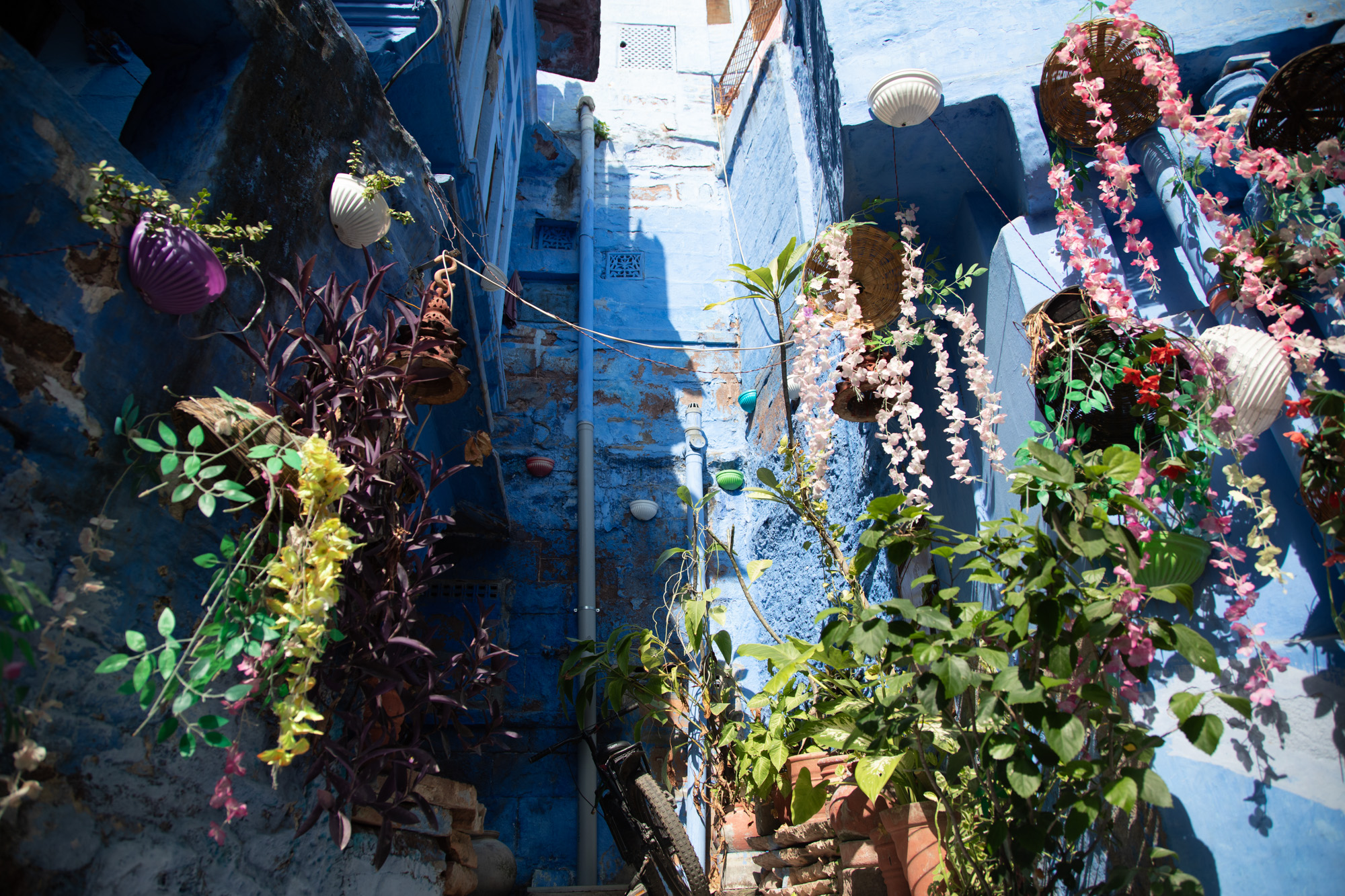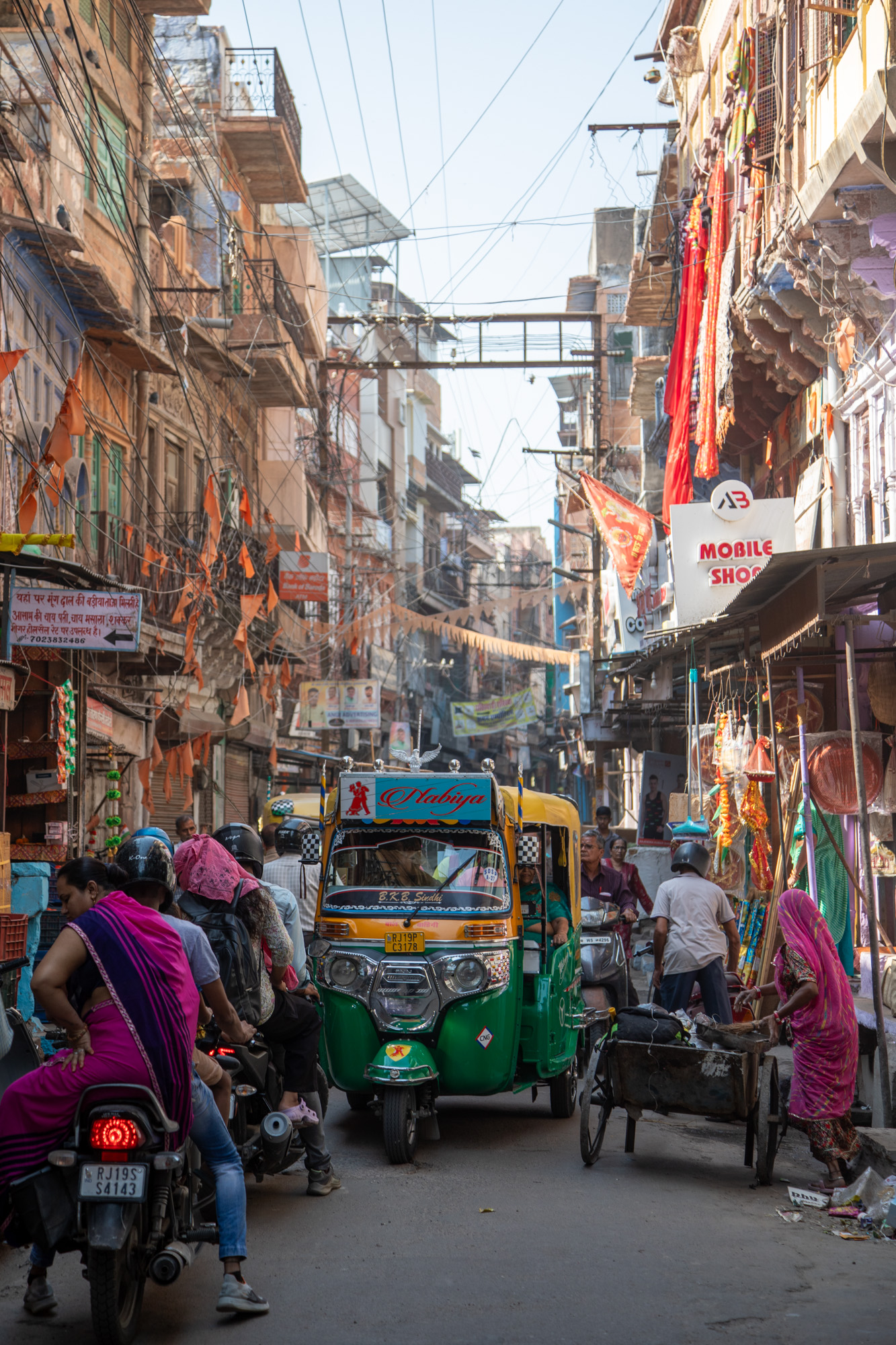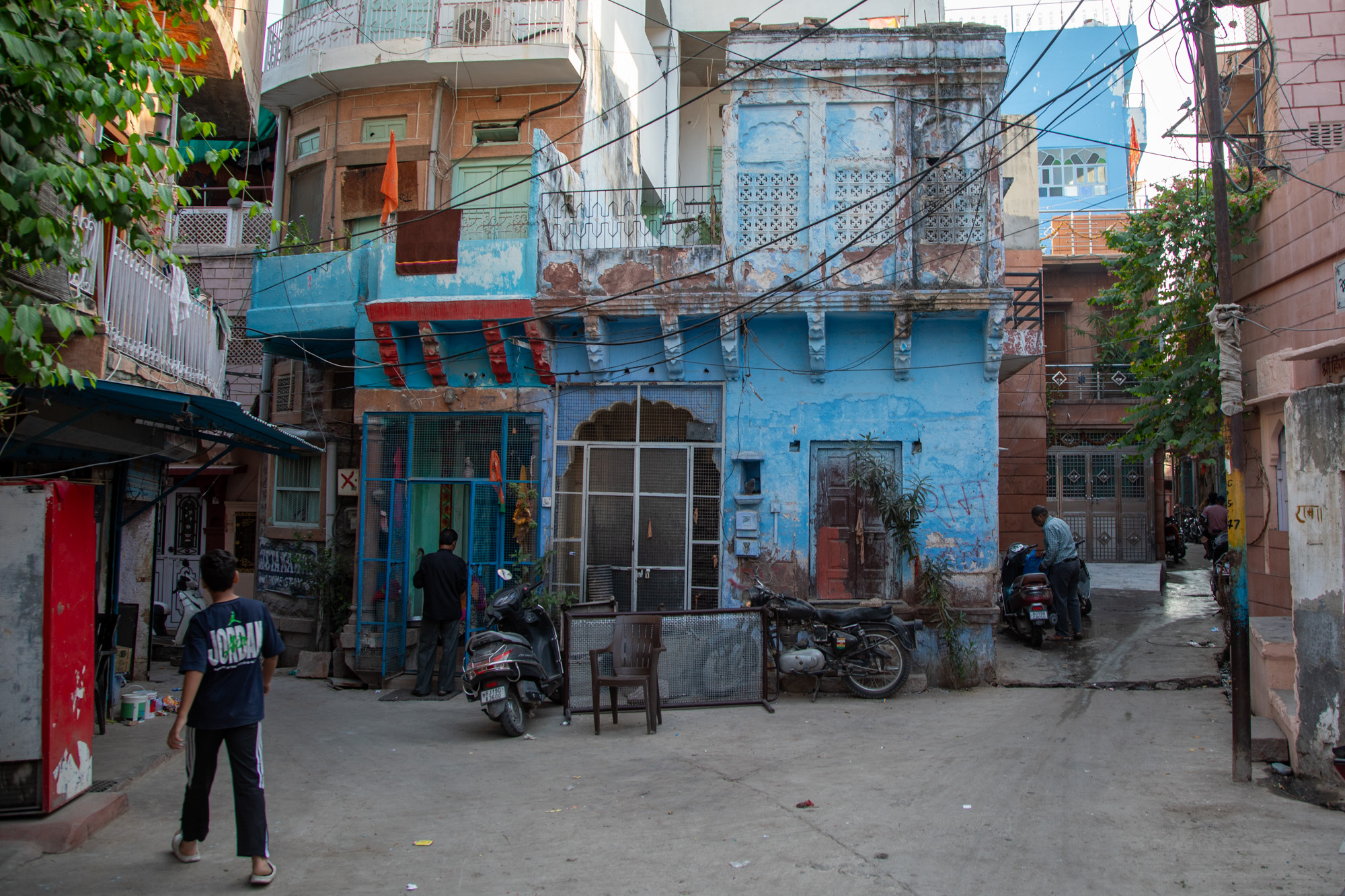 La vieille ville de Jodhpur a vraiment des airs de ville du désert, comme dans un conte des mille et une nuits. Les ruelles sont étroites, les bâtiments très hauts, le soleil ne passe pas, il y a des odeurs, des chiens rodent, les motos nous frôlent, la mosquée fait les appels à la prière. Il y a déjà pas mal de boutiques pour les touristes mais on sent que le quartier a gardé encore son âme.