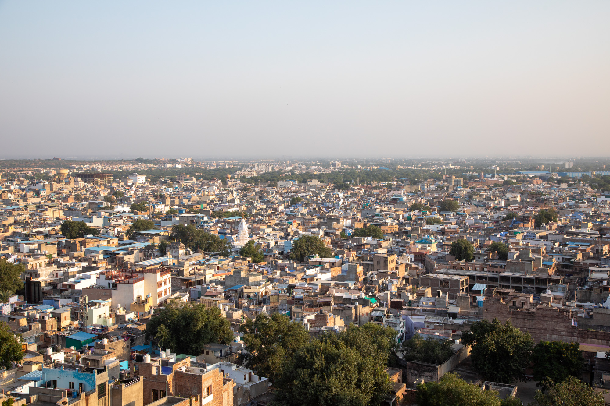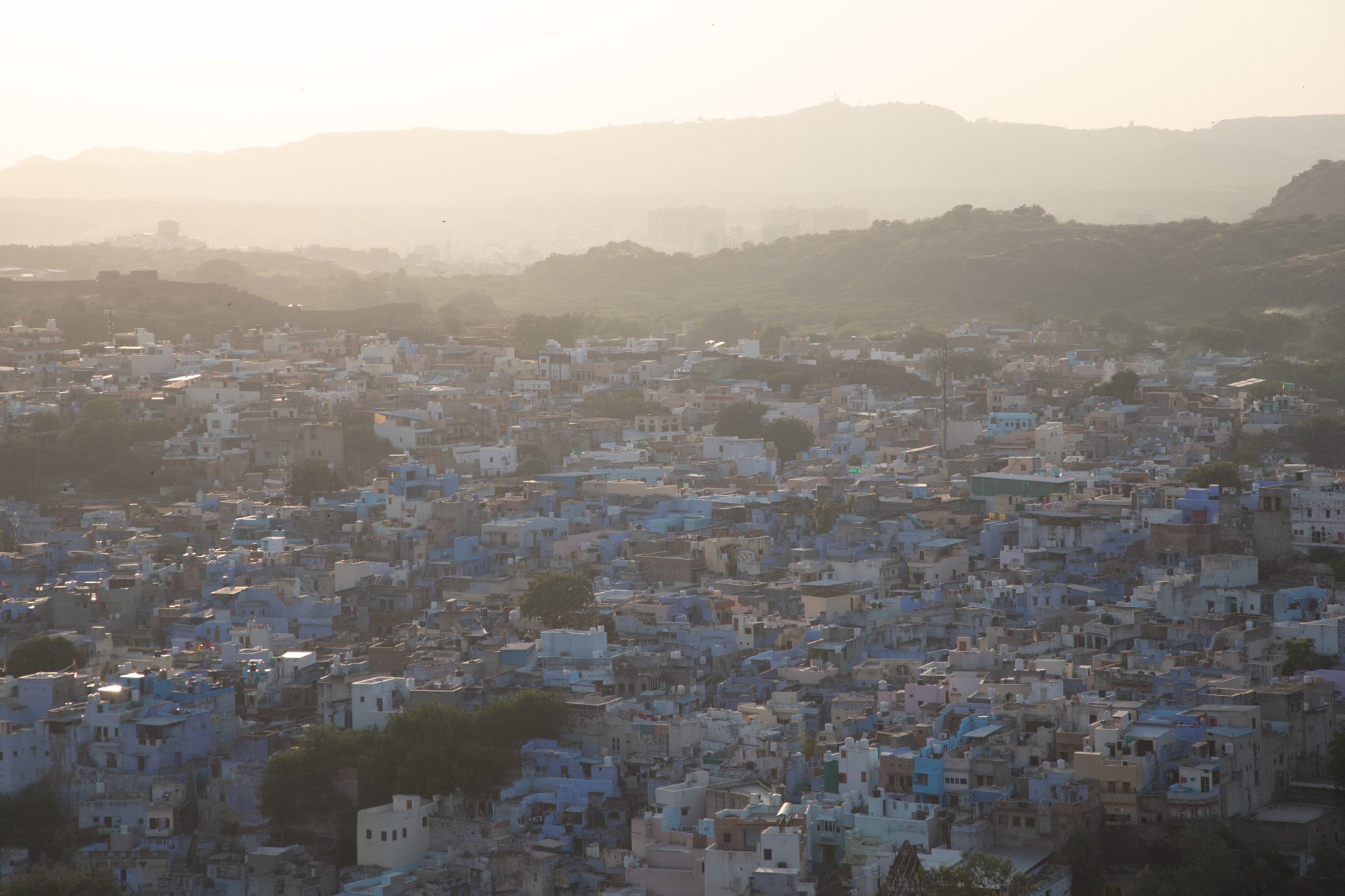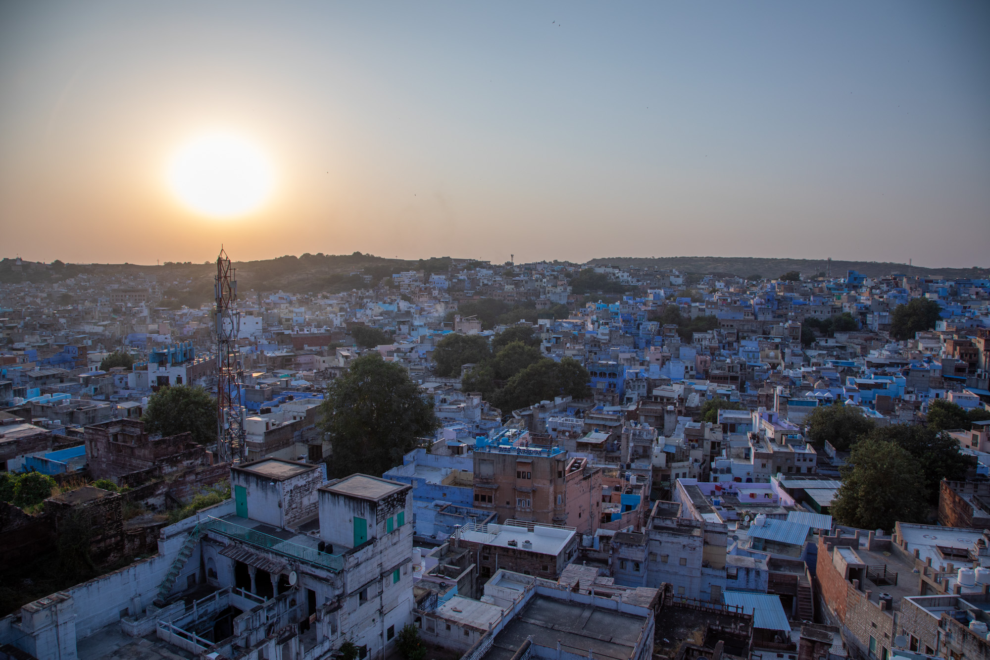 De l'autre côté, le soleil va se coucher, la lumière est douce sur la ville de Jodhpur.