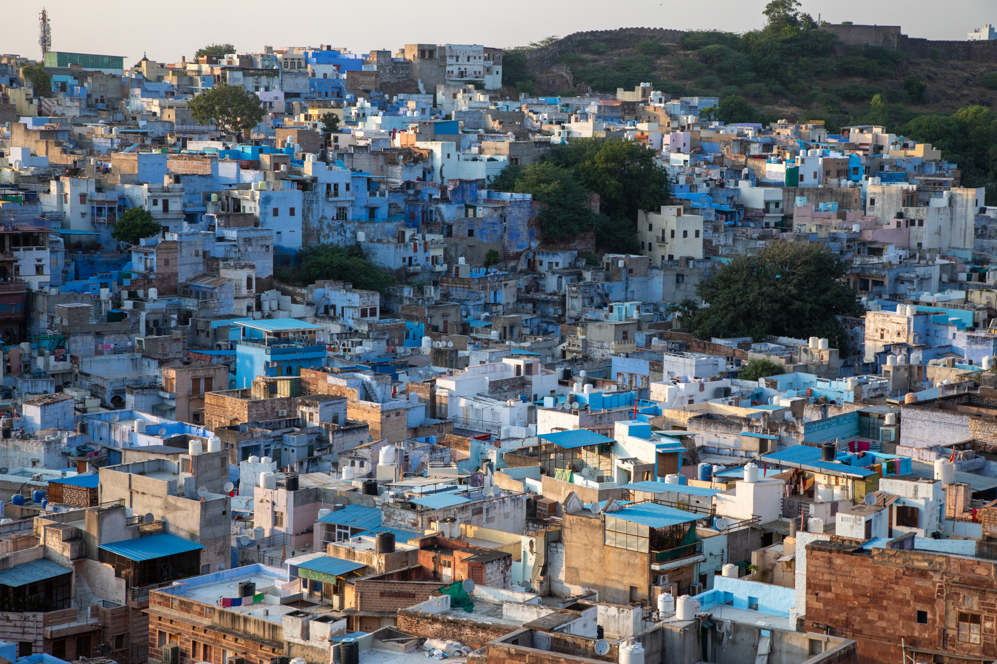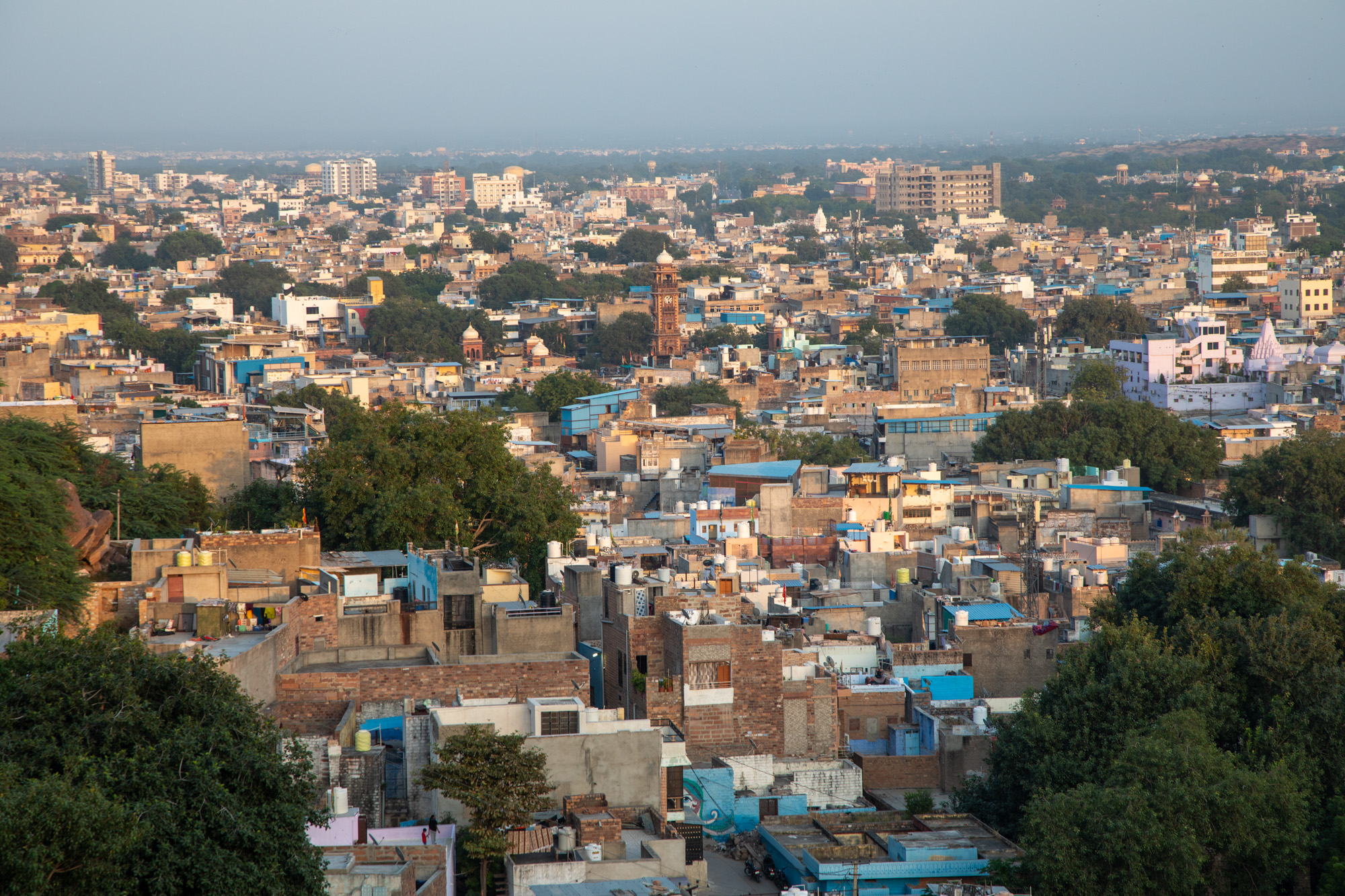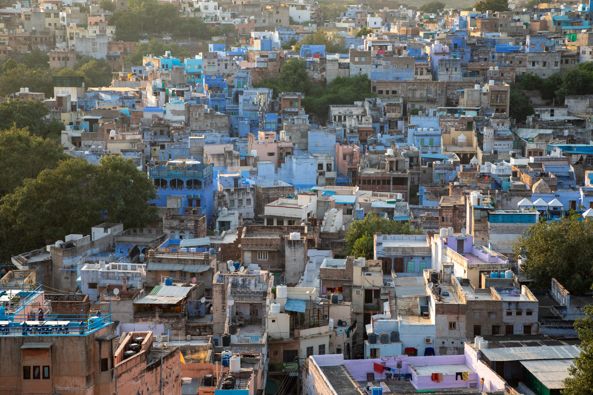 De l'autre côté, le soleil va se coucher, la lumière est douce sur la ville de Jodhpur.