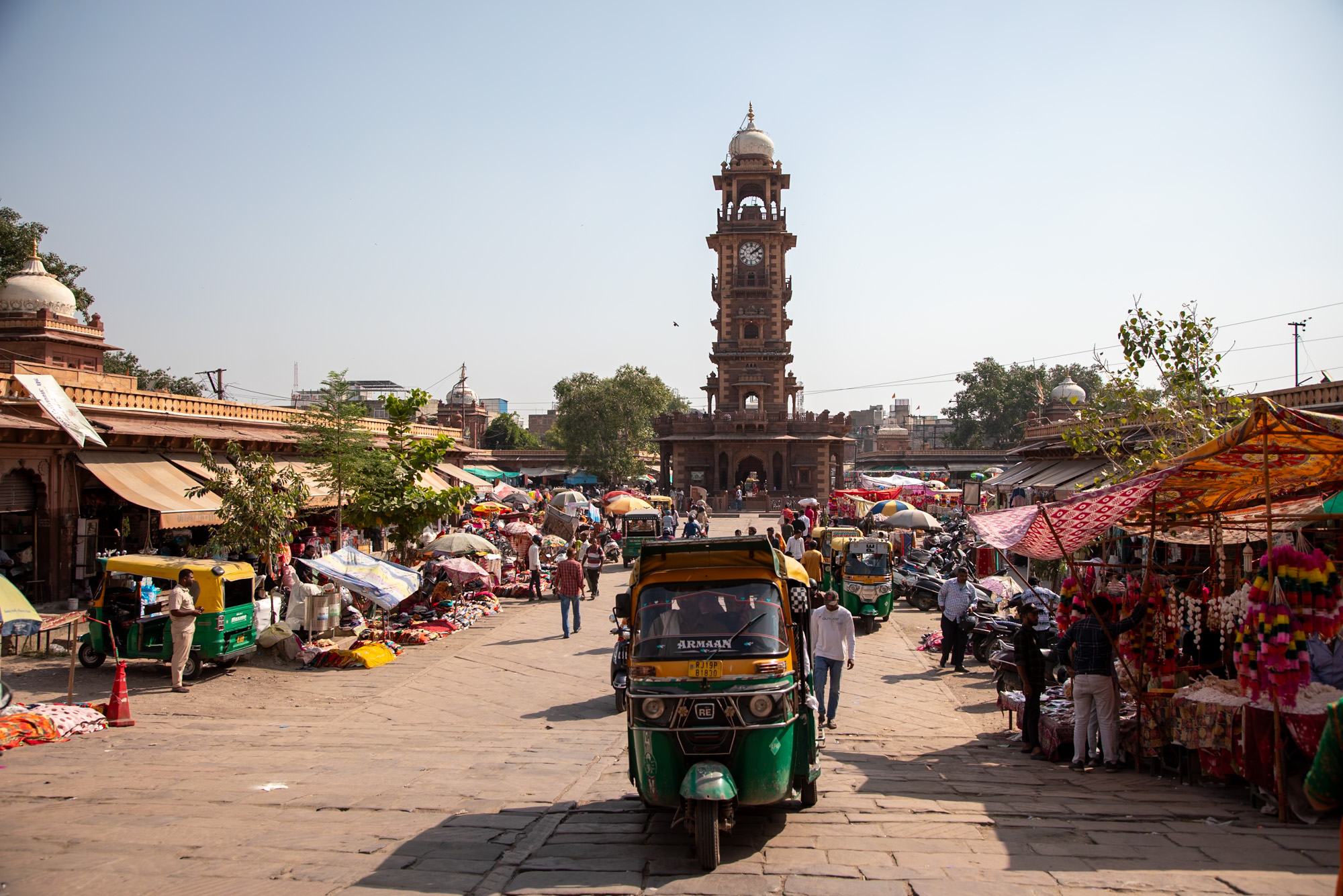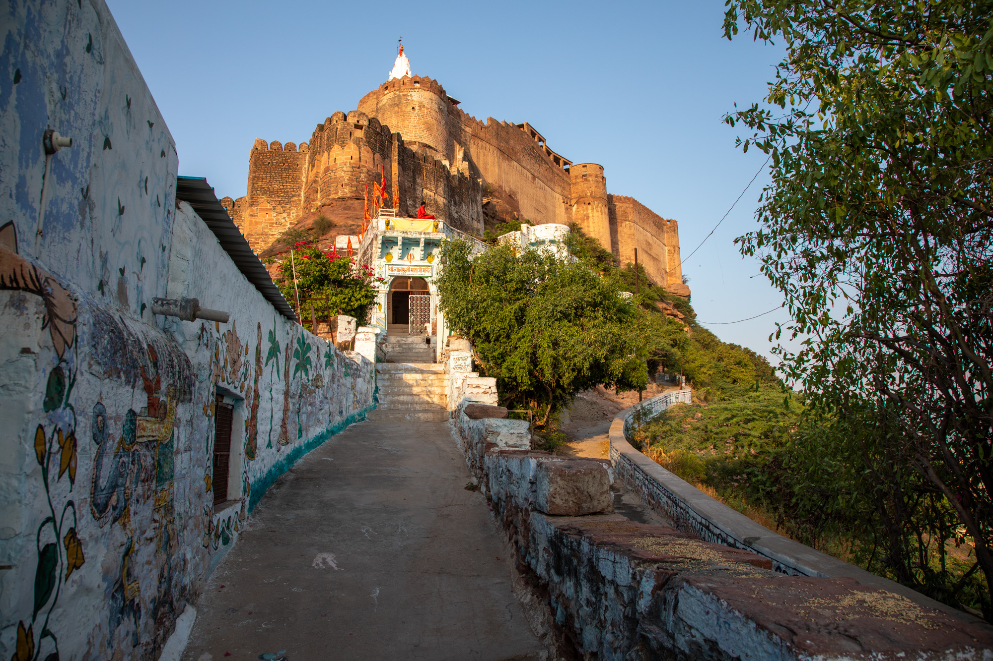 Au coucher du soleil exactement, les mosquées commencent à faire sonner l’appel à la prière. Le bruit vient de toute part des ruelles de la ville. En même temps, on entend les cloches des temples hindous qui résonnent. C’est une impression troublante, l’impression d’être à la frontière de deux mondes, résultat d’histoires millénaires, ici au milieu du désert du Thar.