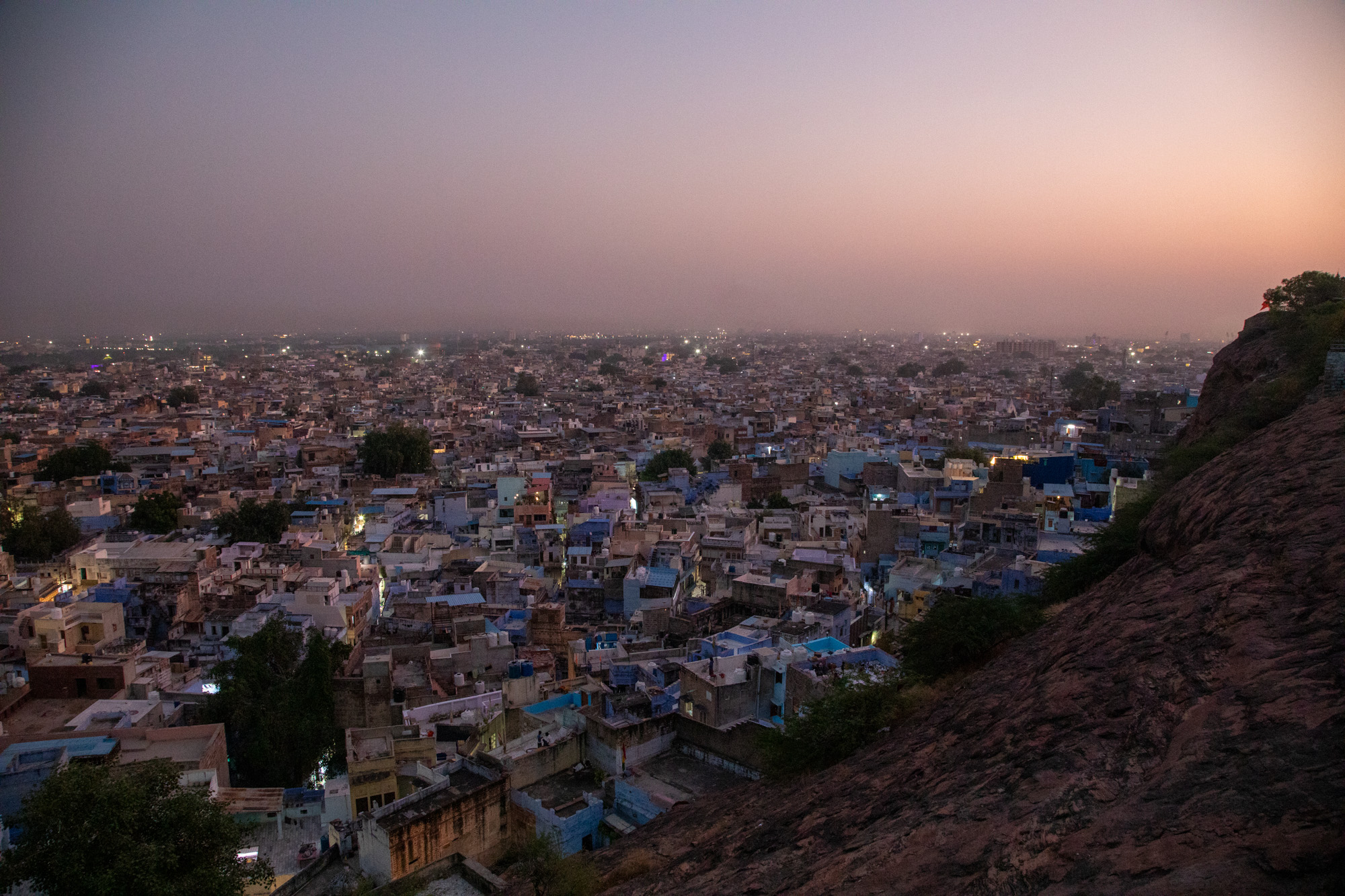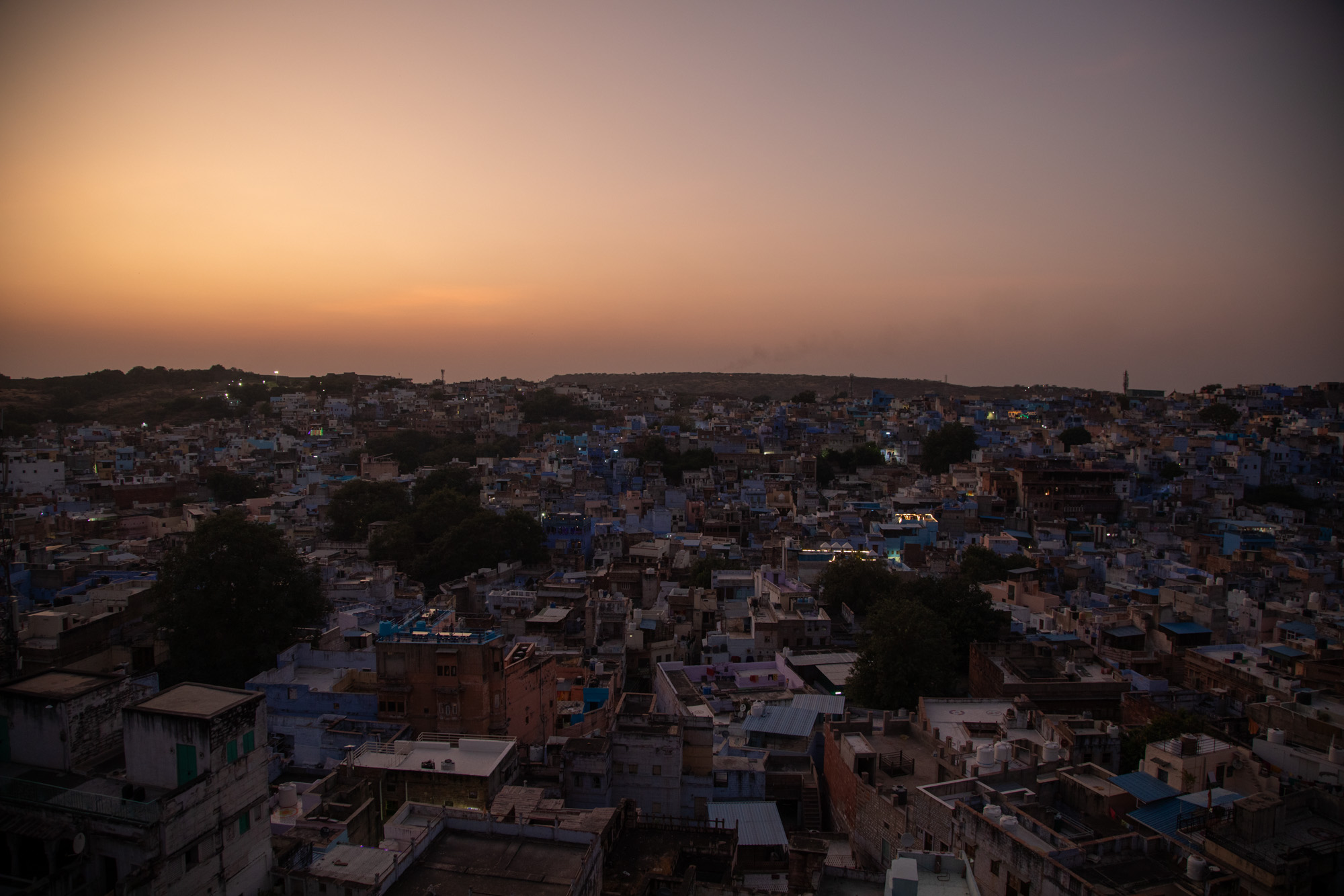 Avec les lumières qui commencent à scintiller, le spectacle continue malgré la nuit qui arrive. Cette soirée au dessus des toits de Jodhpur est fantastique, on ne peut que recommander de monter au niveau du temple de Maa Jwalamukhi Devi pour avoir un des meilleurs couchers de soleil du Rajasthan.