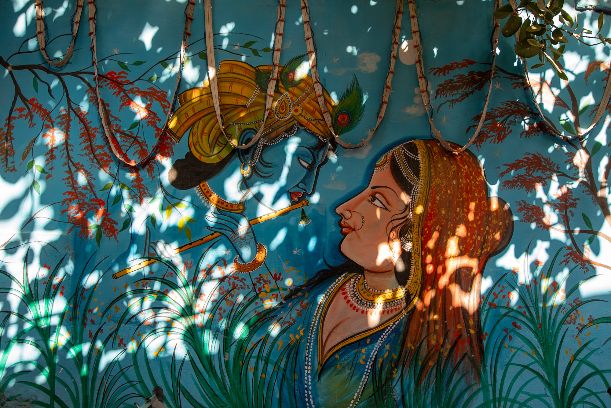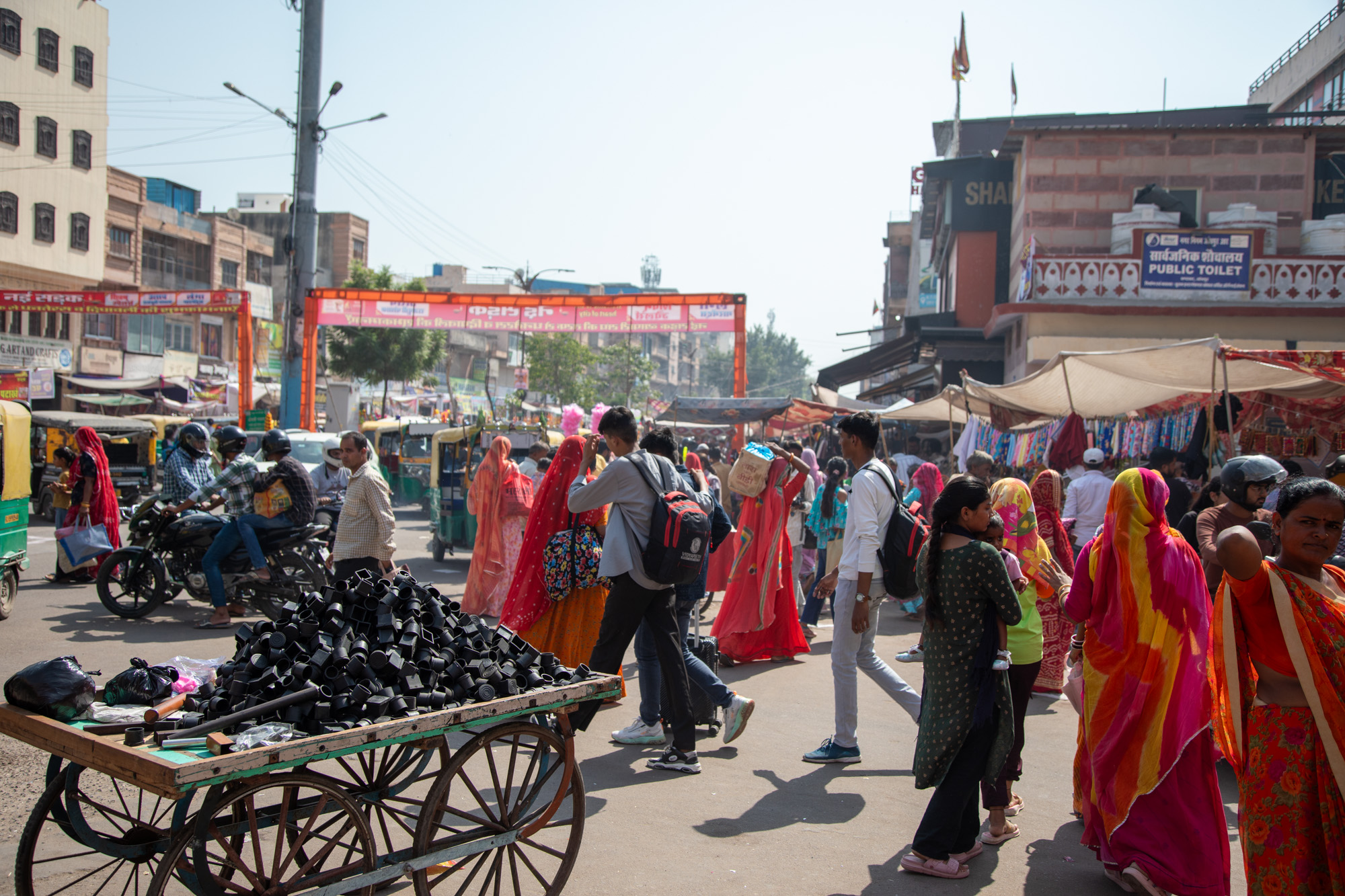 On a bien fait de couper la route depuis Jaipur jusqu’à Jodhpur par une soirée au lac Pushkar. Le taxi que l’on avait réservé pour la course de la veille revient nous chercher le matin pour la deuxième partie du trajet jusqu’à la ville bleue. La route est monotone, c’est plat et aride et un peu long, on en profite pour se reposer car les nuits sont souvent perturbées en Inde par le bruit. Avec Diwali qui approche, il y a beaucoup de jeunes qui jouent avec des pétards la nuit et c’est pas le même genre de pétards que l’on trouve en France, le bruit est terriblement puissant et nous réveille plusieurs fois. On arrive en milieu d’après mid à Jodhpur et depuis la route on ne peut pas manquer la vue sur la forteresse de Mehrangarh qui domine l’horizon. Construite sur un piton rocheux, l’immense palais a des dimensions incroyables. La ville de Jodhpur est plus étendue que l’on pensait, c’est en fait la deuxième ville de la région du Rajasthan après Jaipur et il y a un trafic monstrueux dans les rues de la ville. L’animation des rues est comme on l’imaginait avant notre voyage en Inde, de la foule, des voitures, des rickshaw, des klaxons.On arrive à la place de l’horloge où le taxi est obligé de nous déposer, l’entrée de la vieille ville est interdit, les rues sont trop étroites, il faut finir à pied. On remercie chaleureusement notre chauffeur qui nous a accompagné pendant ces deux trajets entre Jaipur et Pushkar et Pushkar à Jodhpur, on met les sac sur le dos et on pénètre dans la vieille ville par une porte joliment décorée.