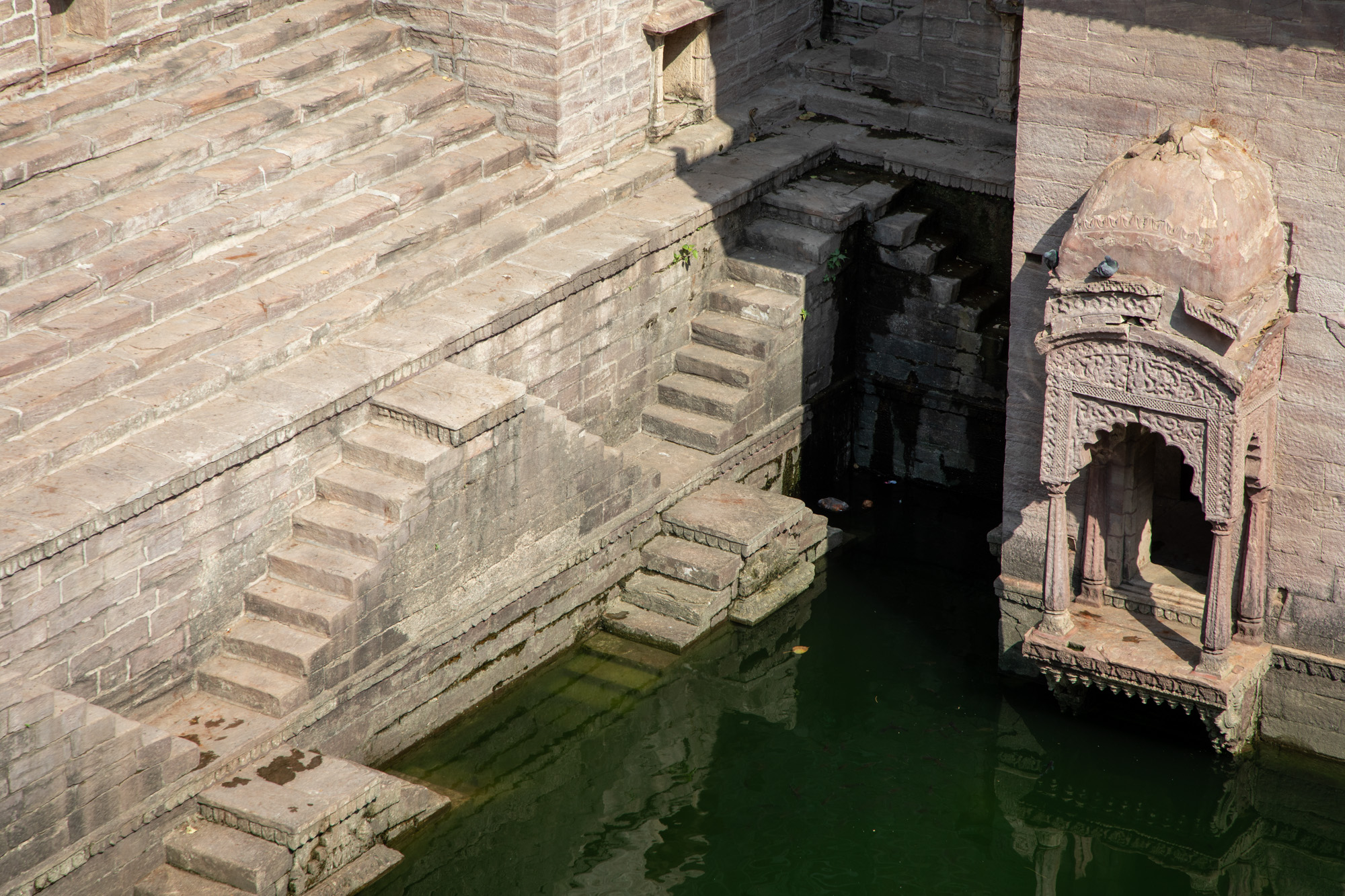 Après deux heures de marche avec les explications, notre guide décide de nous ramener dans le quartier commerçant que l’on avait visité la veille au soir. On est quand même déçu de la façon dont ce tour se passe car finalement sur une bonne partie de la demi journée, il est très insistant pour faire des visites de magasins. Comme on avait déjà fait le tour la veille au soir et que l’on avait déjà fait nos achats, le guide abandonne et on finira la visite par le stepwell de Jodhpur, Toorji Ka Jhalra Bavdi. Différent des autres stepwells que l’on a vu jusqu’à présent, il vaut vraiment le coup d’oeil.