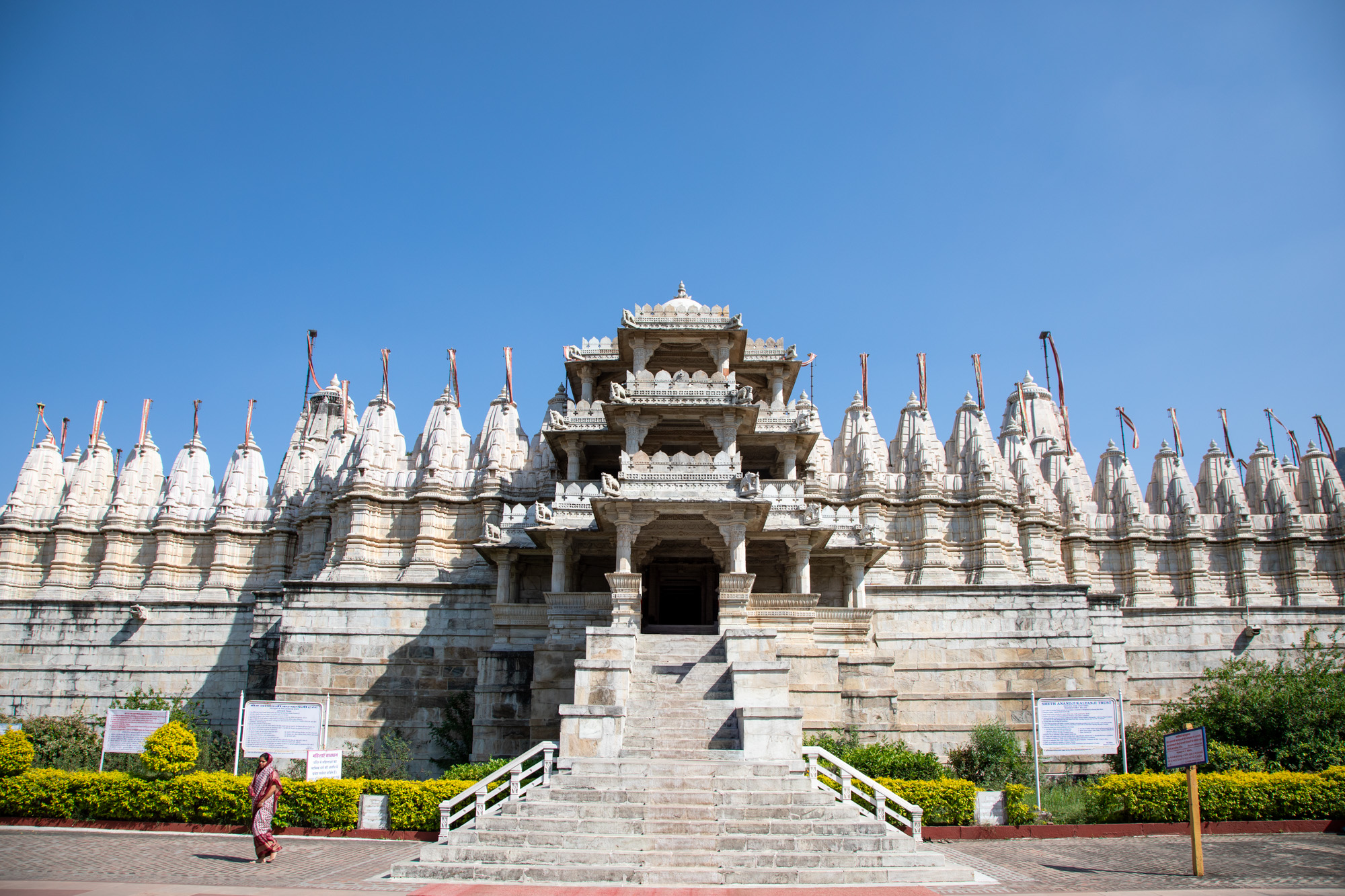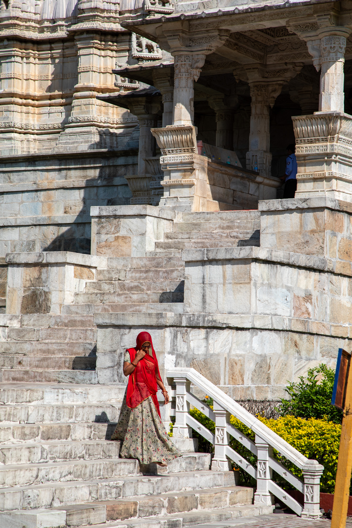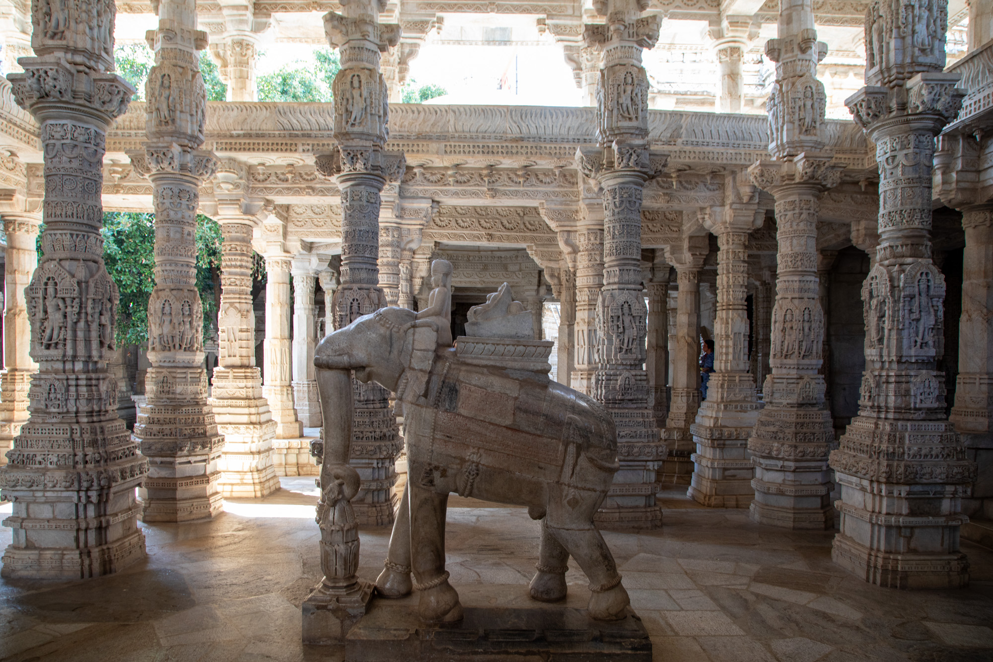 Nous partons en matinée avec un taxi de Jodhpur pour la dernière étape de ce voyage Rajasthan, mais avant de rejoindre la ville lacustre, on fait un détour par le temple Jain de Ranakpur niché au coeur des collines des montagnes Aravalli. La route pour rejoindre le temple quitte la plaine et commence à serpenter dans un paysage sauvages. Une autre Inde défile sous nos yeux, jusqu’à maintenant nous n’avions connu que des villes. On se serait bien arrêté plus longtemps dans ce coin, il y a d’ailleurs plusieurs guesthouses en retrait de la route, et des panneaux mentionnent la possibiité de faire des safari pour voir les animaux sauvages de la réserve de Kumbhalgarh National Park où vit notamment le léopard. On s’arrête dans un restaurant très mignon construit en contrebas de la route, face à une petite rivière où des chèvres broutent. On arrive au temple de Ranakpur en milieu d’après midi, c’est un temple de la religion Jain, différente de ce que l’on a pu voir jusqu’à maintenant. Fait de marbre, le temple est magnifique avec des sculptures somptueuses.
