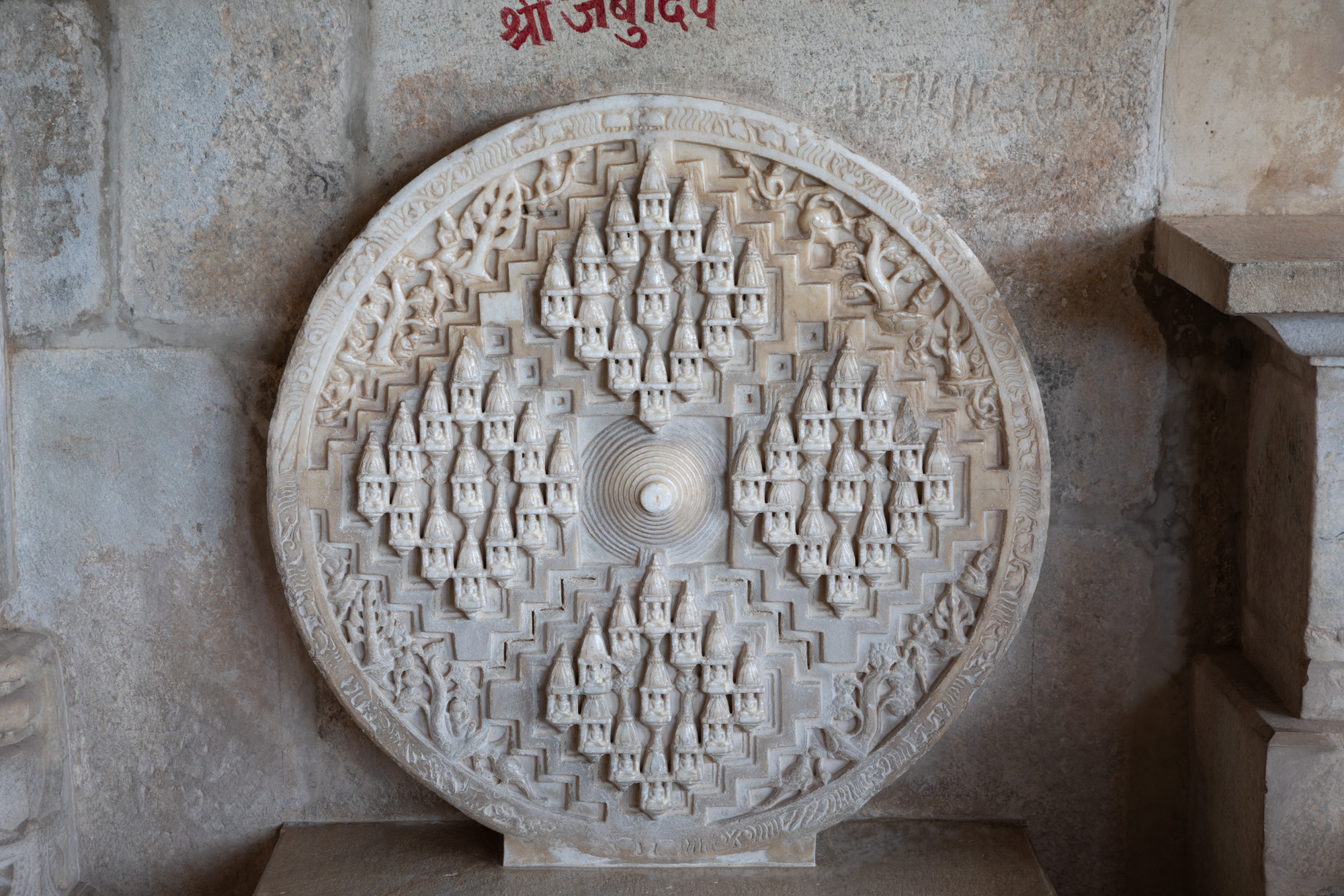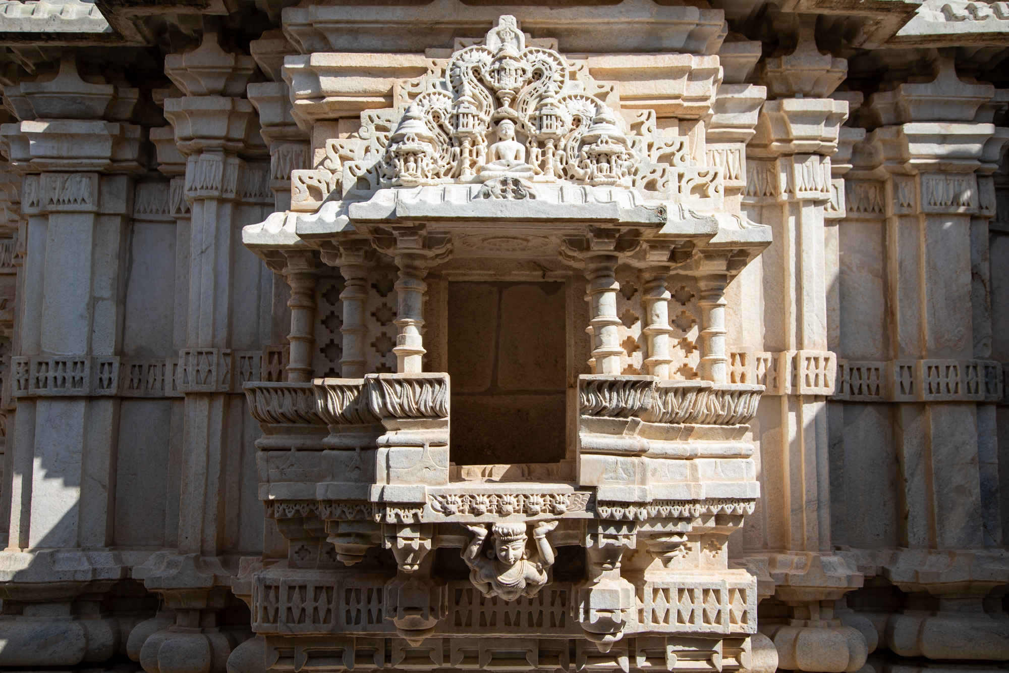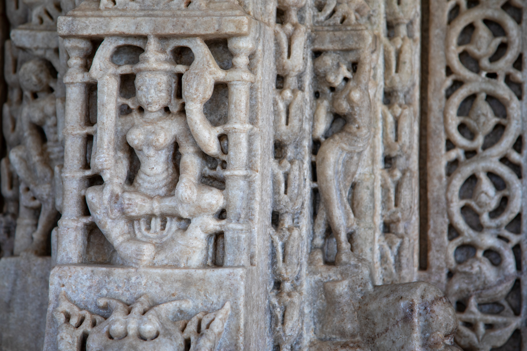 Nous partons en matinée avec un taxi de Jodhpur pour la dernière étape de ce voyage Rajasthan, mais avant de rejoindre la ville lacustre, on fait un détour par le temple Jain de Ranakpur niché au coeur des collines des montagnes Aravalli. La route pour rejoindre le temple quitte la plaine et commence à serpenter dans un paysage sauvages. Une autre Inde défile sous nos yeux, jusqu’à maintenant nous n’avions connu que des villes. On se serait bien arrêté plus longtemps dans ce coin, il y a d’ailleurs plusieurs guesthouses en retrait de la route, et des panneaux mentionnent la possibiité de faire des safari pour voir les animaux sauvages de la réserve de Kumbhalgarh National Park où vit notamment le léopard. On s’arrête dans un restaurant très mignon construit en contrebas de la route, face à une petite rivière où des chèvres broutent. On arrive au temple de Ranakpur en milieu d’après midi, c’est un temple de la religion Jain, différente de ce que l’on a pu voir jusqu’à maintenant. Fait de marbre, le temple est magnifique avec des sculptures somptueuses.