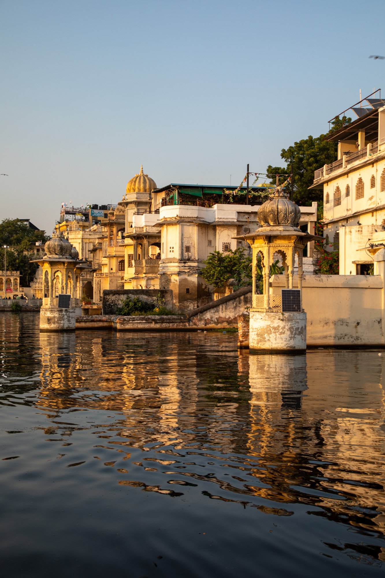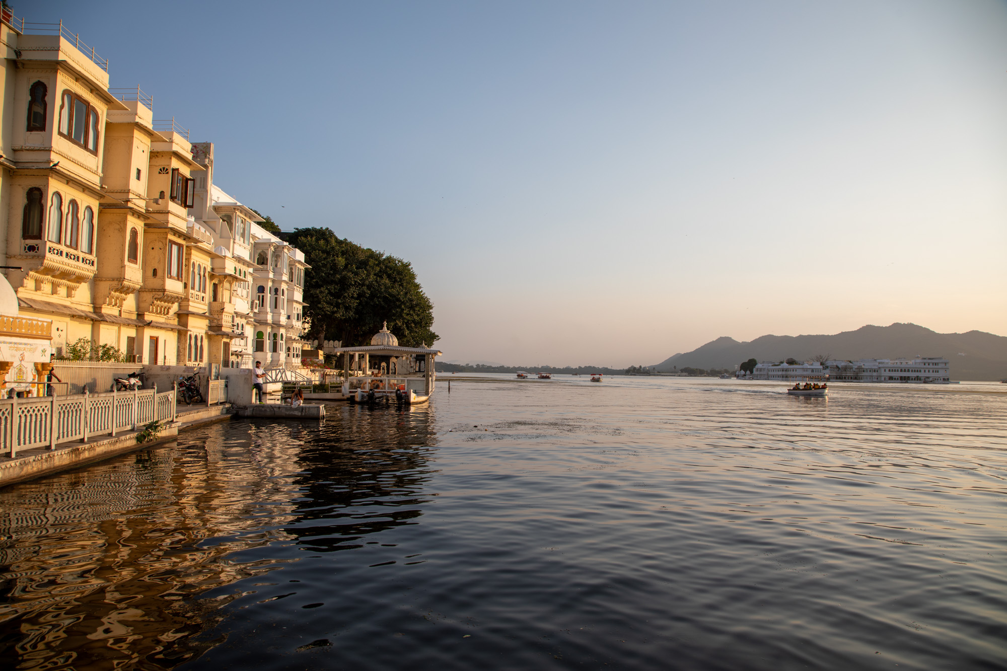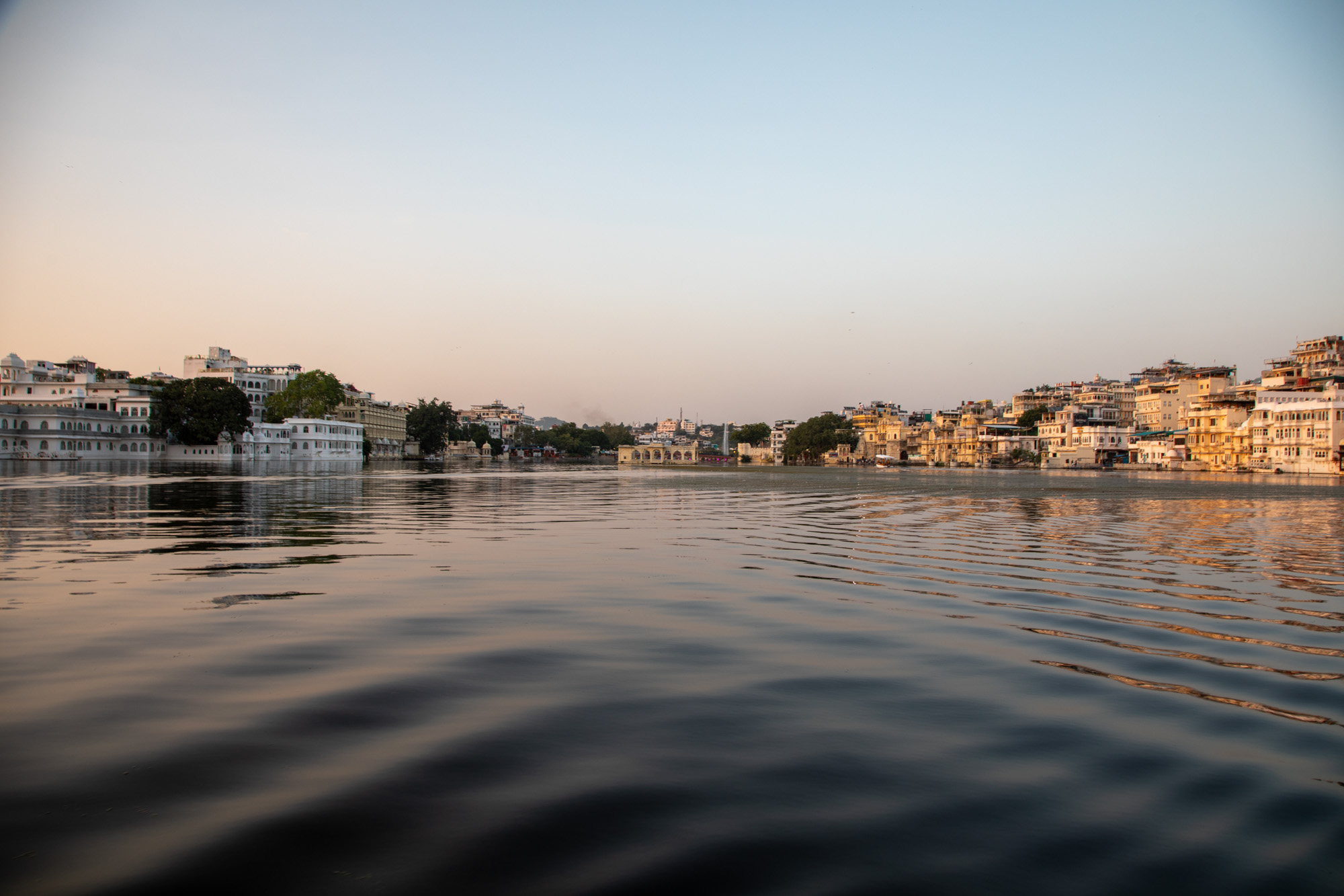 Après la visite du palais, on descend vers le lac et on monte dans un bateau pour faire une balade au coucher du soleil pour avoir une belle lumière chaude. A cette heure-ci, Udaipur révèle un visage tellement romantique.
