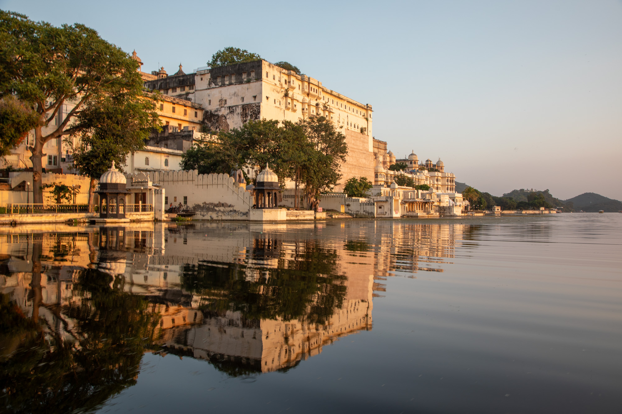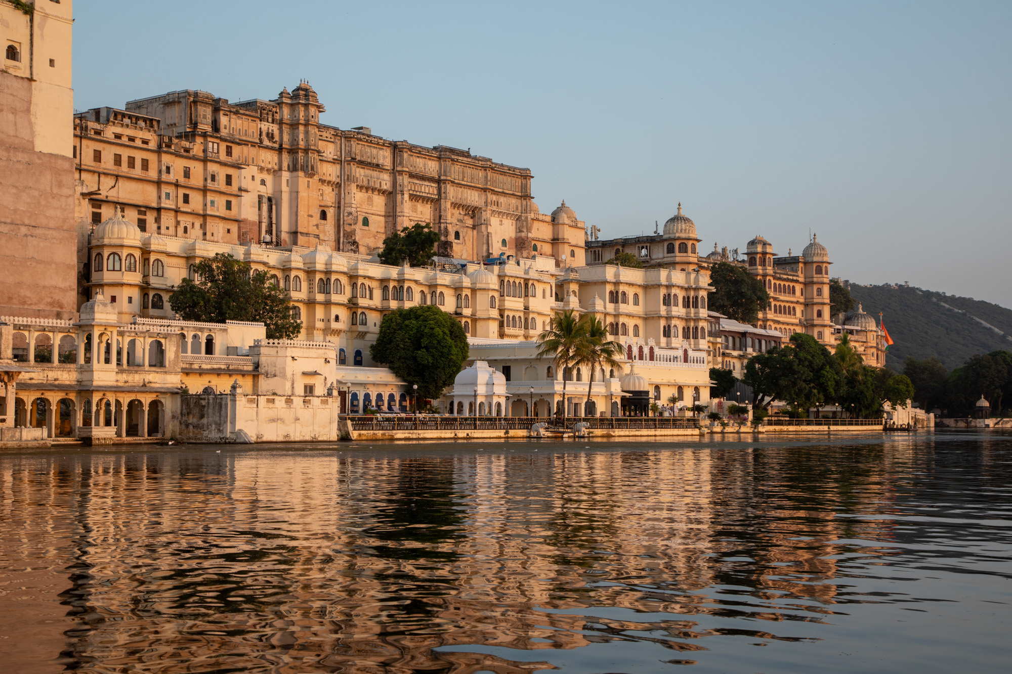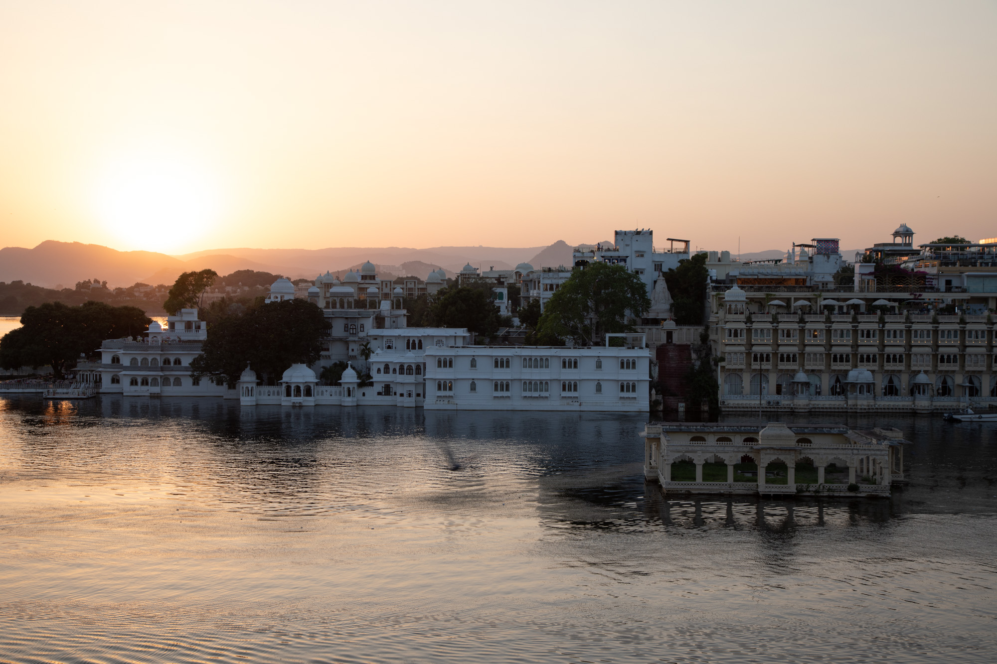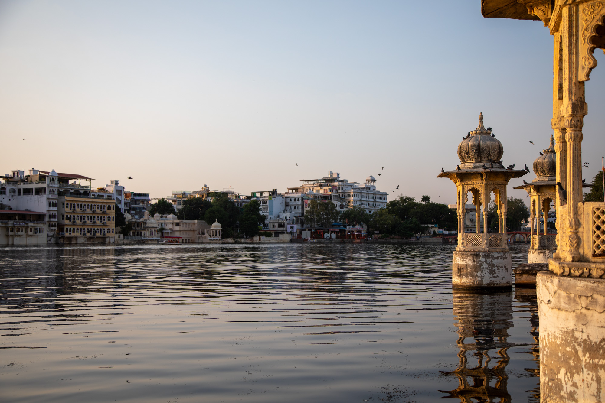 Après la visite du palais, on descend vers le lac et on monte dans un bateau pour faire une balade au coucher du soleil pour avoir une belle lumière chaude. A cette heure-ci, Udaipur révèle un visage tellement romantique.