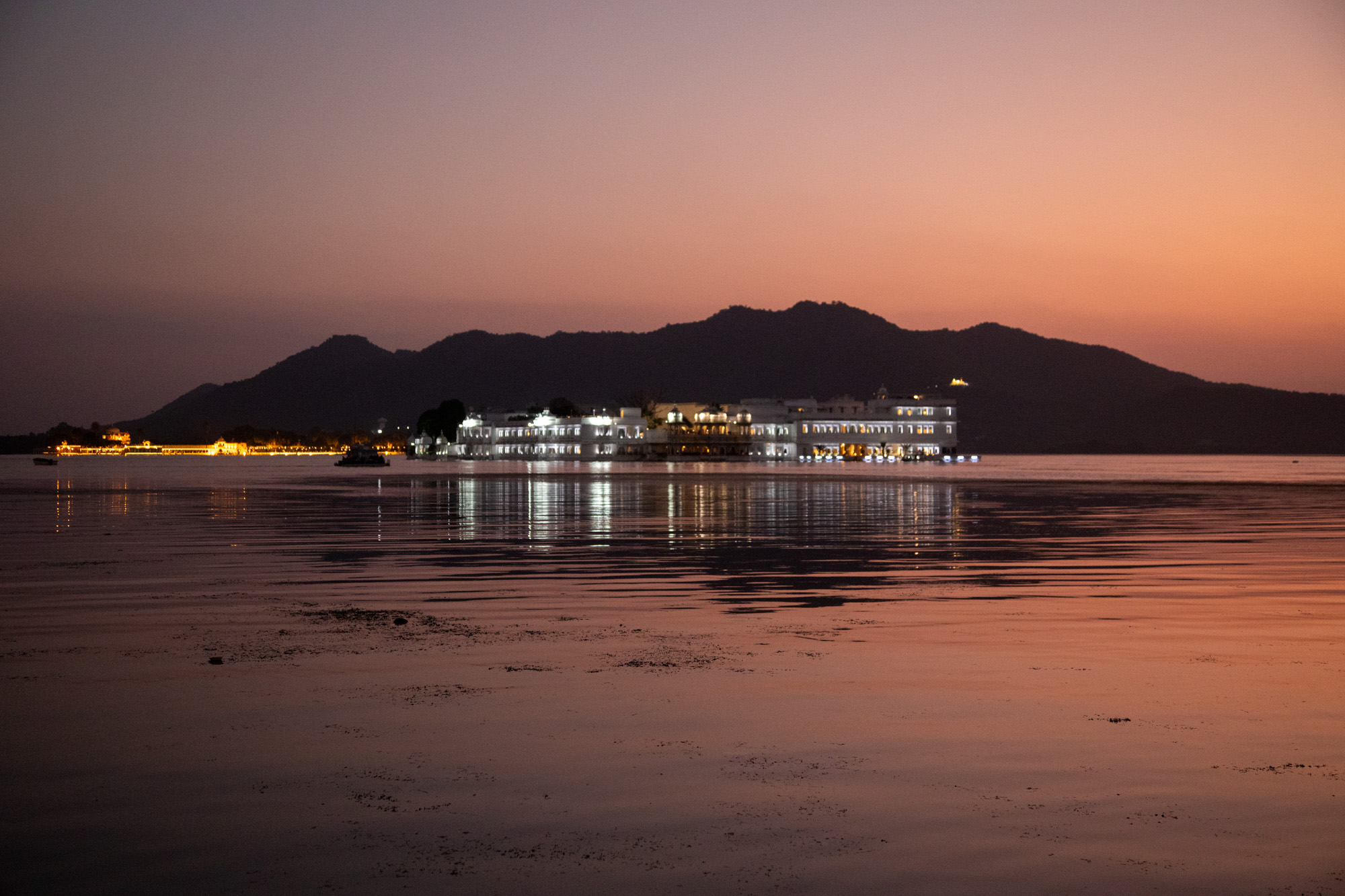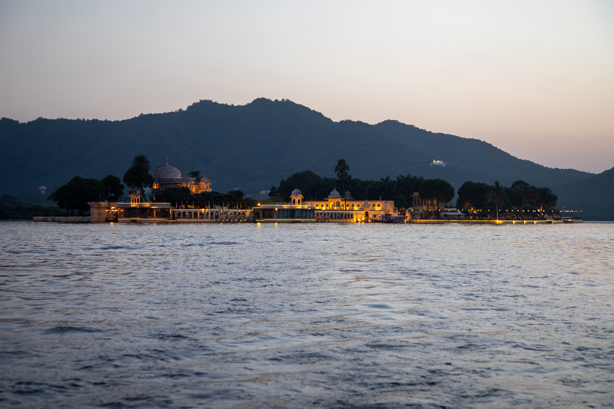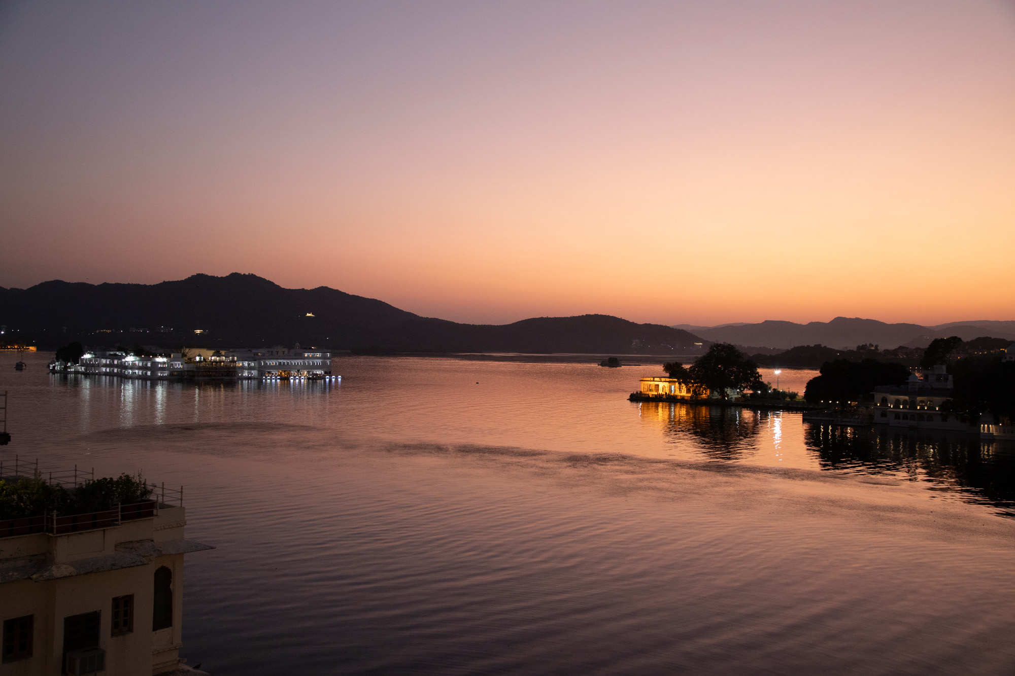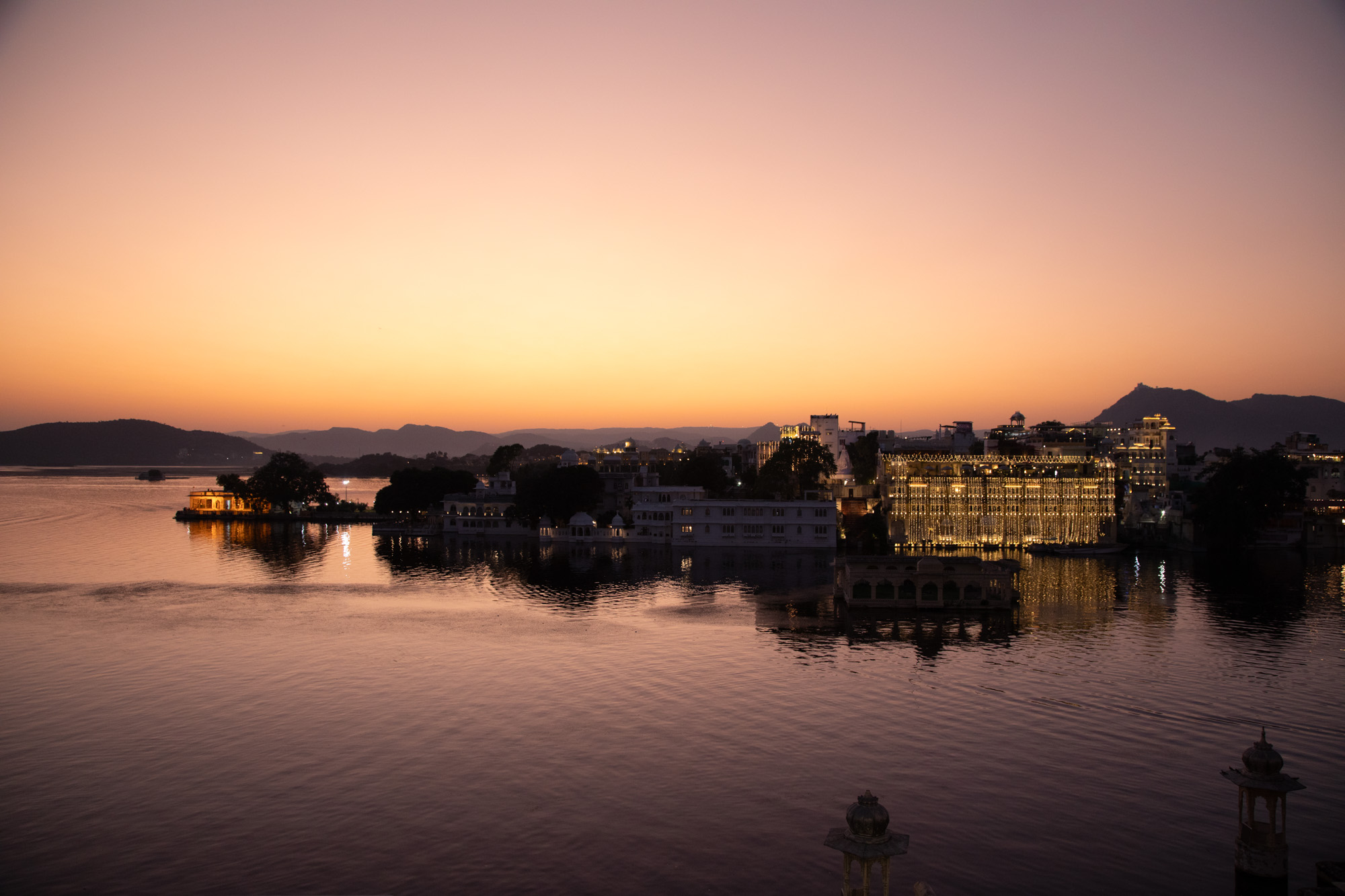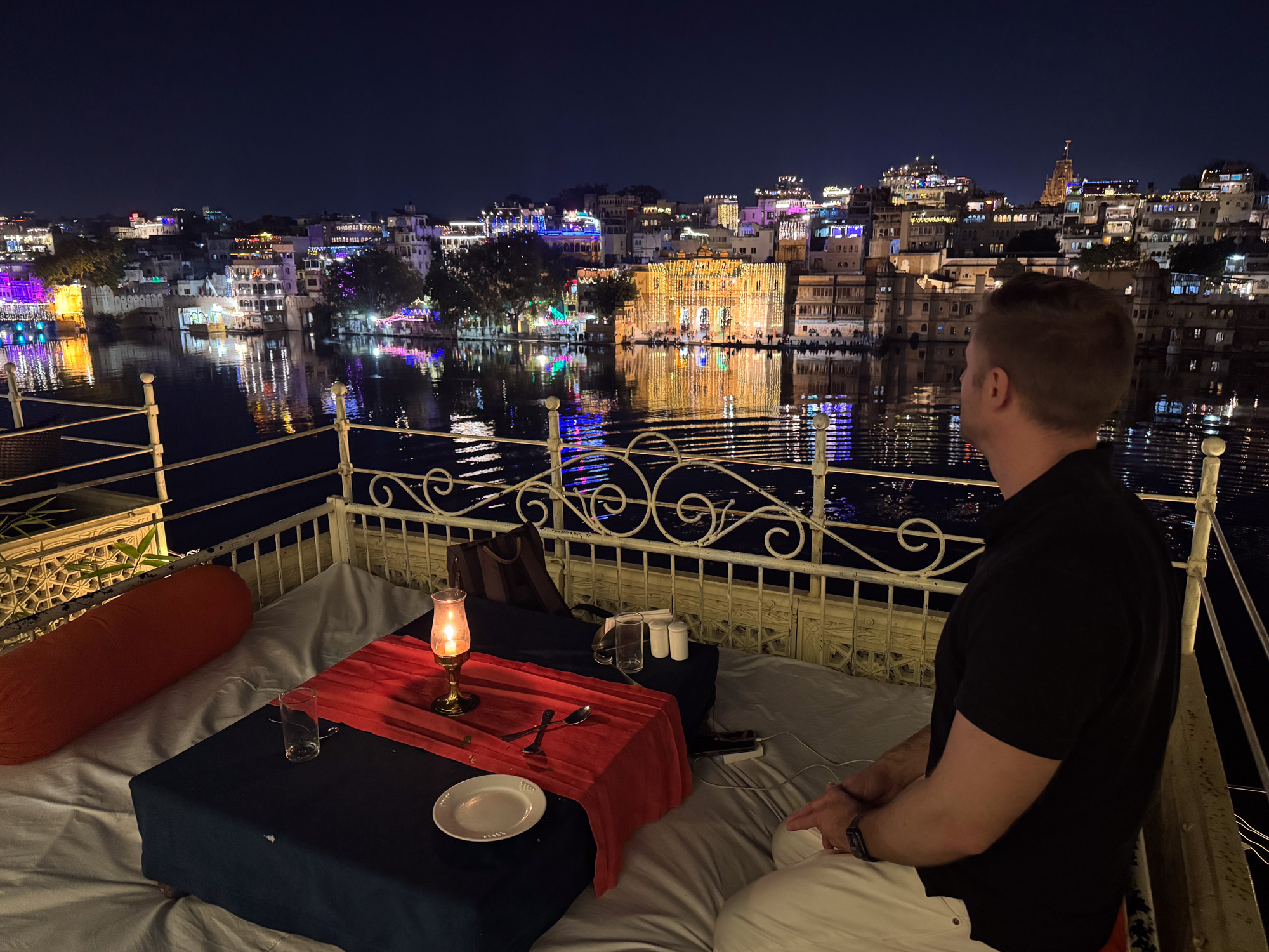 Après le coucher du soleil, les lumières viennent mettre en valeur les batiments qui bordent le lac. Il y a un sens de l'esthétique indénibale à Udaipur, la température a déjà baissé, ce qui fait du bien par rapport à Jodhupr.