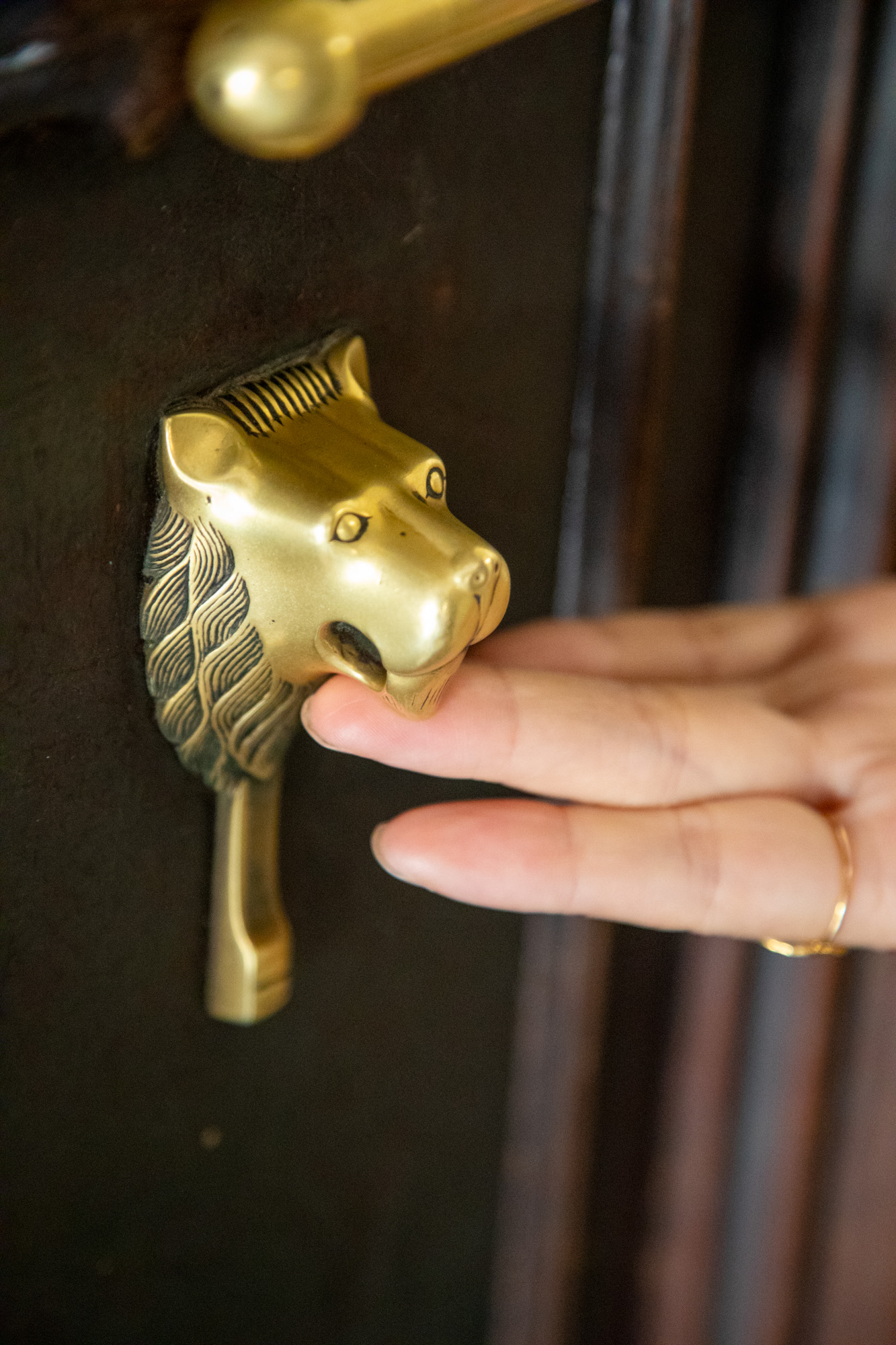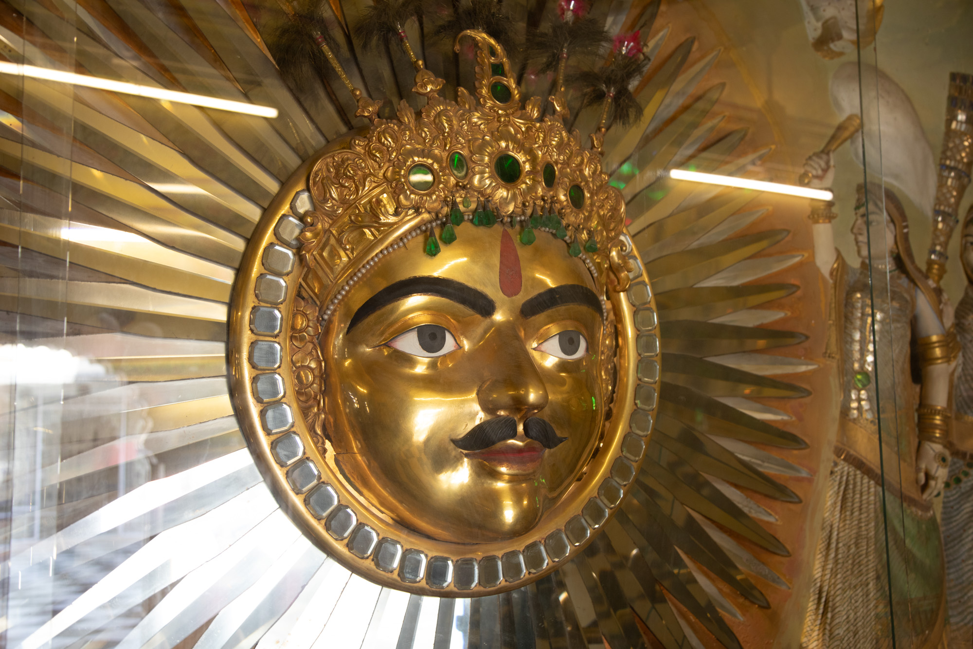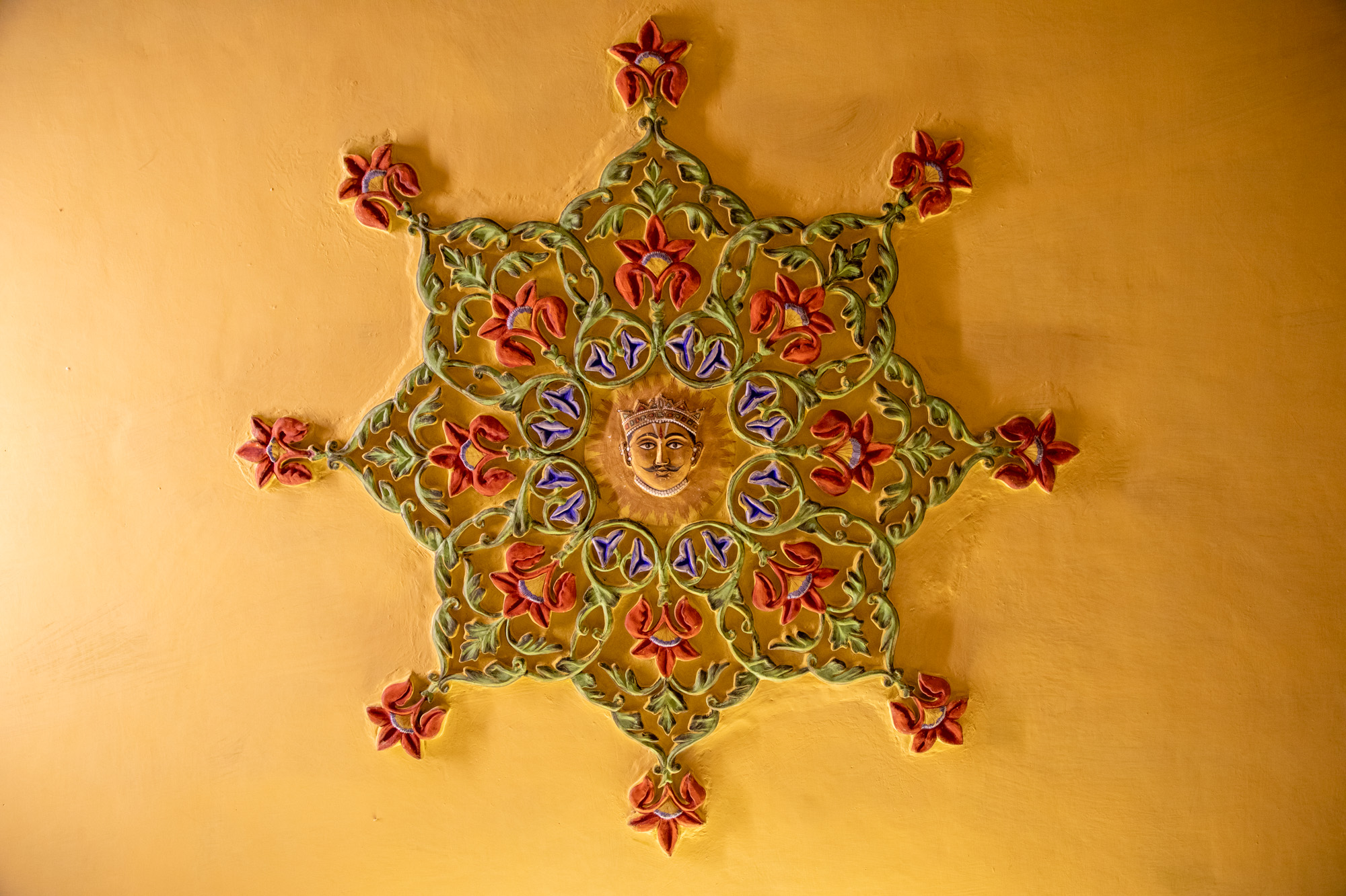 Il y a de symboles royaux disséminées dans les pièces, comme ces poignées de porte en forme de lion, ces masques royaux avec le visage du maharaja dont on n'a surtout pas oublié de dessiner la moustache, les moulures au plafond ont aussi droit à des détails, avec ces fleurs peintes et en son centre de nouveau la tête moustachue du monarque, et bien sur des paons qui sont un des plus beaux symboles de l'Inde.