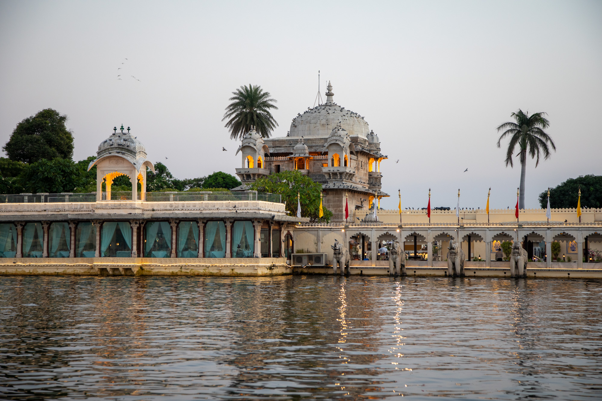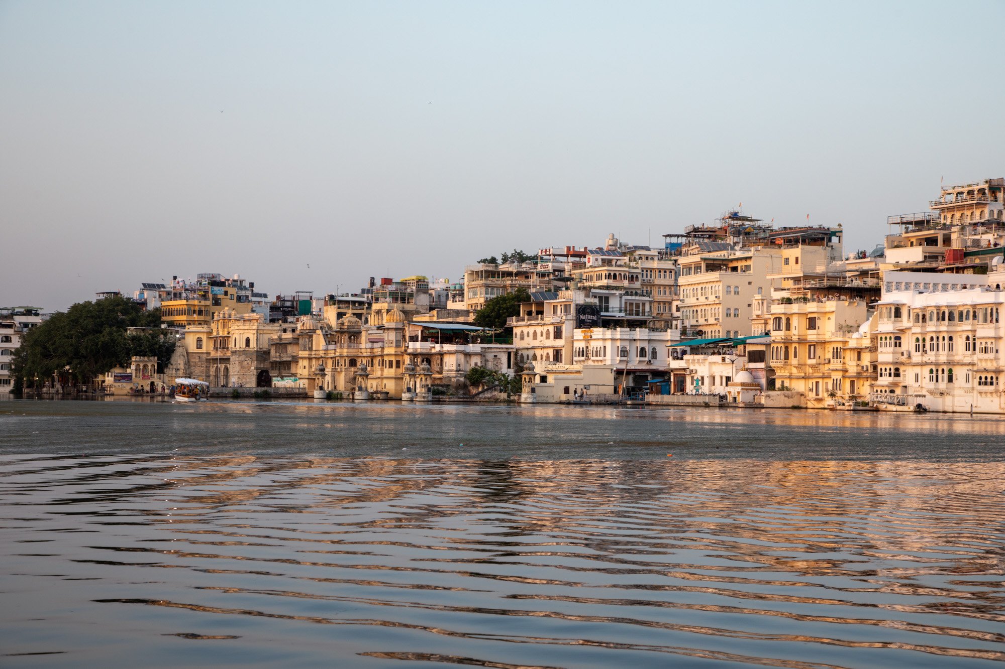 Le bateau fait le tour des principaux monuments, le palais Taj Palace, les ghats, il y a même un héliport pour le maharadja. Une autre île a été transformé en palais avec un restaurant au bord de l’eau très romantique.