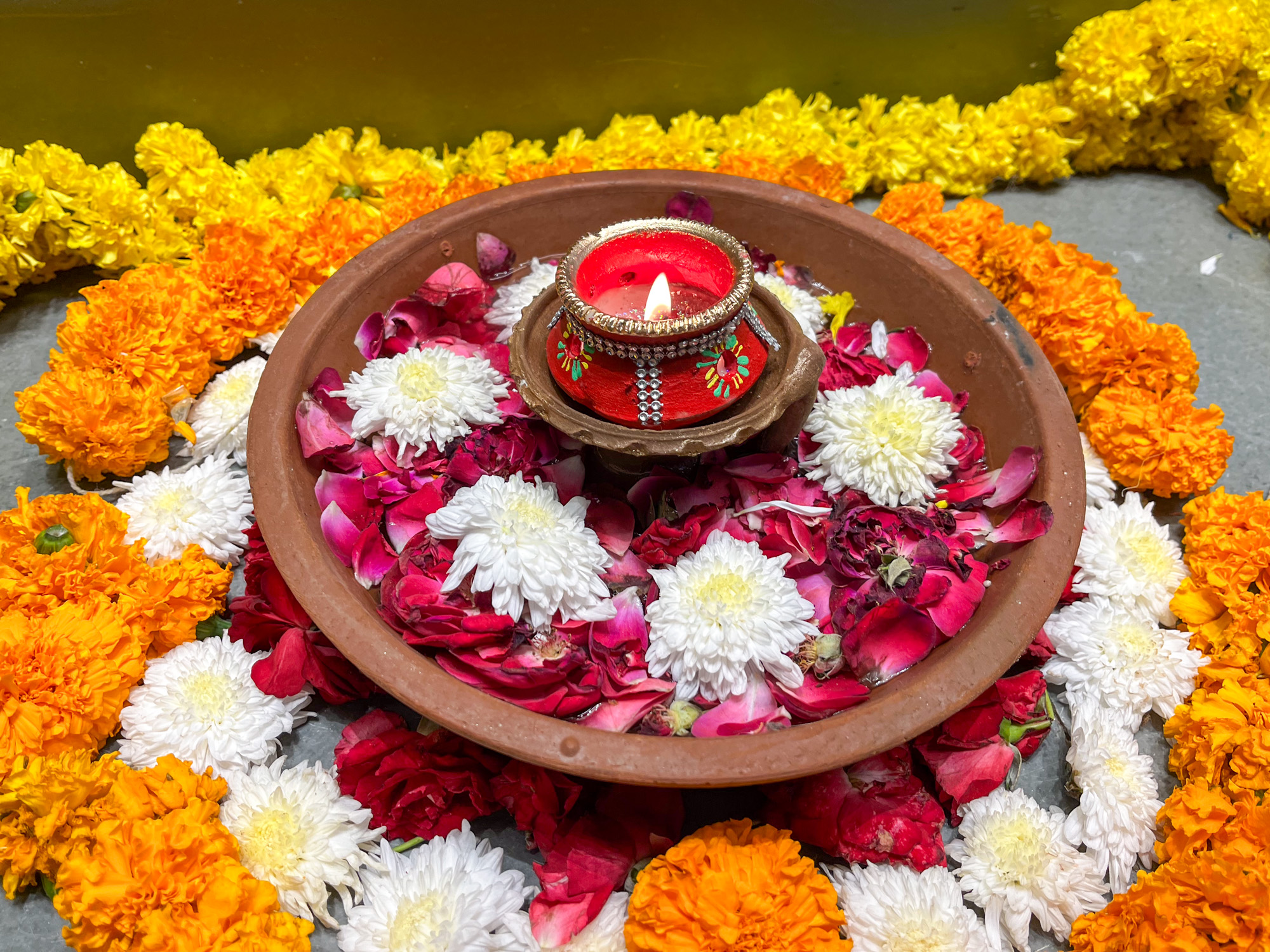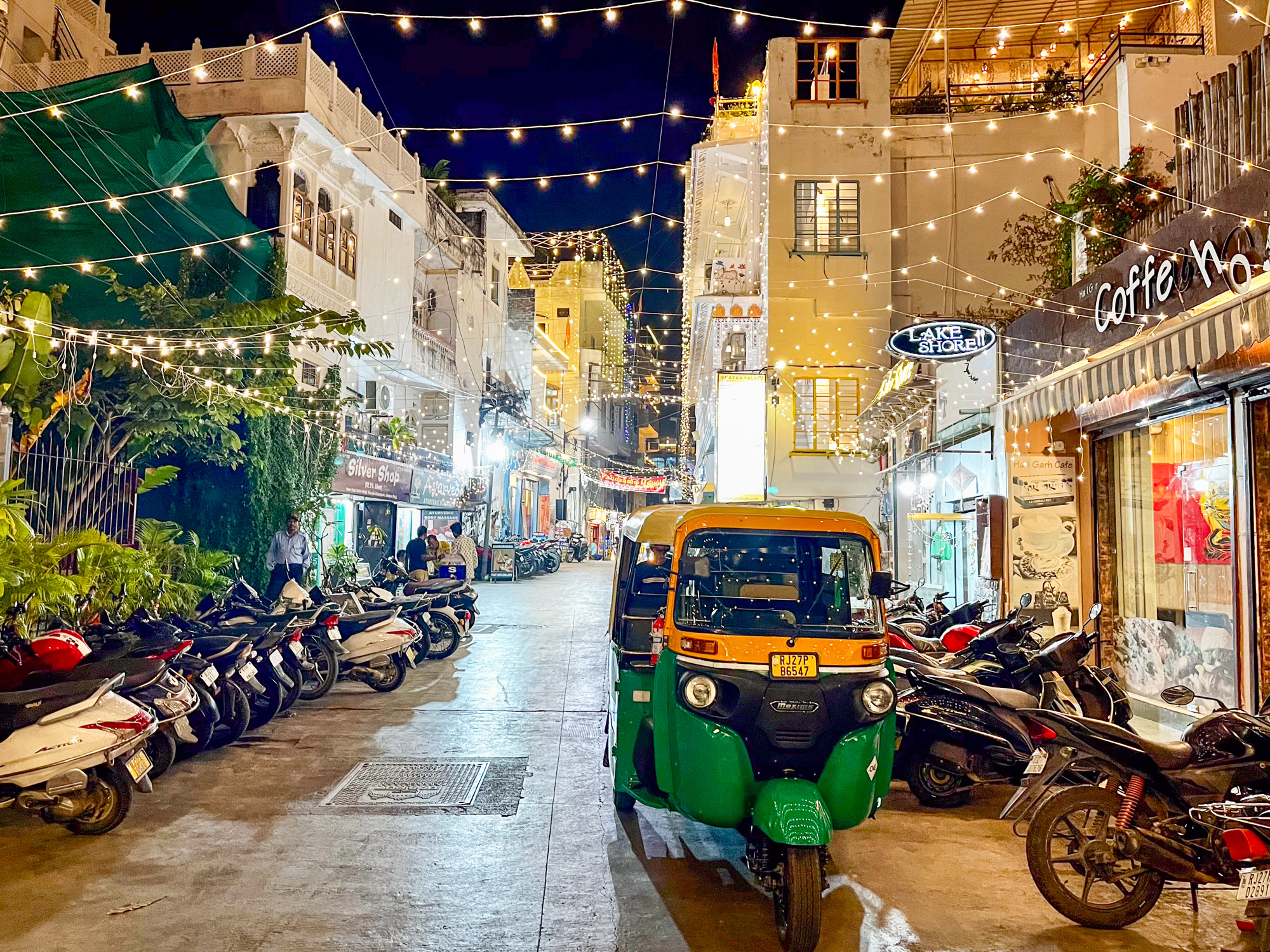 Les rues d’Udaipur sont encore plus belles de nuit avec les lumières de Diwali. On se sent privilégié d’être en Inde pendant la fête. Il y a une ambiance incroyable, les gens ont sorti leurs beaux habits, tout le monde se souhaite un joyeux Diwali, il y a des bougies devant les portes, mais aussi de superbes dessins faits à la craie ou avec des fleurs fraiches.