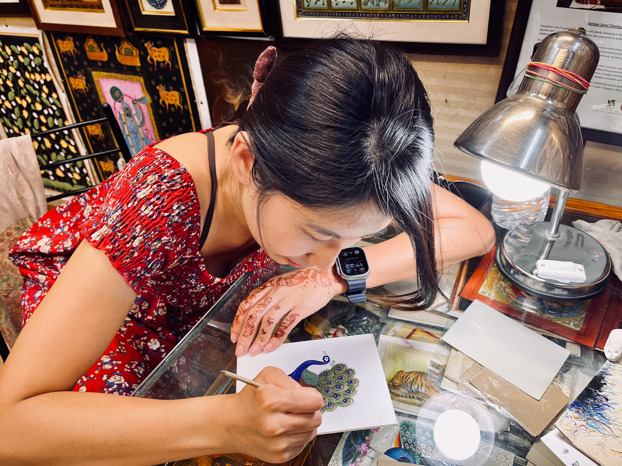 Alors que l’on faisait les boutiques, on tombe sur de jolies peintures accrochées sur la devanture d’une boutique On entre et on fait la connaissance de l’artiste qui est à l’origine de ces très belles oeuvres qui sont une spécialité de la ville d’Udaipur. On est intéressé par la technique, et il nous propose de nous asseoir avec lui pour qu’il nous apprenne les bases de ces dessins miniatures qui dépeignent des animaux, des scènes de la vie royale d’Udaipur et des dieux hindous.