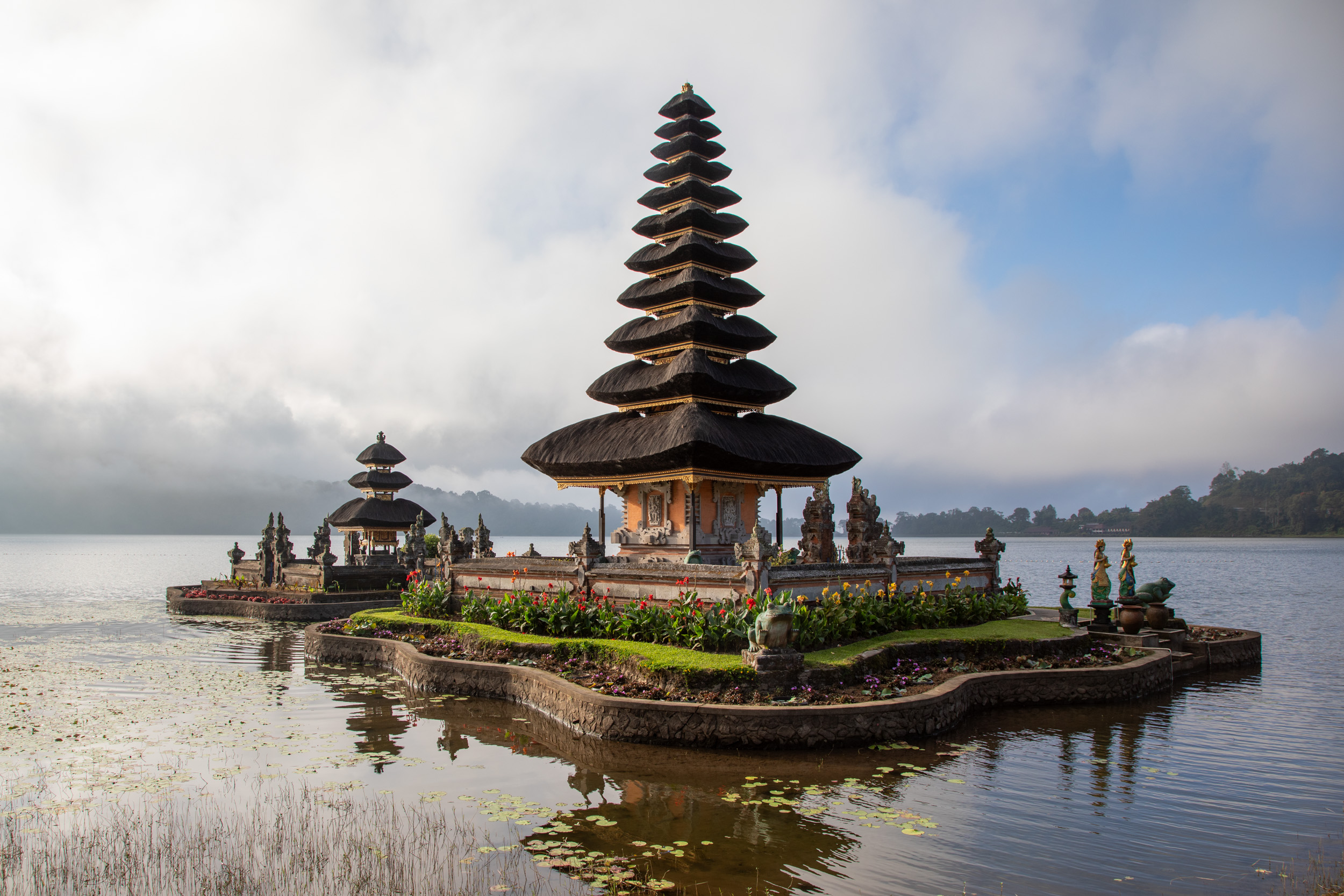 On part en fin de journée d’Amed tout à l’Est de Bali pour rejoindre le village de Munduk, on traverse une grande partie de l’île et on quitte le littoral et sa chaleur moite pour la fraicheur qui vient avec l’altitude. Ce changement de temperature est vraiment surprenant, en sortant de la voiture on enfile une veste pour éviter de prendre froid. Depuis notre hotel, on a une vue magnifique sur les lumières des villages dans la vallée. On mange un repas simple sur place et on règle quelques petits détails d’organisation pour le lendemain, on loue un scooter et on réserve un taxi pour Menjangan en fin de journée. On se rend compte que c’est vraiment facile de voyager à Bali. On se réveille aux aurores car on veut pouvoir profiter à fond de cette journée. Pour moi, c’est une journée que j’attendais avec impatience dans notre itinéraire, car nous allions découvrir le temple de Pura Ulun Danu Beratan, surnommé le temple sur l’eau. Ce temple est construit sur une île dans un lac au milieu d’un cratère d’un volcan éteint, c’est un des symboles de Bali. On veut donc pouvoir en profiter sans la foule, on prévoit d’arriver à l’ouverture. Le trajet en scooter depuis l’hotel puis au bord de la bouche de l’immense cratère du centre de Bali nous congèle, comment l’air peut il être aussi froid sur une île tropicale ? On serre les dents et on arrive parmi les premiers au temple de Pura Ulun Danu Beratan. Il y a encore personne sur le parking, même pas de gardien pour nous donner un ticket, on gare le scooter à la première place. On arrive sur le site et on arrive directement face au temple qui est posé sur l’eau, la brume créée par le lac recouvre encore les montagnes autour donnant une lumière très douce, c’est magique.