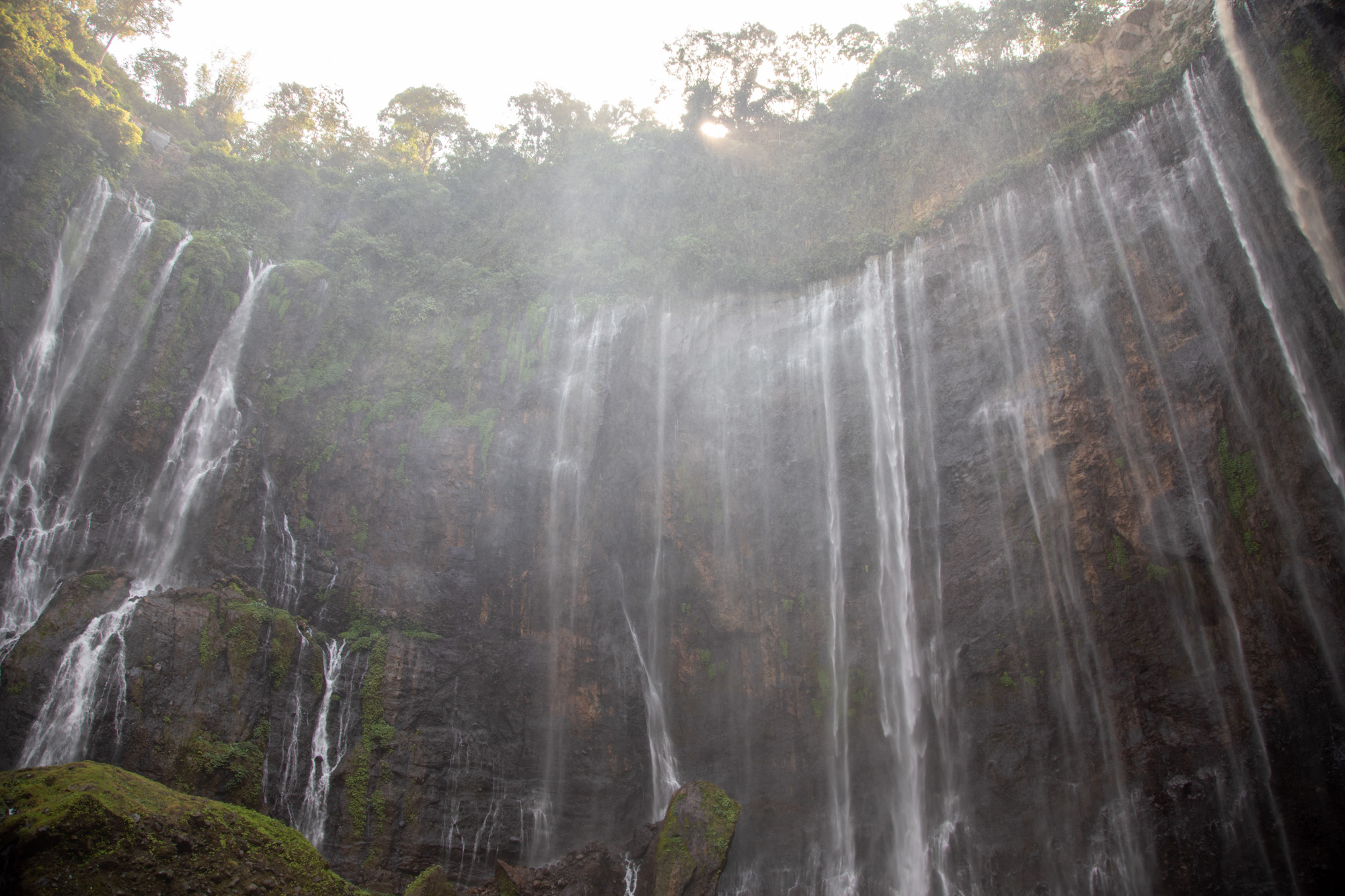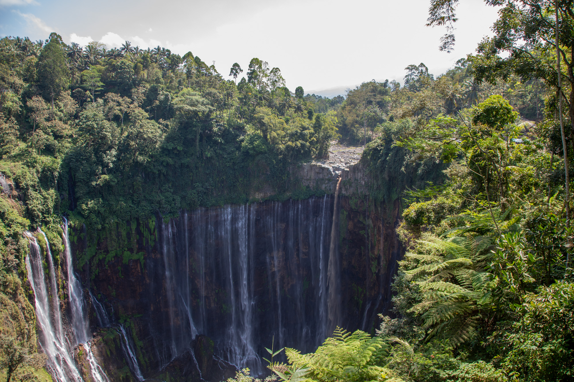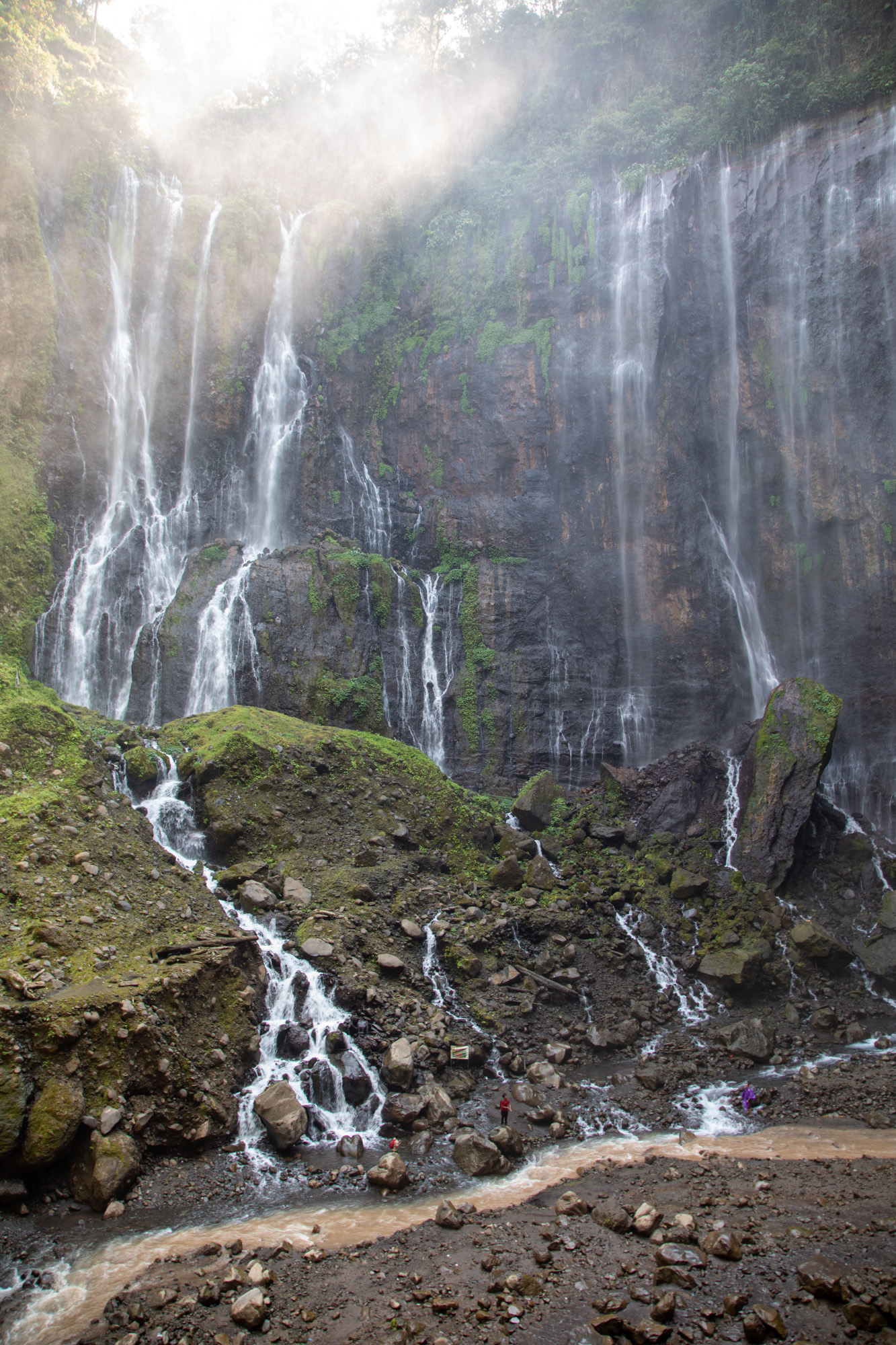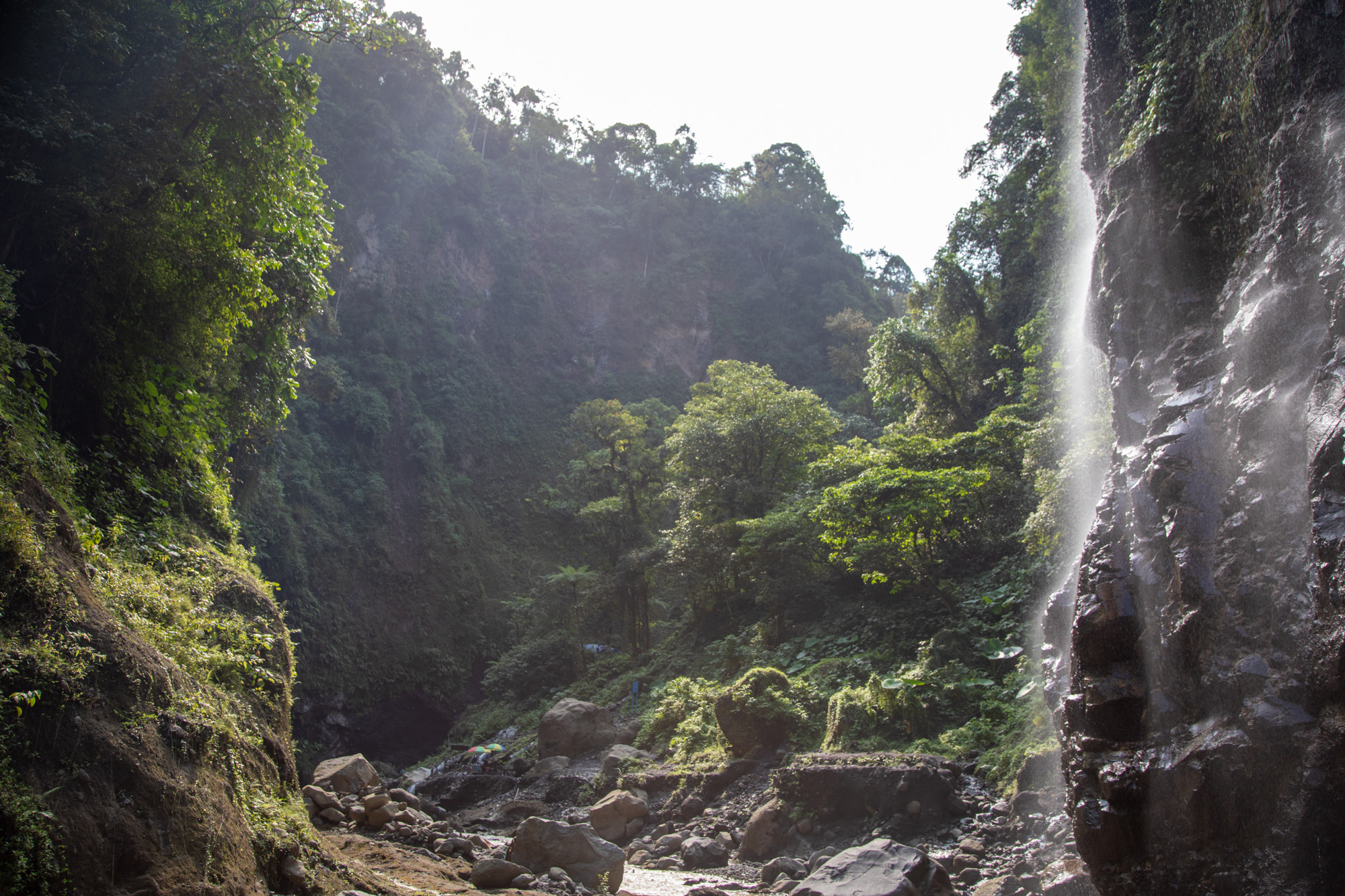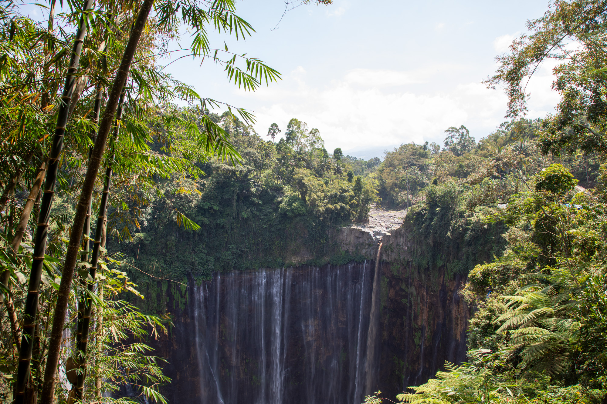 On a vraiment aimé ce petit séjour citadin à Malang. Déjà, cela faisait du bien de dormir dans un bon lit et de manger un bon petit déjeuner diversifié. On a aussi pu trouver une laundry pour tenter de récupérer les couleurs originales de nos vêtements et chaussures après notre journée à Bromo. On reste donc deux jours dans cette ville à l’atmosphère très provinciale, entourée de volcans calmes ou actifs dont notamment le volcan Semeru que l’on voit cracher un nuage de fumée de manière régulière depuis la chambre d’hôtel. Il y a pas mal d’activités à faire autour de Malang, c’est une base intéressante, on décide de réserver un taxi auprès d’une agence à côté de l’hôtel pour nous amener aux cascades de Sewu, à 60 kilomètres ou deux heures de la ville. Le taxi vient nous chercher de bonne heure, et on embarque pour un trajet magnifique dans une région rurale, il y a des plantations, des villages, sous l’ombrage permanent du volcan Semuru. Cette zone a été développée il y a peu pour le tourisme, les cascades de Sewu font partie des trois joyaux de l’Est de Java incontournables, avec le volcan Bromo et le volcan Ijen. Mais il existe d’autres trésors à découvrir, d’autres cascades très belles, et des vues sur le volcan Semuru depuis les villages alentours. On se dit que si on a le temps, on pourra y faire après la visite de la cascade. On arrive en fin de matinée sur le site et un guide vient nous trouver pour nous amener aux chutes qui se trouvent au fond d’une crevasse. On arrive d’abord à un panorama d’où on domine les cascades d’en haut, on est arrivé un peu tard et les nuages recouvrent déjà le sommet du volcan qui est pourtant juste dans l’axe derrière la cascade.