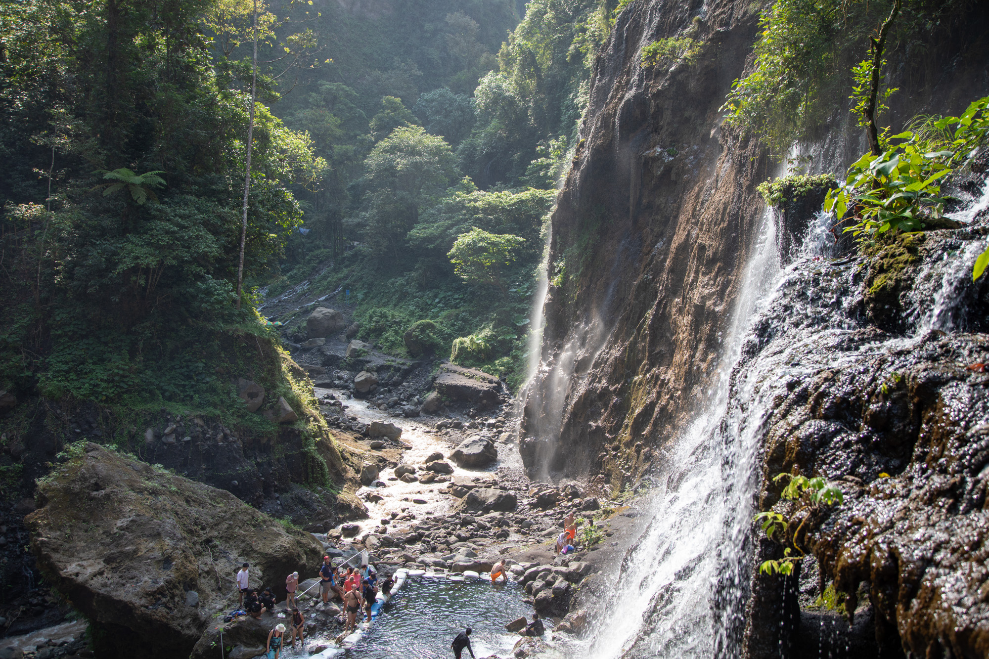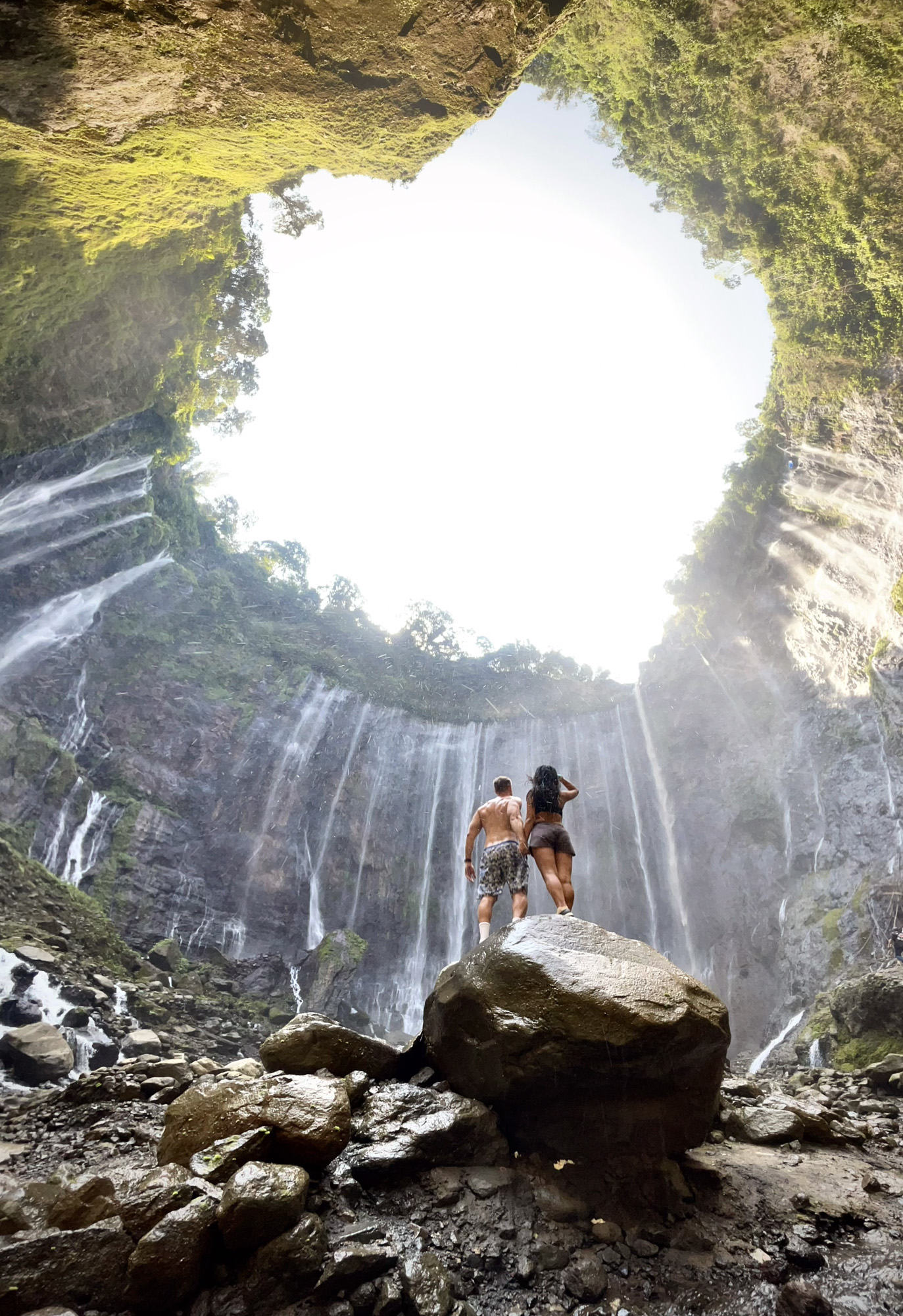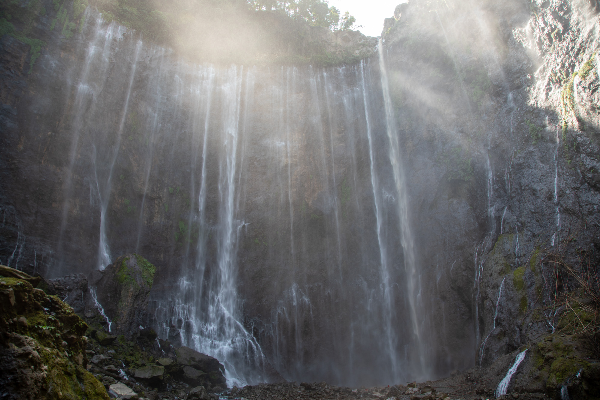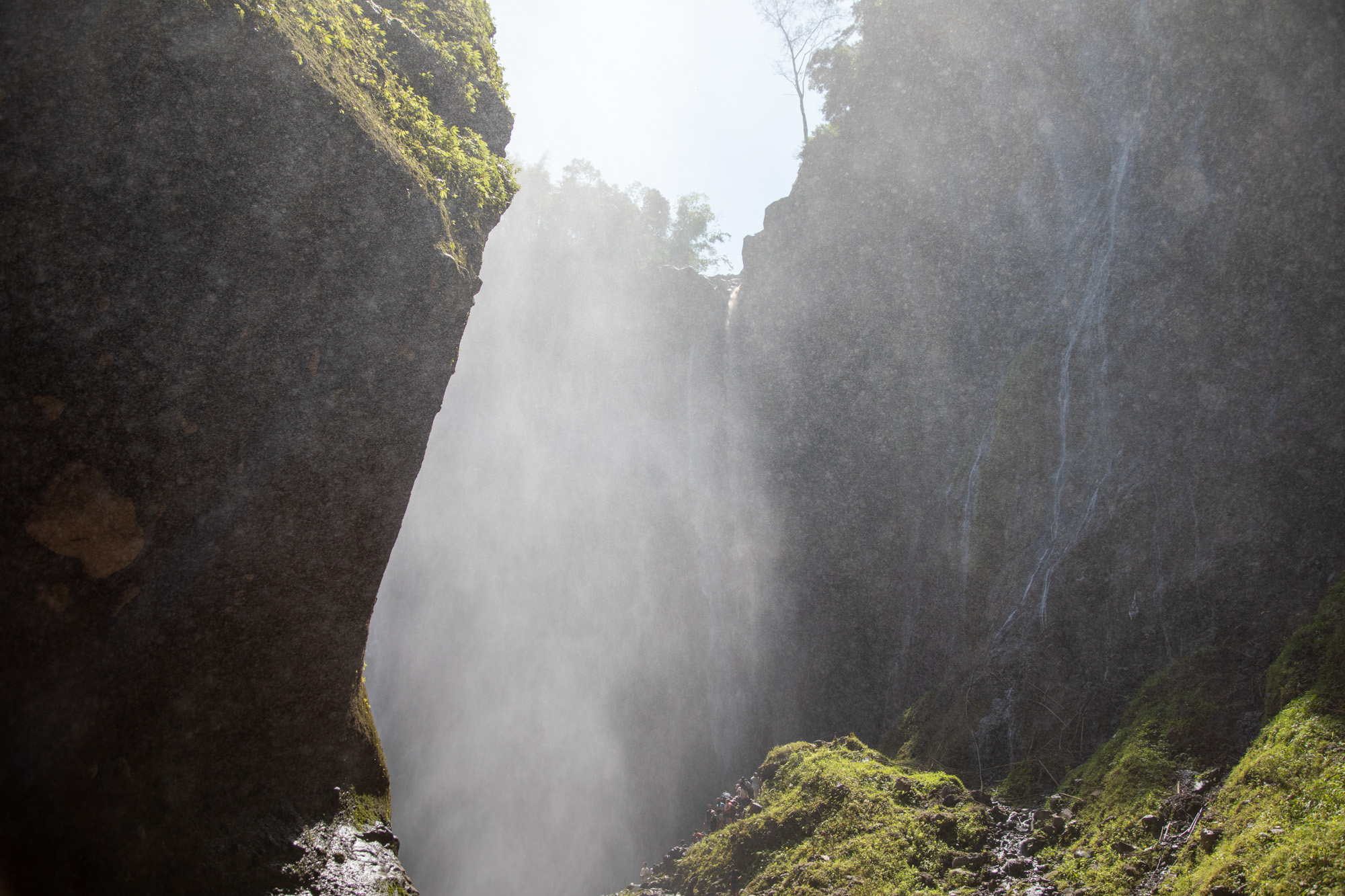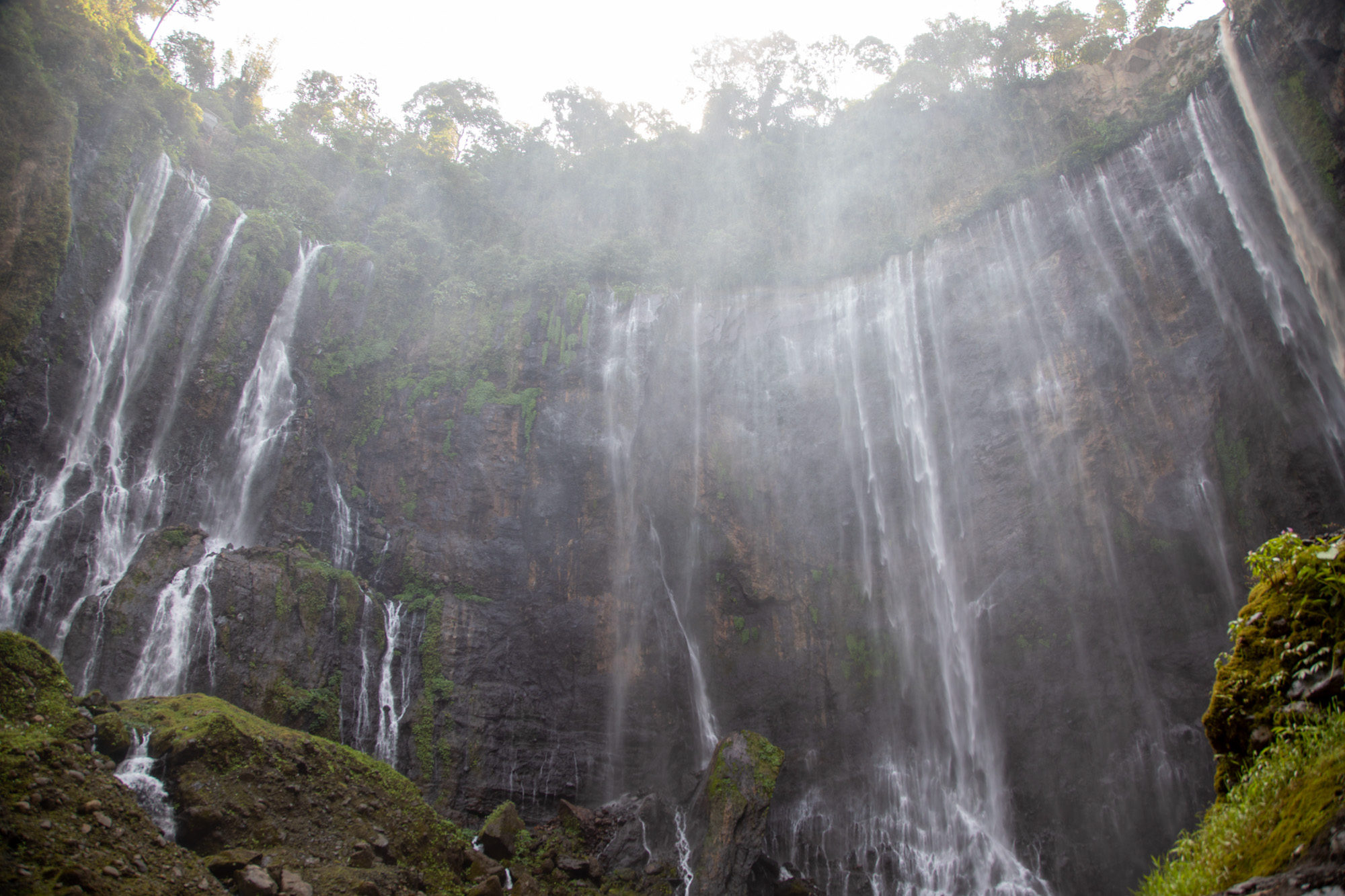 On a vraiment aimé ce petit séjour citadin à Malang. Déjà, cela faisait du bien de dormir dans un bon lit et de manger un bon petit déjeuner diversifié. On a aussi pu trouver une laundry pour tenter de récupérer les couleurs originales de nos vêtements et chaussures après notre journée à Bromo. On reste donc deux jours dans cette ville à l’atmosphère très provinciale, entourée de volcans calmes ou actifs dont notamment le volcan Semeru que l’on voit cracher un nuage de fumée de manière régulière depuis la chambre d’hôtel. Il y a pas mal d’activités à faire autour de Malang, c’est une base intéressante, on décide de réserver un taxi auprès d’une agence à côté de l’hôtel pour nous amener aux cascades de Sewu, à 60 kilomètres ou deux heures de la ville. Le taxi vient nous chercher de bonne heure, et on embarque pour un trajet magnifique dans une région rurale, il y a des plantations, des villages, sous l’ombrage permanent du volcan Semuru. Cette zone a été développée il y a peu pour le tourisme, les cascades de Sewu font partie des trois joyaux de l’Est de Java incontournables, avec le volcan Bromo et le volcan Ijen. Mais il existe d’autres trésors à découvrir, d’autres cascades très belles, et des vues sur le volcan Semuru depuis les villages alentours. On se dit que si on a le temps, on pourra y faire après la visite de la cascade. On arrive en fin de matinée sur le site et un guide vient nous trouver pour nous amener aux chutes qui se trouvent au fond d’une crevasse. On arrive d’abord à un panorama d’où on domine les cascades d’en haut, on est arrivé un peu tard et les nuages recouvrent déjà le sommet du volcan qui est pourtant juste dans l’axe derrière la cascade.