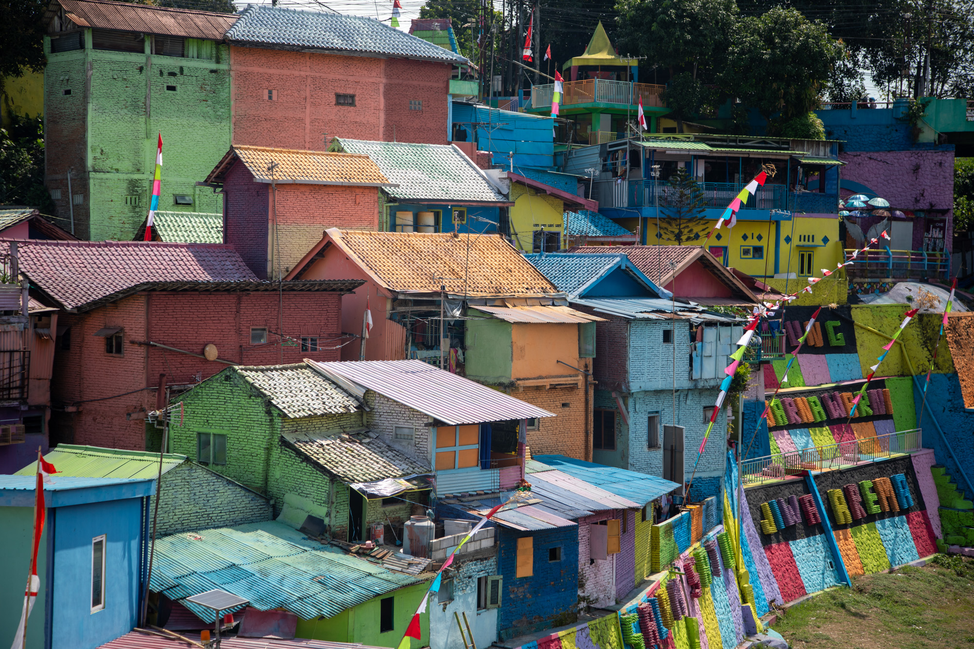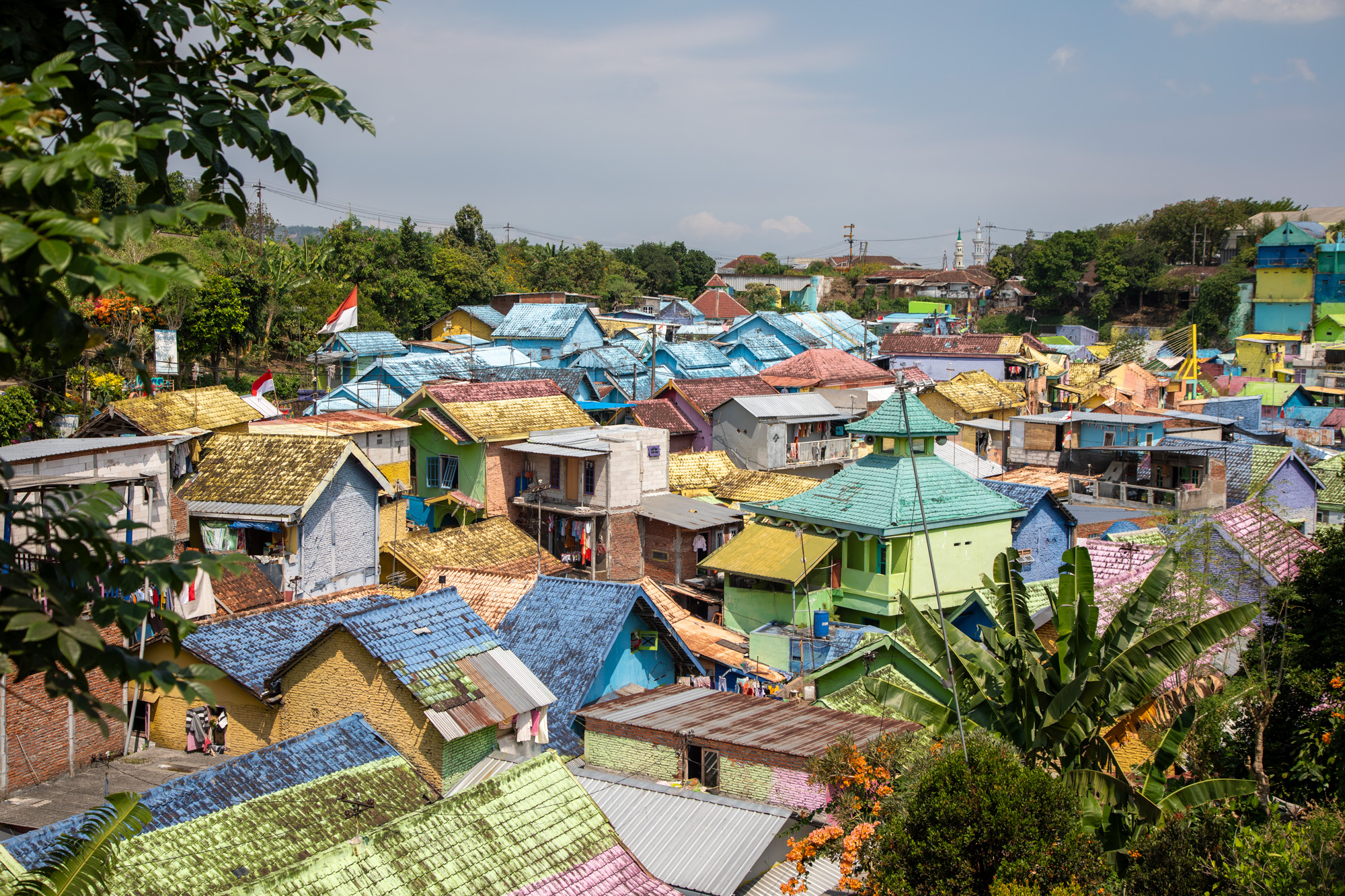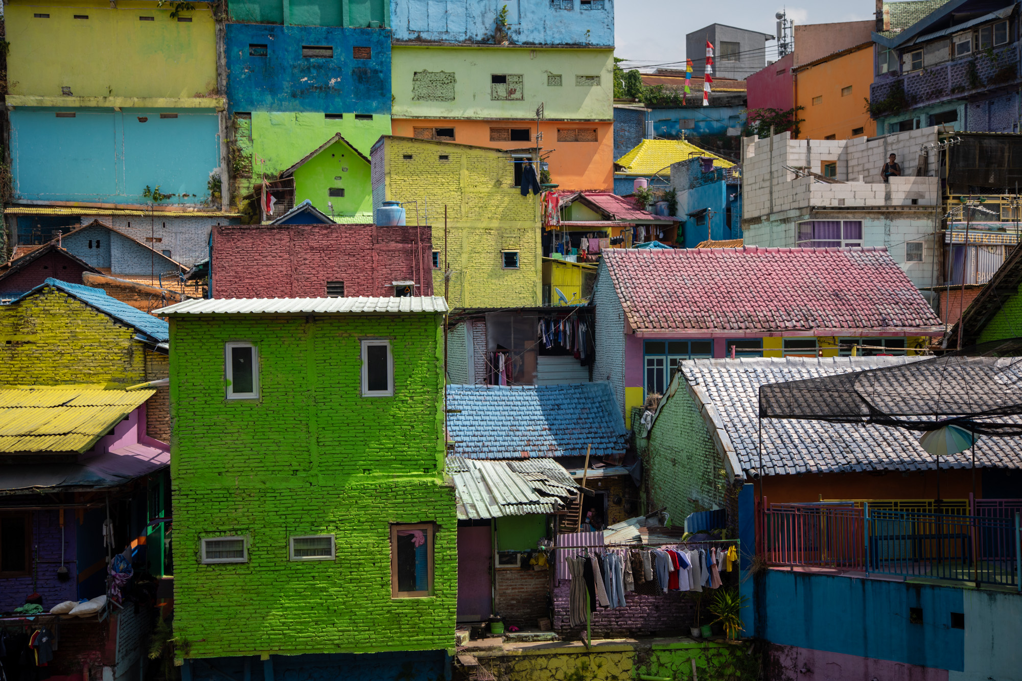 Le lendemain, on doit prendre le train pour Yogyakarta, mais on a plus d’une demi journée à Malang. Le quartier de Jodipan est juste à côté de la gare et il mérite le coup d’oeil. Ce sera parfait pour compléter notre visite de Malang. On récupère d’abord nos billets de train à la borne dans la gare, puis on marche avec nos sacs jusqu’à Jodipan. Il y a environ six cents mètres donc même avec les gros sacs à dos c’est faisable. Il faut payer un ticket d’entrée pour les touristes qui viennent à Jodipan. On demande si on peut leur laisser nos sacs en échange, pas de problème. C’est très gentil de leur part. On s’enfonce dans les ruelles de ce quartier pauvre qui a été revitalisé par des étudiants en école de tourisme.Pour cela, ils ont peint les façades des bâtiments délabrés avec des couleurs pétillantes, afin d’attirer les touristes à venir ici, et cela a marché. Maintenant Jodipan est l’attraction principale de Malang.