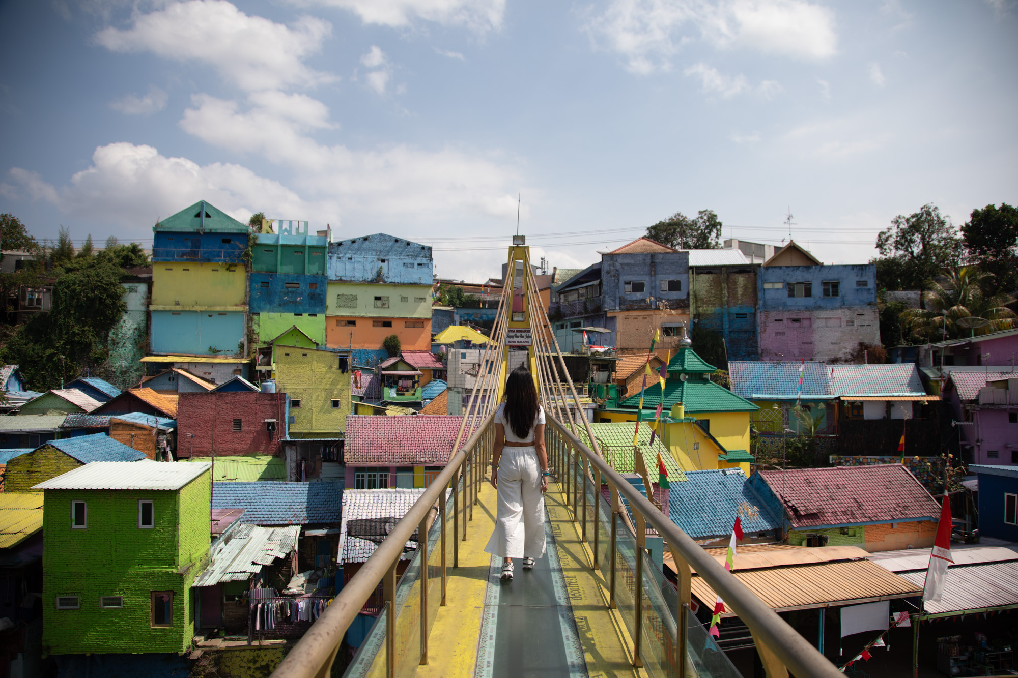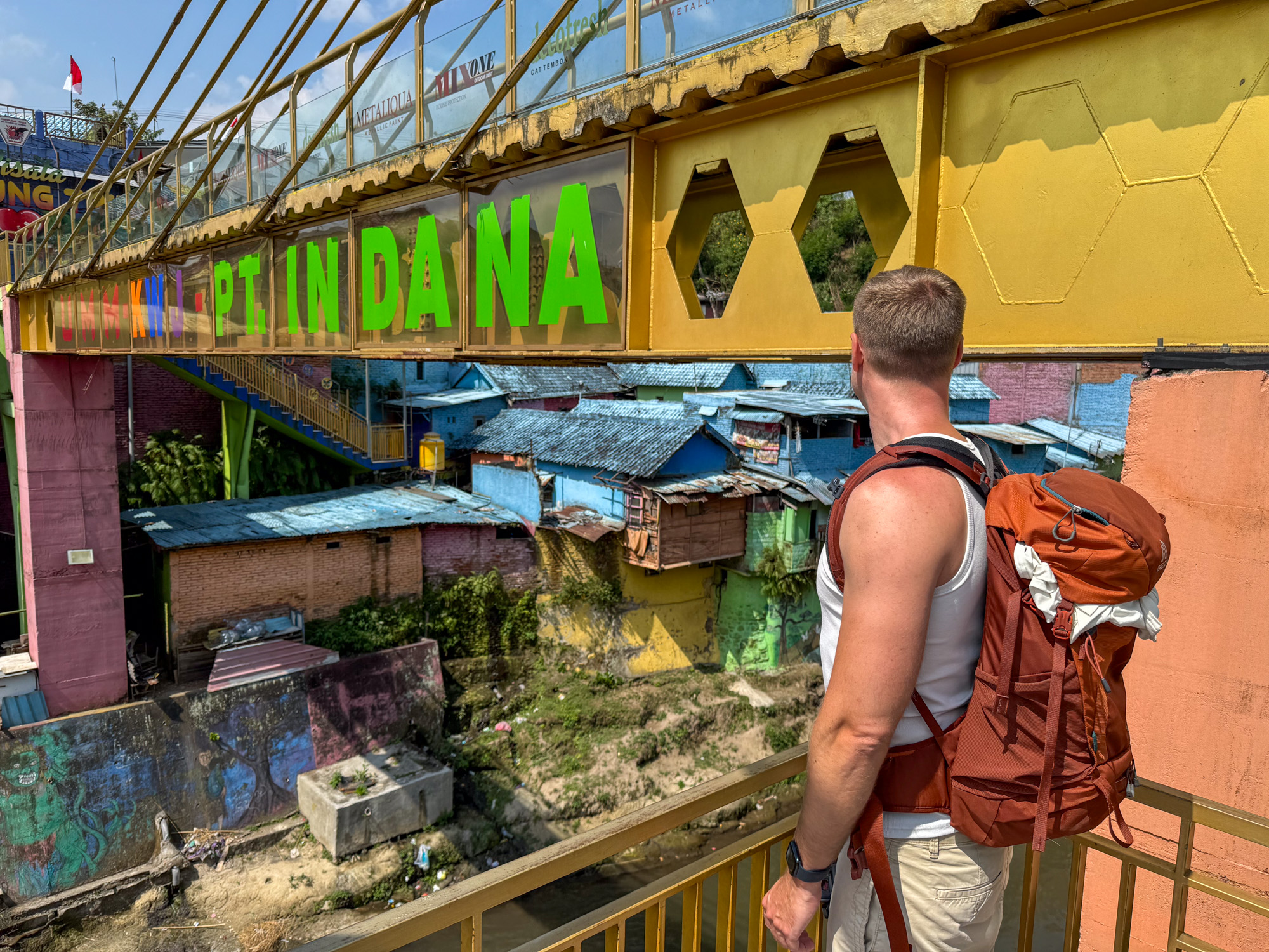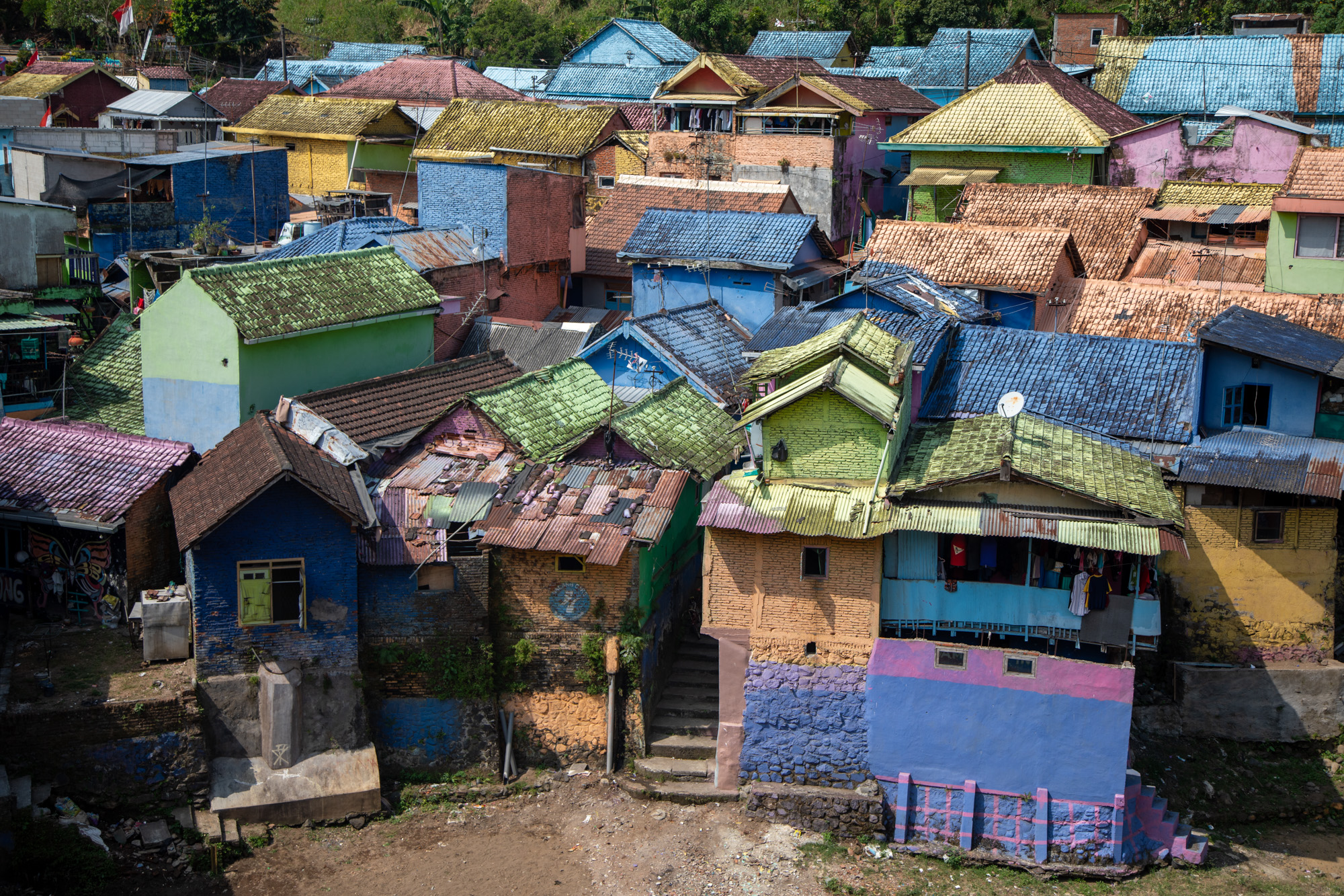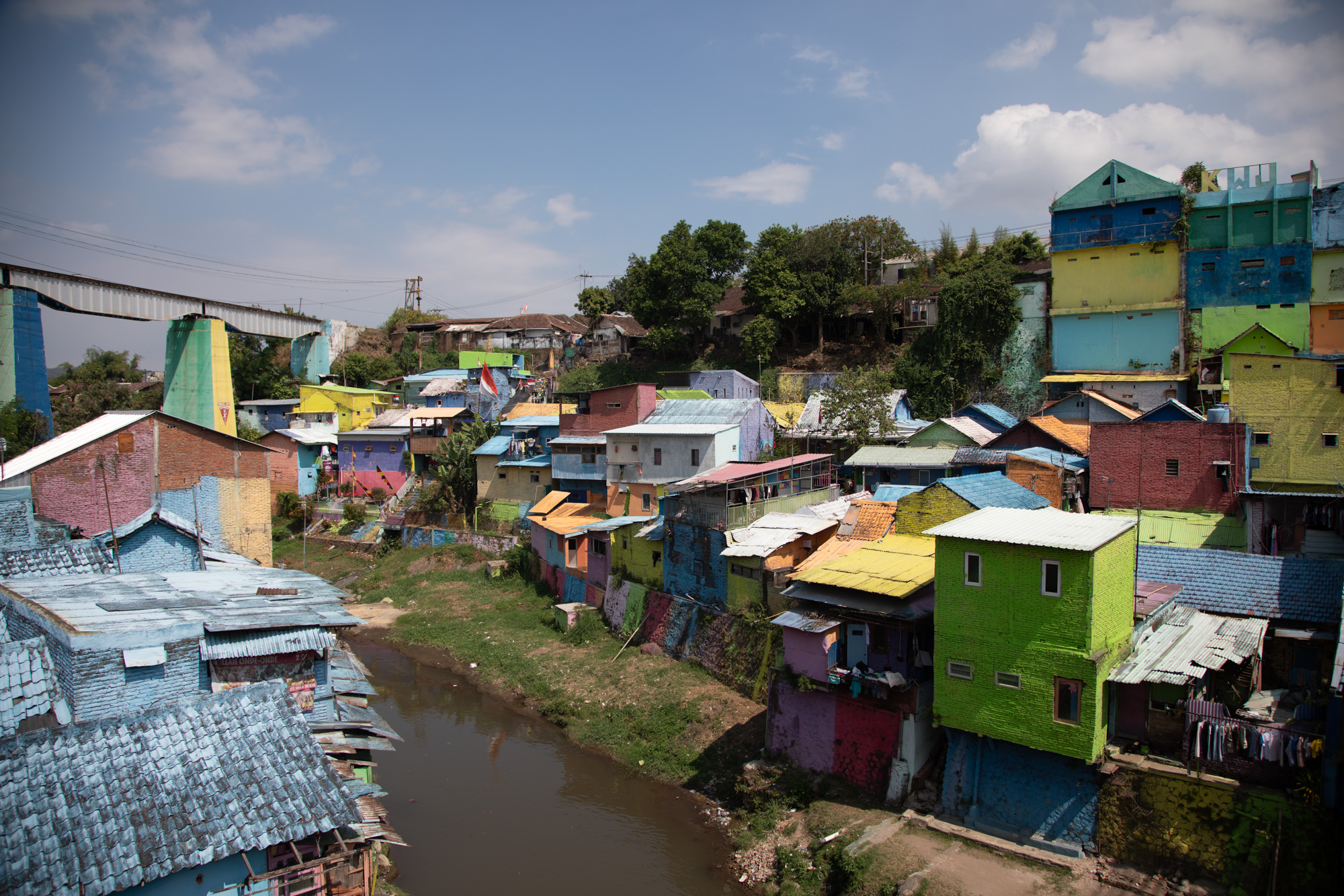Le lendemain, on doit prendre le train pour Yogyakarta, mais on a plus d’une demi journée à Malang. Le quartier de Jodipan est juste à côté de la gare et il mérite le coup d’oeil. Ce sera parfait pour compléter notre visite de Malang. On récupère d’abord nos billets de train à la borne dans la gare, puis on marche avec nos sacs jusqu’à Jodipan. Il y a environ six cents mètres donc même avec les gros sacs à dos c’est faisable. Il faut payer un ticket d’entrée pour les touristes qui viennent à Jodipan. On demande si on peut leur laisser nos sacs en échange, pas de problème. C’est très gentil de leur part. On s’enfonce dans les ruelles de ce quartier pauvre qui a été revitalisé par des étudiants en école de tourisme.Pour cela, ils ont peint les façades des bâtiments délabrés avec des couleurs pétillantes, afin d’attirer les touristes à venir ici, et cela a marché. Maintenant Jodipan est l’attraction principale de Malang.