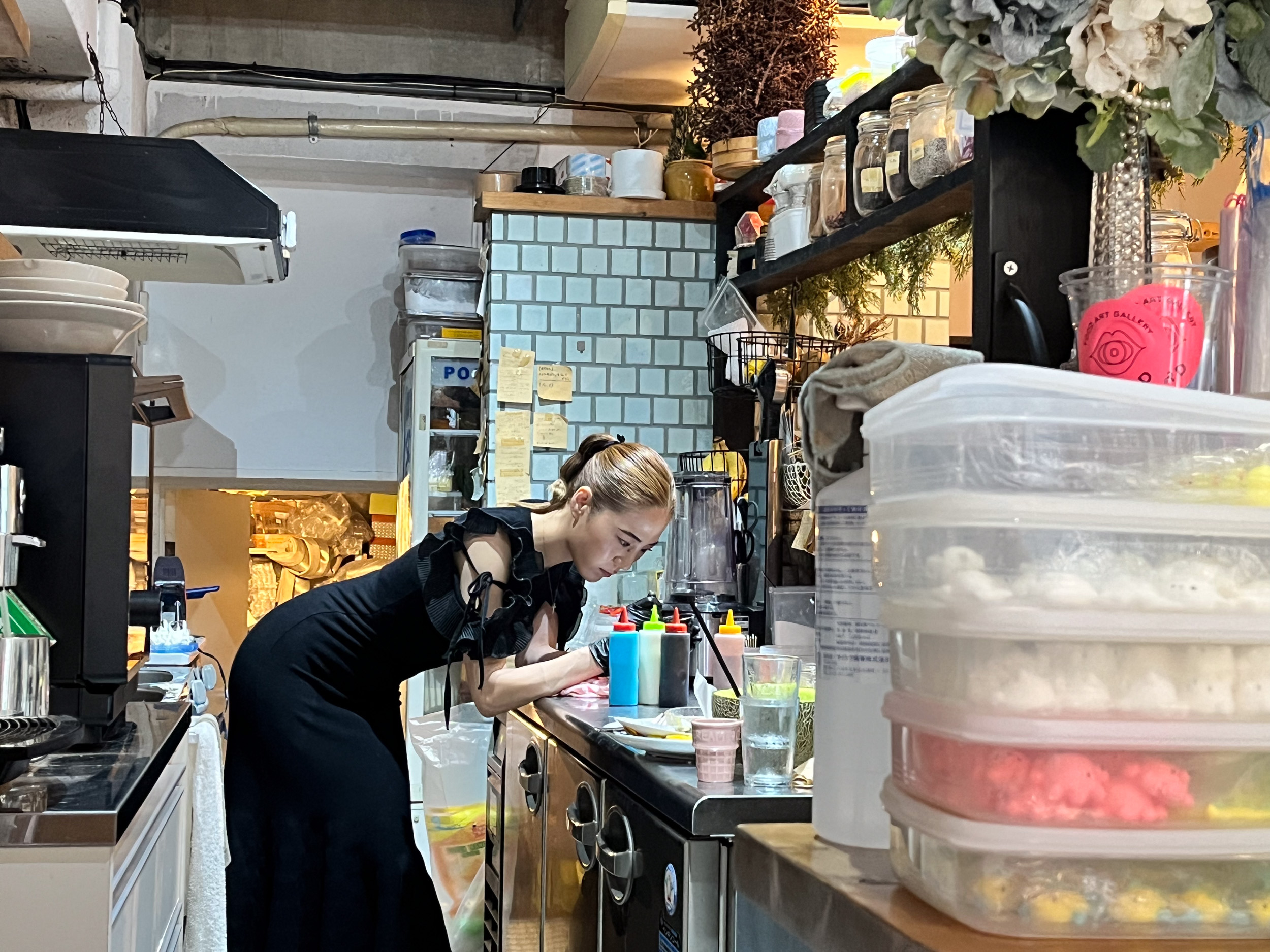 C’est comme une œuvre d’art, on est dans la quintessence de l’esprit japonais. La serveuse prend son rôle à cœur, concentrée à fabriquer cette œuvre éphémère que l’on va manger.