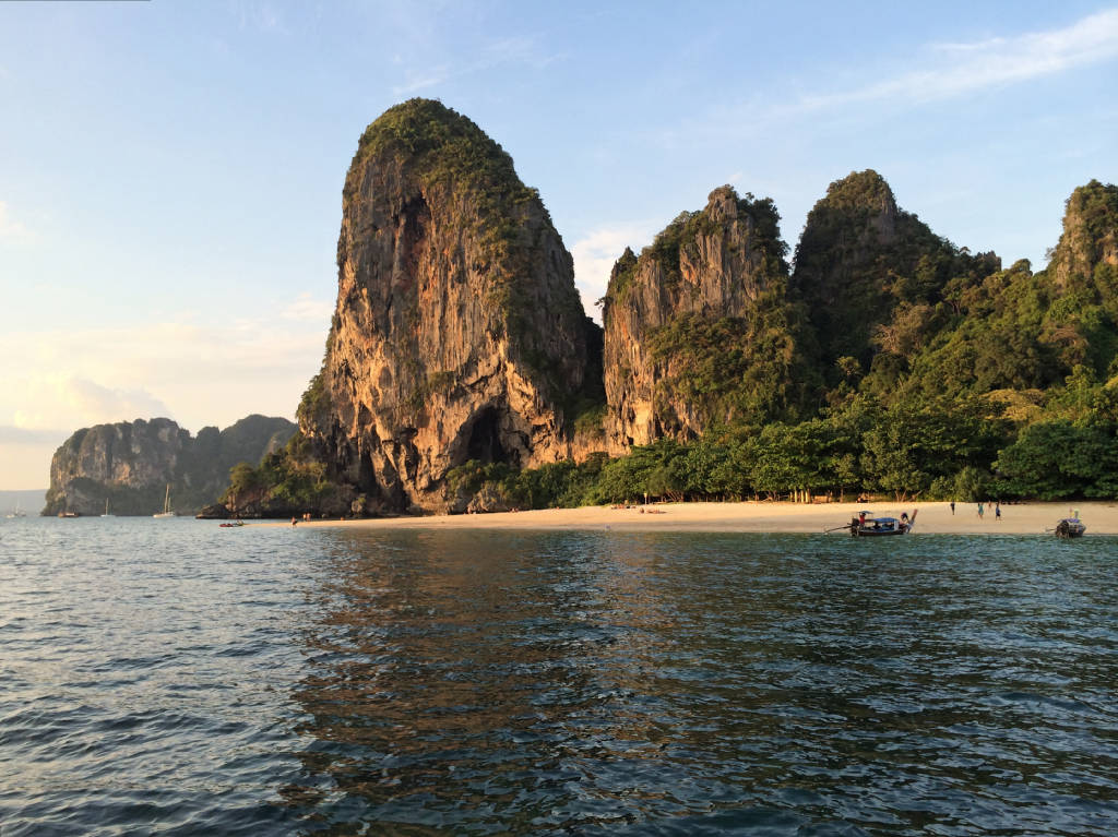 La plage de Railay est considérée comme une des plus belles plages du monde. Encerclée de pics de karst vertigineux qui attirent les grimpeurs du monde entier, le décor est splendide. Face à l’Ouest on apprécie le coucher de soleil et les couleurs du couchant en se promenant sur la longue plage de sable fin.