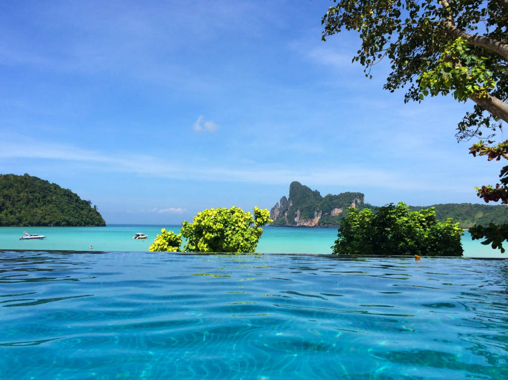 Pour notre dernière journée à Koh Phi Phi on profite de la plage de Koh Dalum et de la piscine à débordement en retrait avec une vue "infinie" sur la mer turquoise de la baie.