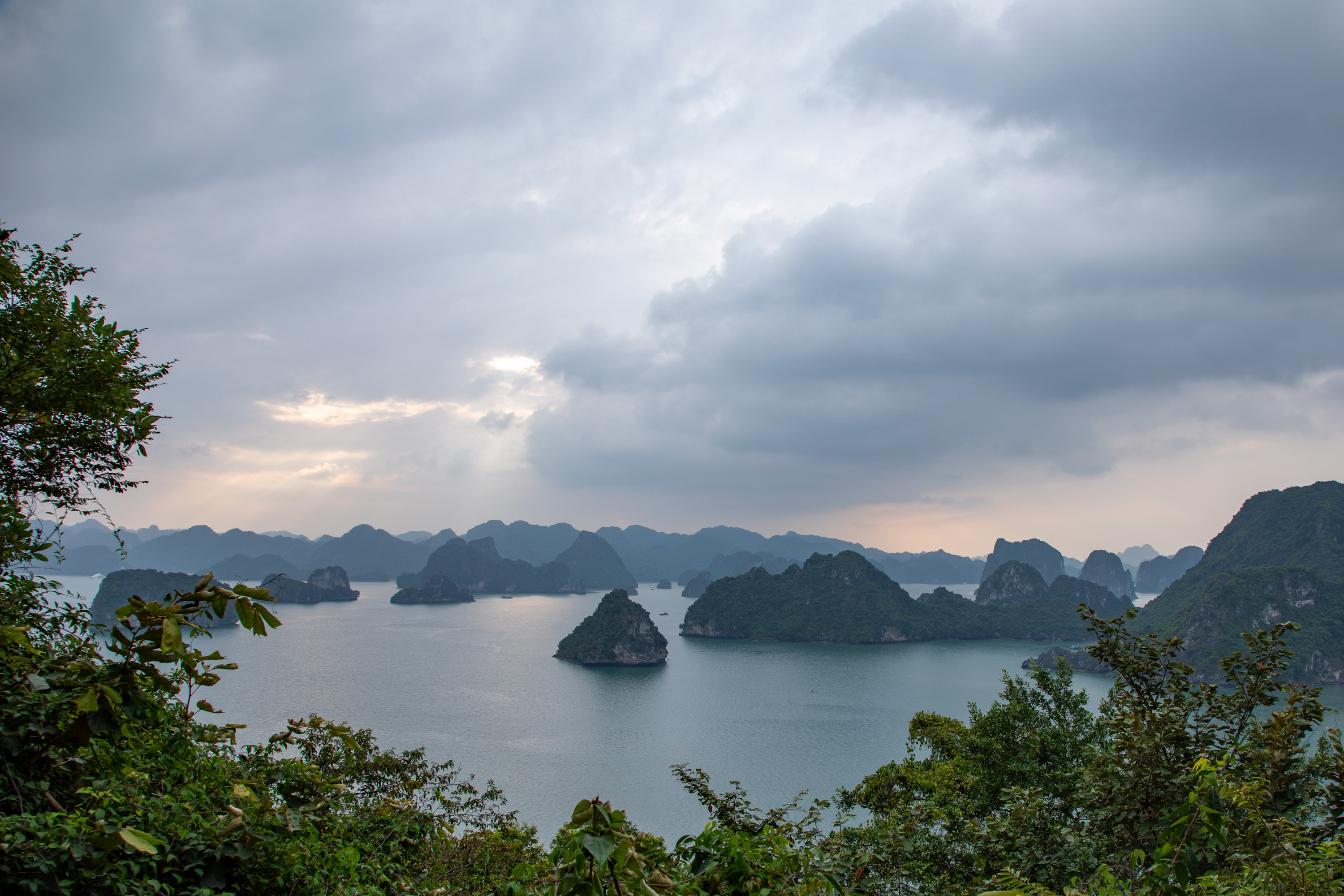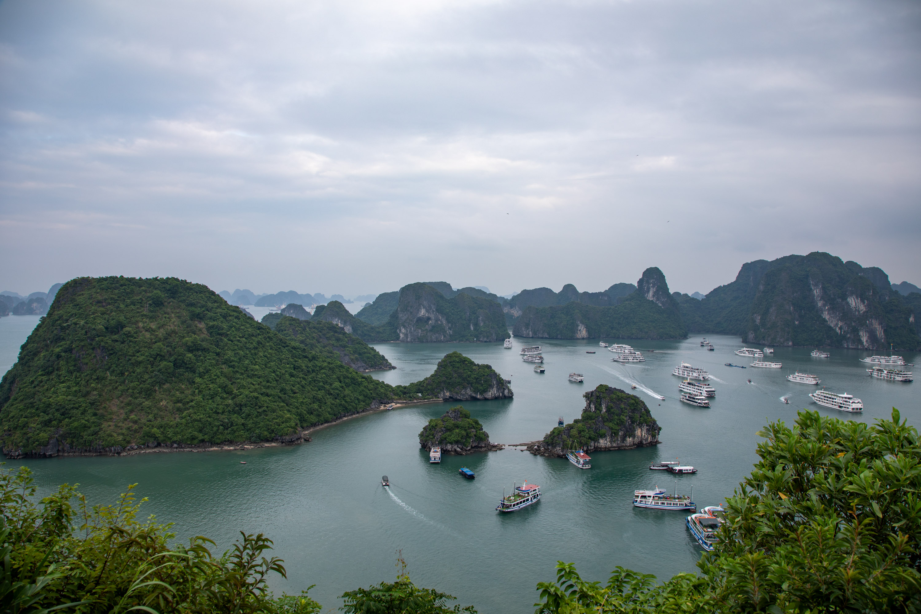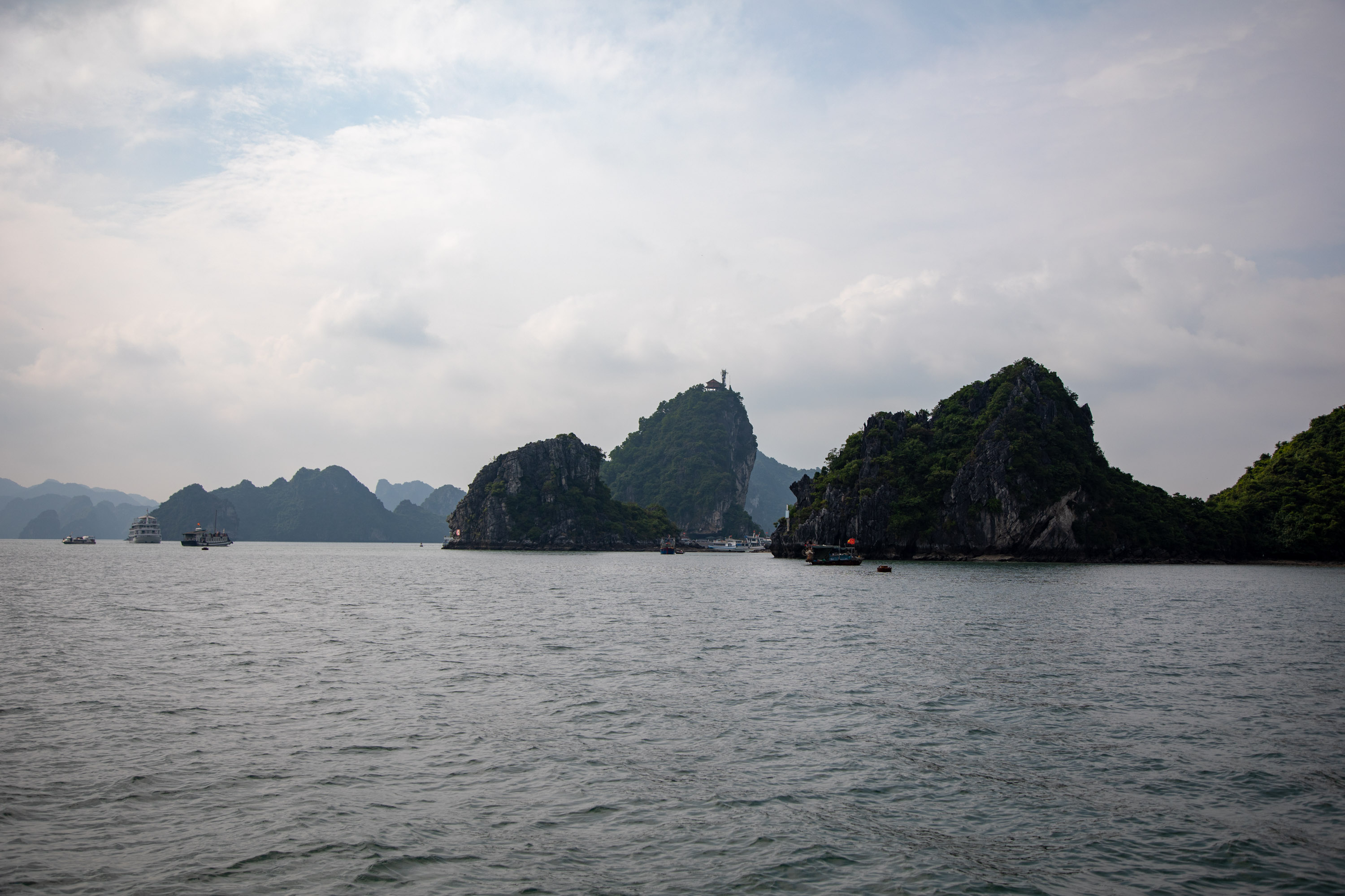 La Baie d’Halong est au milieu de cette grande baie, c’est la zone la plus touristique avec la petite île de Titov qui permet d’avoir une vue panoramique sur une très belle zone où les montagnes se concentrent, il y a aussi une petite plage (on en reparlera plus tard). Tous les bateaux de croisières qui offrent la formule 2 jours 1 nuit dans la Baie d’Halong, mouilleront la nuit ici les uns à côté des autres. La vue de tous ces bateaux au milieu de ces montagnes de karst font parti du décor maintenant, on aime ou pas, personnellement je trouve que ces bateaux apportent une touche spéciale et cela ne me dérange pas.