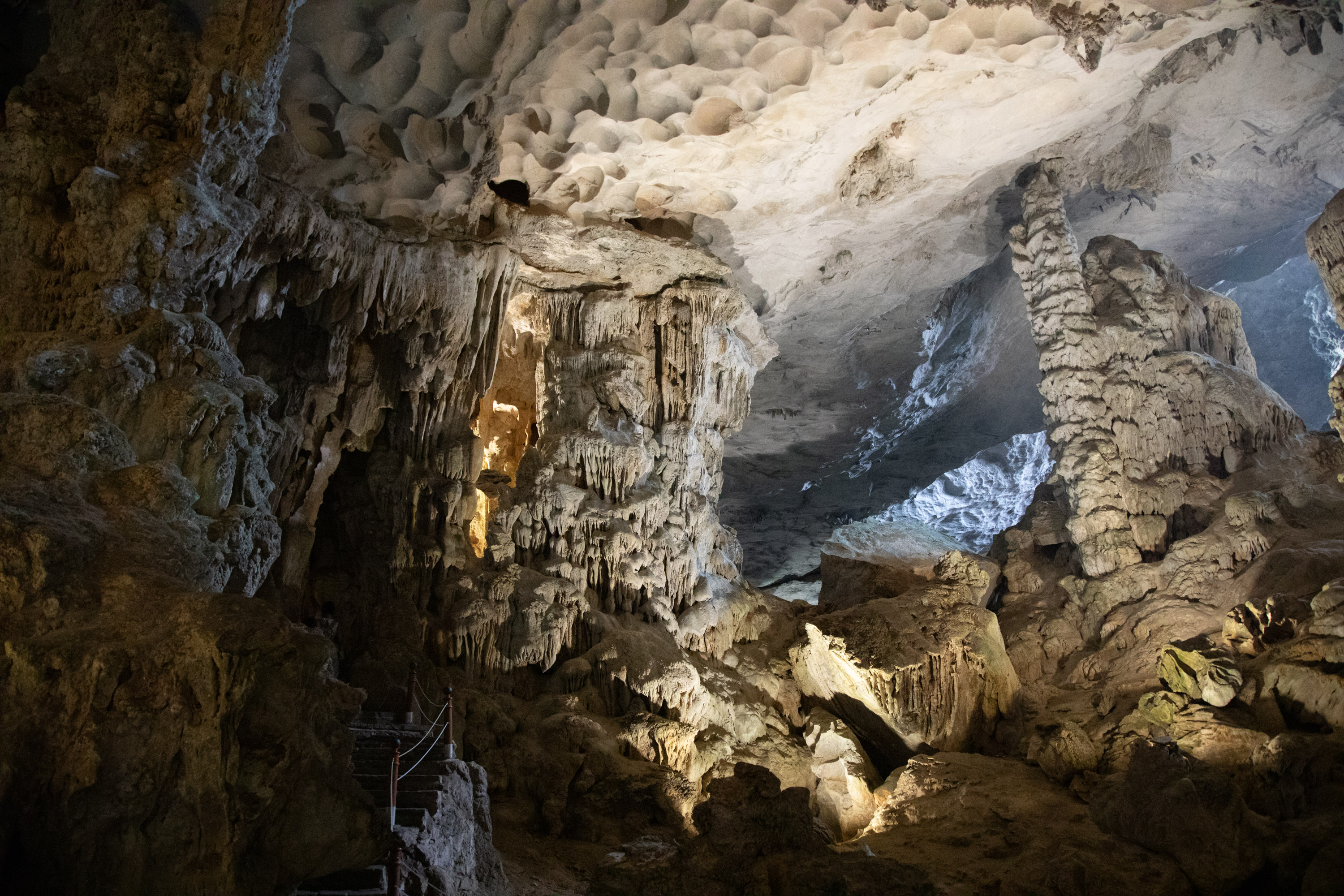 Il faut grimper un long escalier pour arriver jusqu'à l'entrée de la grotte, sur le chemin, il y a plusieurs esplanades qui donne accès à un point de vue dégagé sur cette partie de la Baie d'Halong.