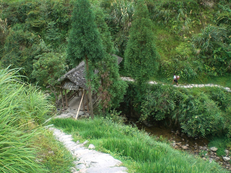 Au départ de Guilin, on prend un bus à la gare routière pour Long Sheng, une ville qui se trouve un peu au Nord des montagnes de Long Ji. Après 4 heures de bus dans la plaine puis dans des montagnes, Long Sheng s’étend des deux cotés d’une rivière. C’est une ville sale qui ne présente pas vraiment d’intérêt autre que la possibilité de prendre un mini bus pour les montagnes. A la sortie du bus, les rabatteurs accourent sur les voyageurs. Finalement, une dame propose de nous emmener dans son village, Da Zhai, qui est plus petit que Long Ji mais aussi plus typique selon elle. Finalement on se dit que l’on perd rien à la suivre et que si cela ne nous plait, on reprend le mini bus. Le voyage en mini bus sera long, une heure et demi, et on aura quelques frayeurs lorsque les roues s’approchèrent trop dangereusement du ravin. Une poule dans un sac plastique sera posé sur le sol à coté de Myriam, qui sursautera quand elle sentira que la poule était en fait vivante et gesticuler pour se dégager.