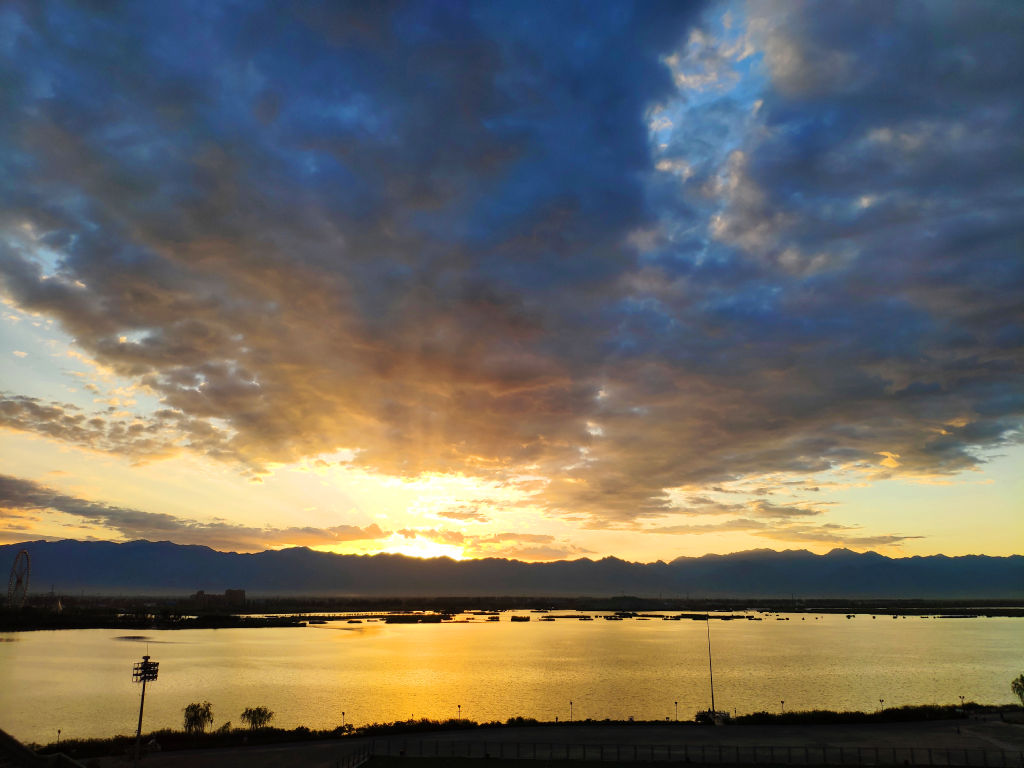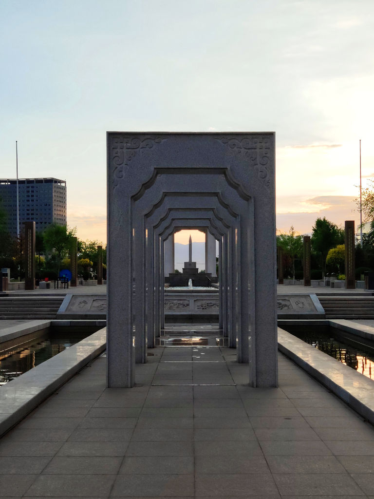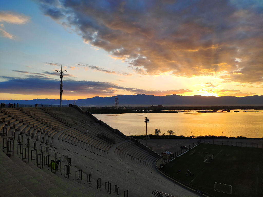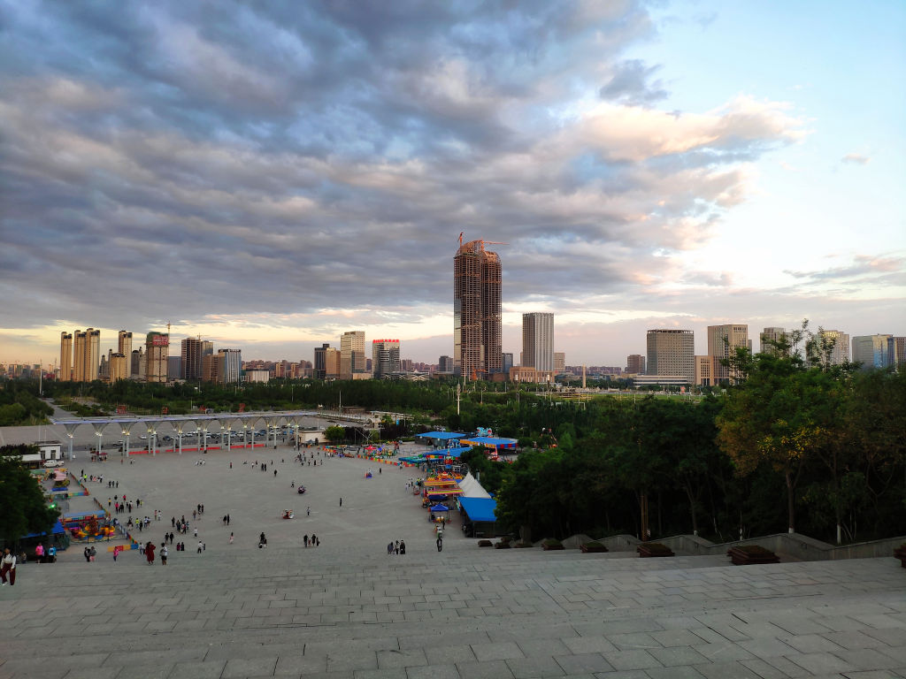 La nuit tombe tard à Yinchuan par rapport à Hangzhou qui se trouve à 2000 kilomètres à l’Est. Ce qui nous donne l’occasion de rentrer tranquillement en ville et de visiter le quartier d’affaire de Yinchuan et regarder le soleil se coucher depuis une esplanade qui est parfaitement orientée plein Ouest.