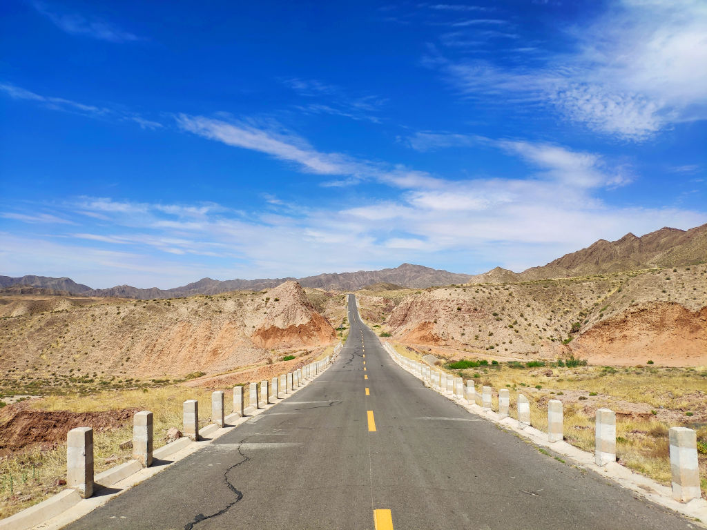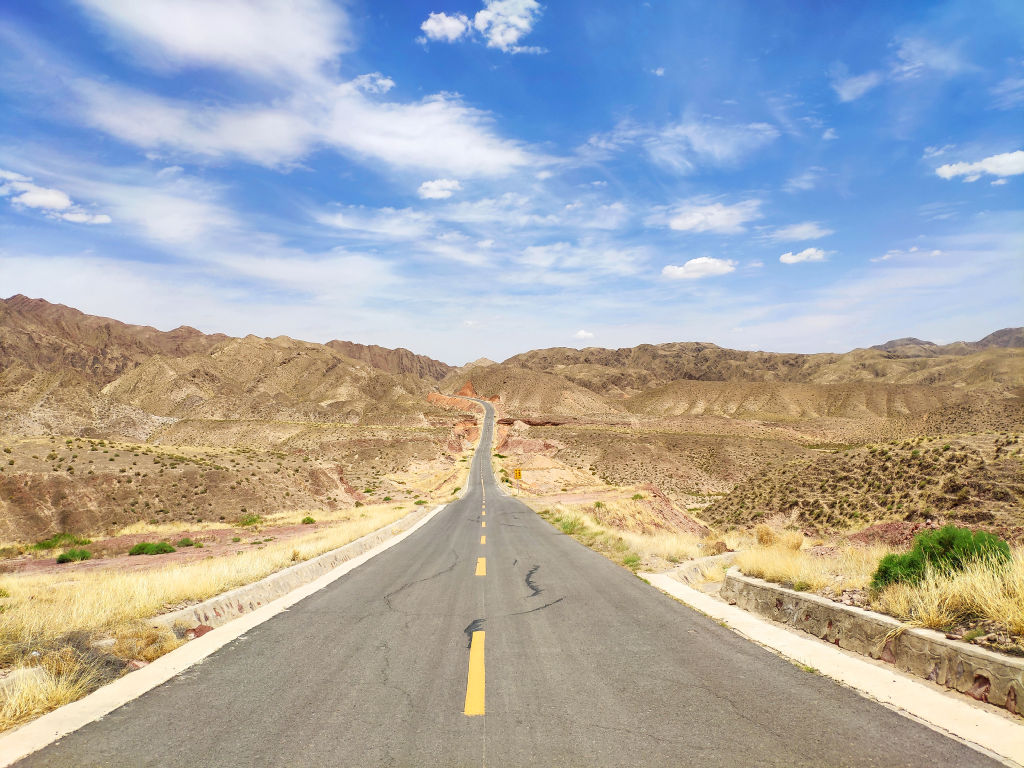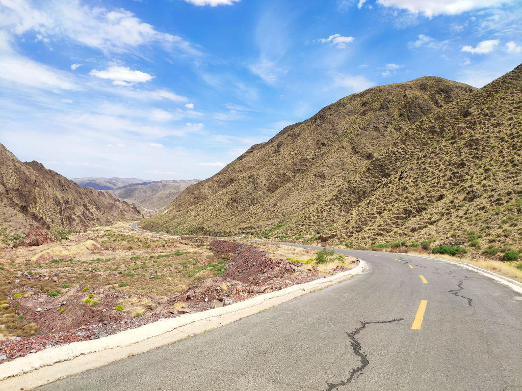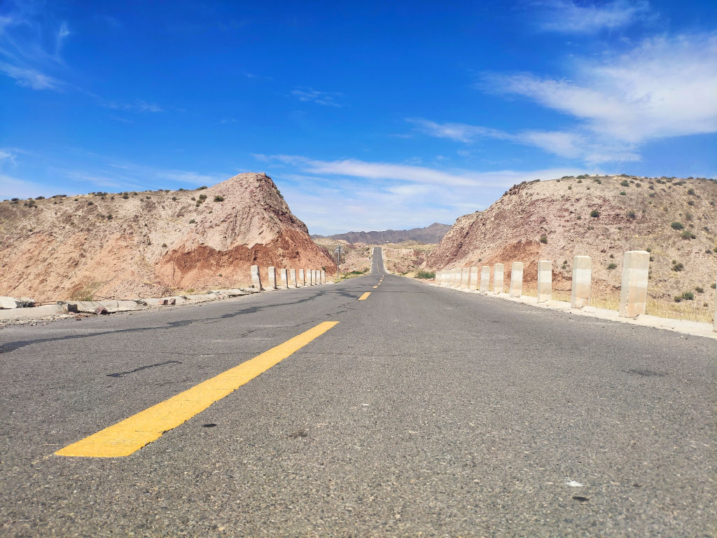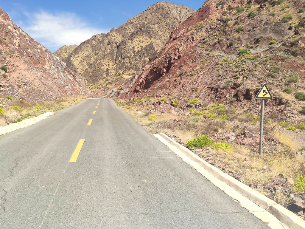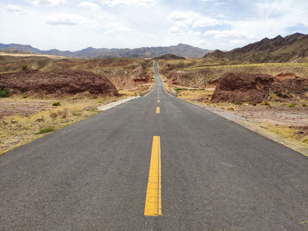 L’asphalte file entre les montagnes aux couleurs ocre.