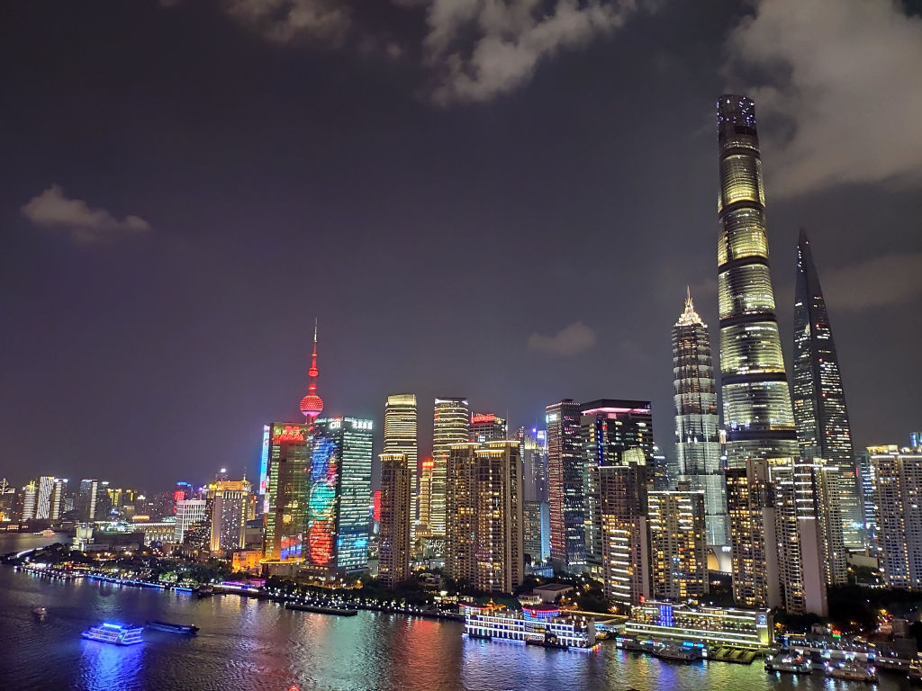 Nous nous dirigeons vers le Bund pour un dernier aperçu de cette vue qui ne me lasse pas après tant d'années ici, j'apprécie toujours la grandeur de cet ensemble de tours à Pudong. Ici la vue depuis la terrasse du restaurant de l'hotel Indigo au Sud du Bund.