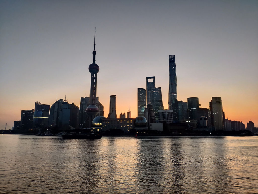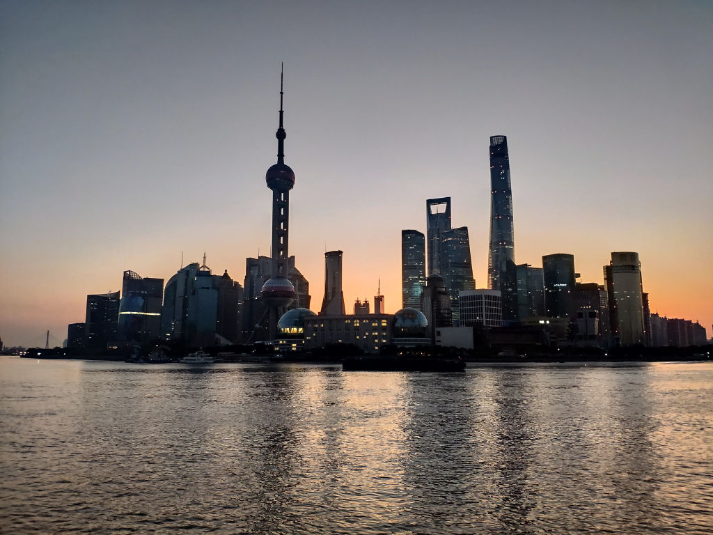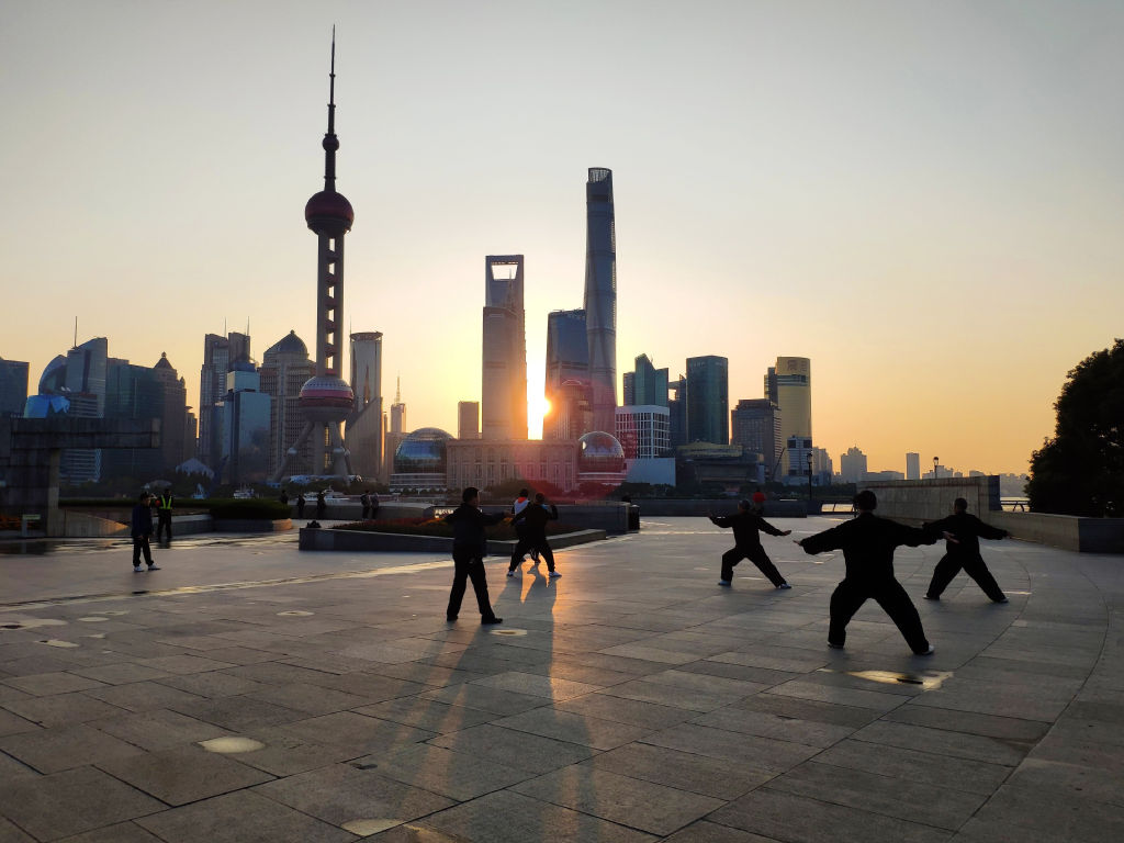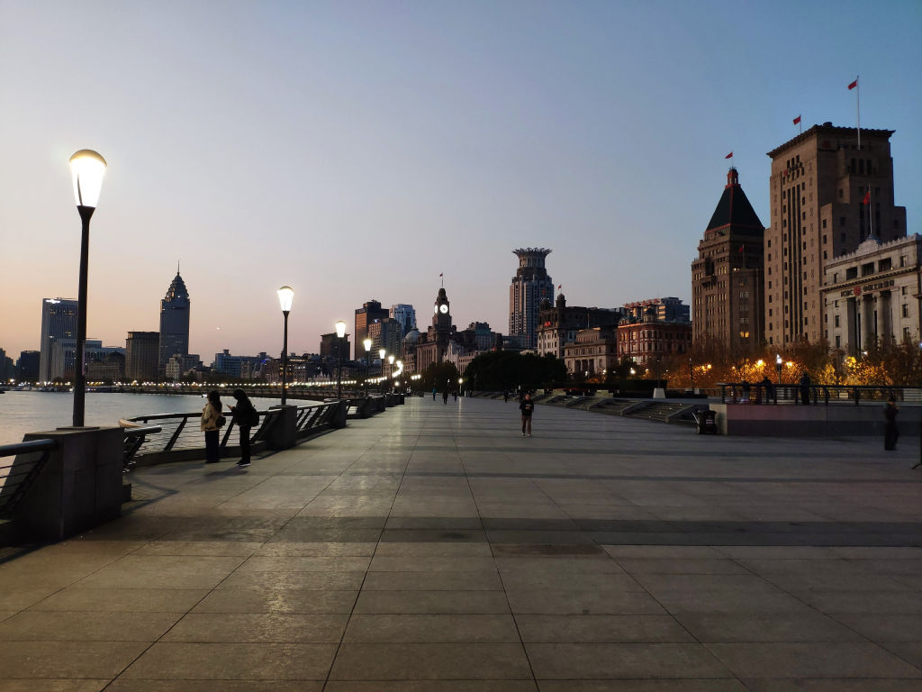 Mais je prends mon courage à deux mains, je m'habille chaudement et pars à jeun rejoindre le taxi réservé sur didi. Arrivé sur la plus belle esplanade de Chine, le moment est magique. Il fait très froid, au bord du Huangpu il y a une brise glacial qui glace le visage. Les tours de Pudong sont dans l'ombre et le ciel a des teintes pastel en fond.