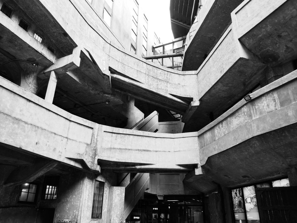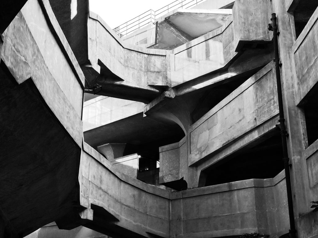 De nombreuses passerelles en béton brute permettent de rejoindre le batiment central qui a une forme arrondie.