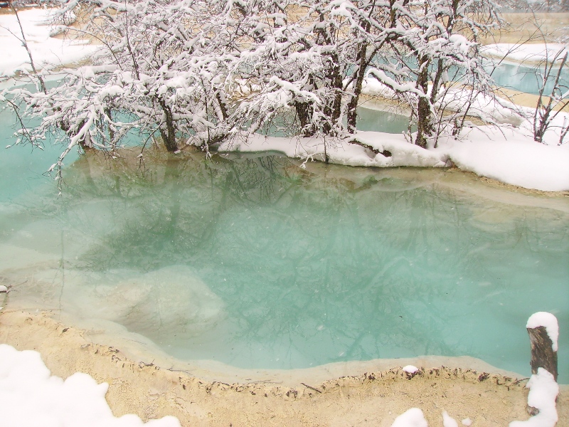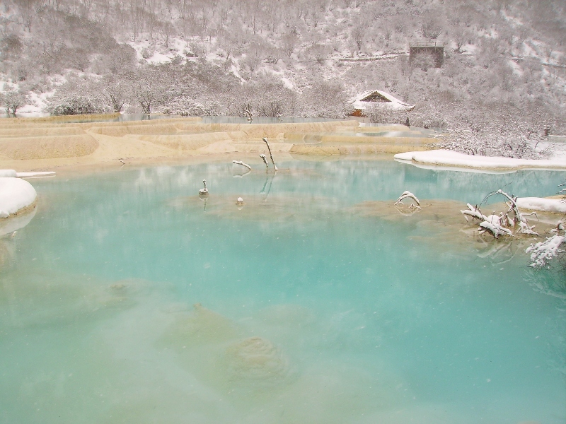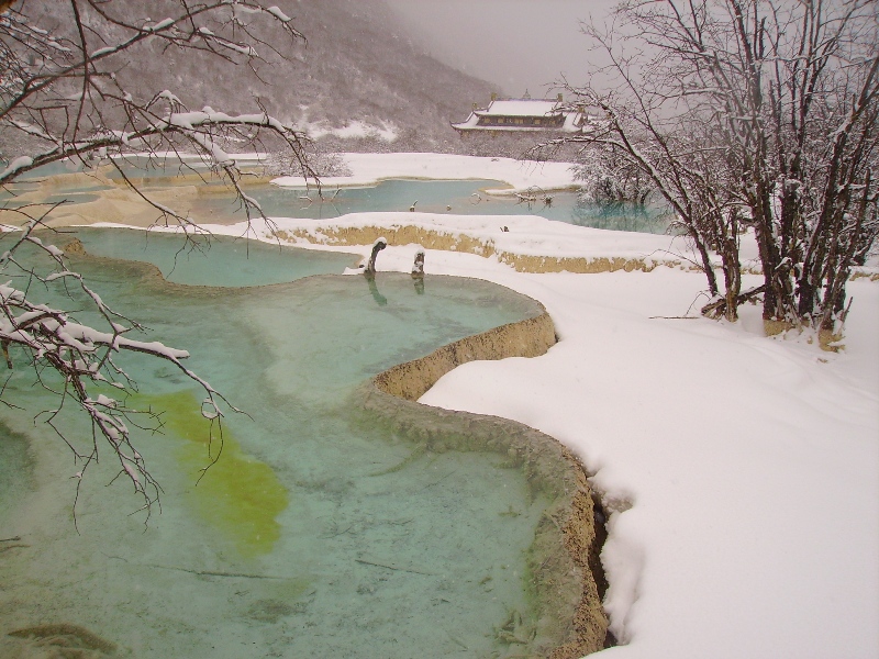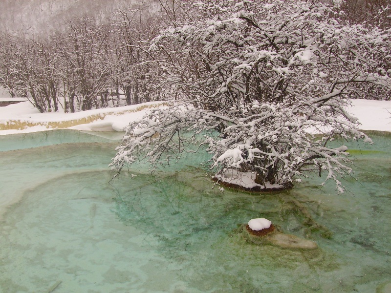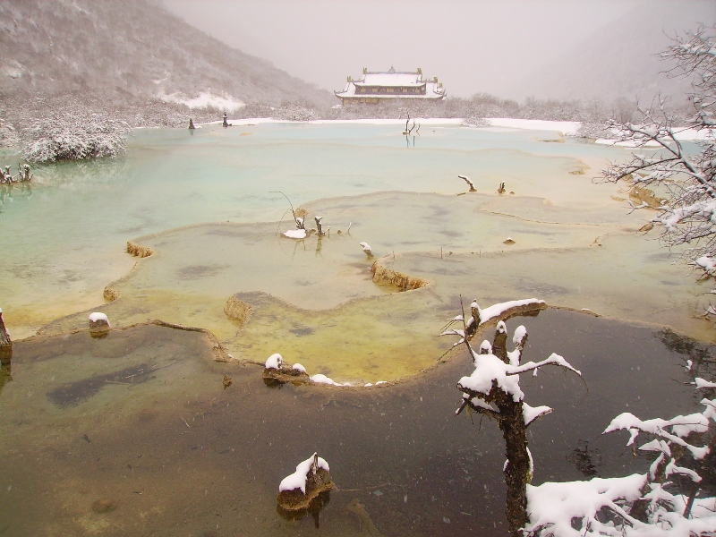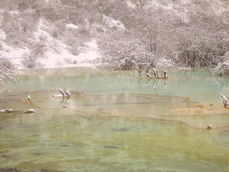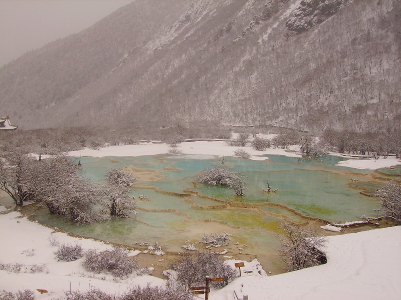 Les 50 kilomètres qu’il y a entre Huanglong et Songpan seront difficiles, déjà parce que la neige nous oblige à chaîner la voiture, et puis en haut du col, la lumière qui se reflète sur la neige nous éblouit vraiment et on ne peut profiter de ce magnifique point de vue sur la vallée. Des yaks broutent sans se soucier de la tempête de neige, leur pelage devient blanc. Des rochers tombent sur la route devant nous et nous avons beaucoup de chance. Arrivés finalement, le parc qui est censé être luxuriant, est sous la neige. Nous décidons quand même de rentrer afin de voir les fameux bassins d’eau calcaire à l’eau d’un turquoise incroyable. Malheureusement, seul le bassin le plus grand, au bout des 2 heures de marche est encore plein de cette eau bleue.