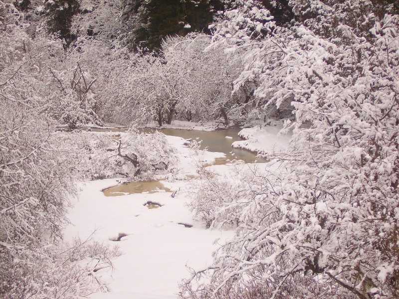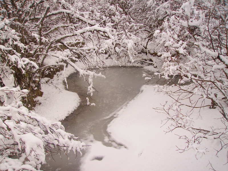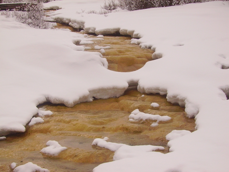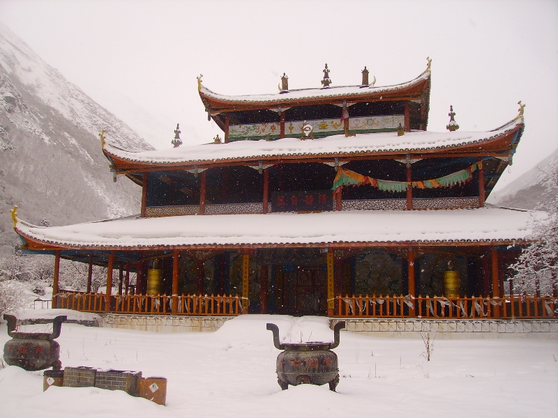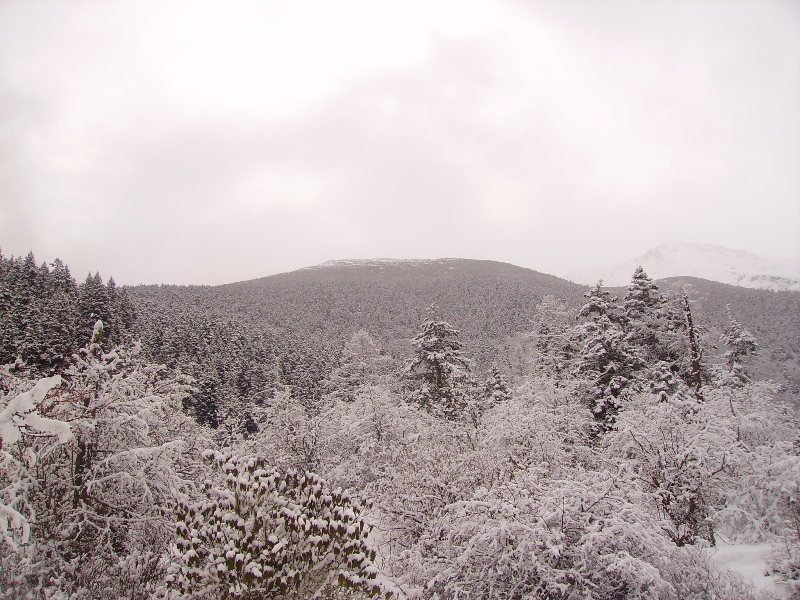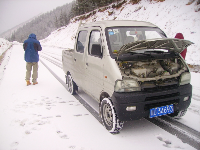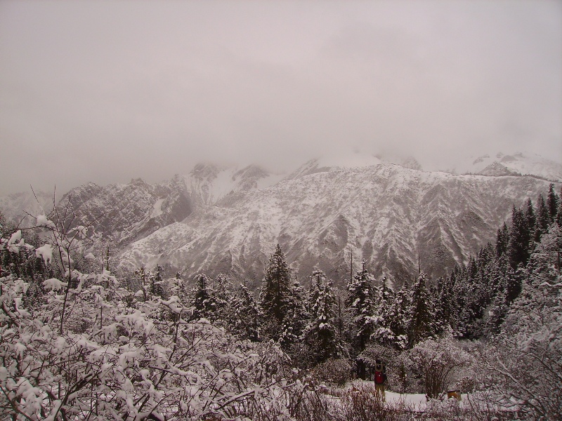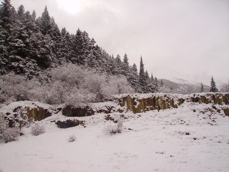 Les 50 kilomètres qu’il y a entre Huanglong et Songpan seront difficiles, déjà parce que la neige nous oblige à chaîner la voiture, et puis en haut du col, la lumière qui se reflète sur la neige nous éblouit vraiment et on ne peut profiter de ce magnifique point de vue sur la vallée. Des yaks broutent sans se soucier de la tempête de neige, leur pelage devient blanc. Des rochers tombent sur la route devant nous et nous avons beaucoup de chance. Arrivés finalement, le parc qui est censé être luxuriant, est sous la neige. Nous décidons quand même de rentrer afin de voir les fameux bassins d’eau calcaire à l’eau d’un turquoise incroyable. Malheureusement, seul le bassin le plus grand, au bout des 2 heures de marche est encore plein de cette eau bleue.