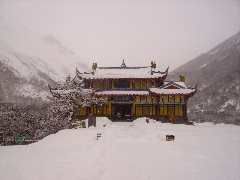 Cette nuit, la neige est tombée sans interruption. Au réveil, les montagnes qui, la veille étaient teintées de brun et de beige sont maintenant toutes blanches. Il fait froid. Je rejoins les Taiwanais et nous petit déjeunons à coté de l’auberge. Des Jiao Zi de bon matin, ça calle !