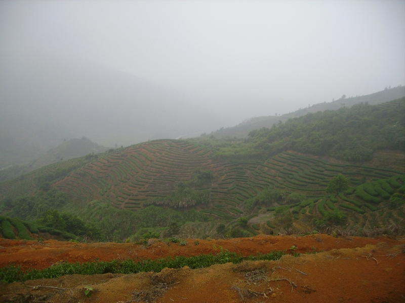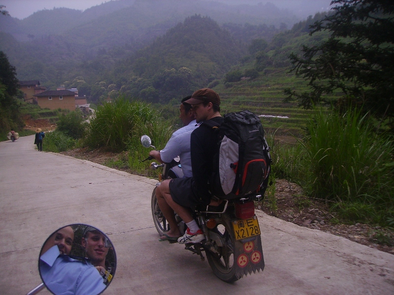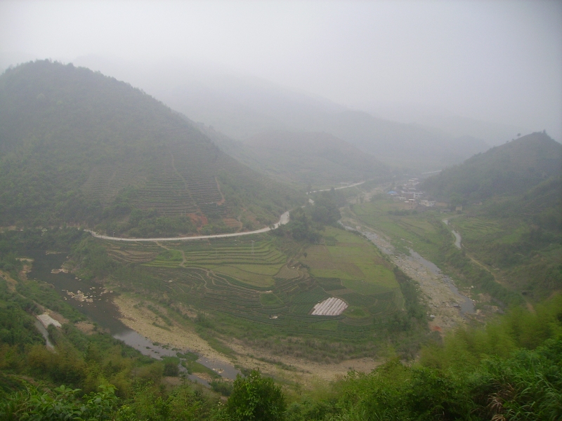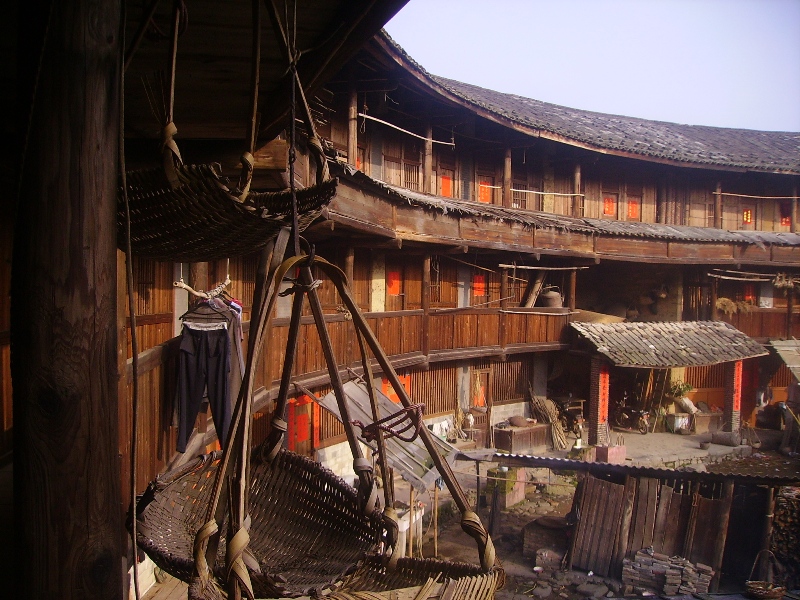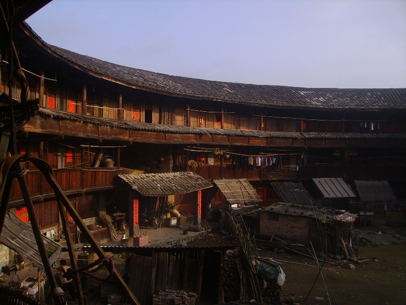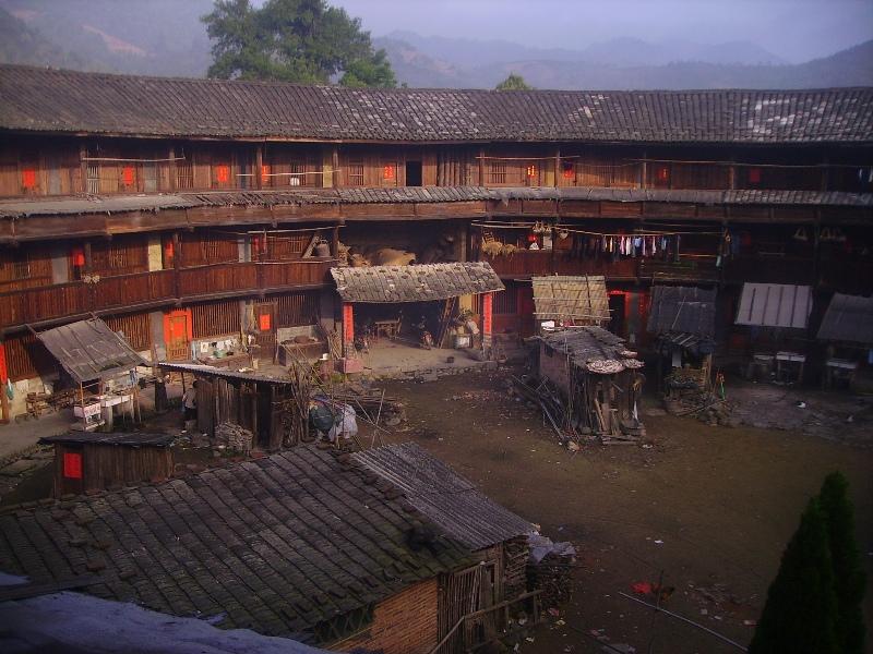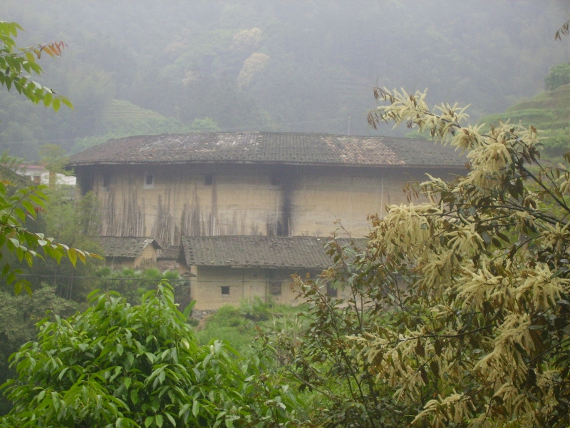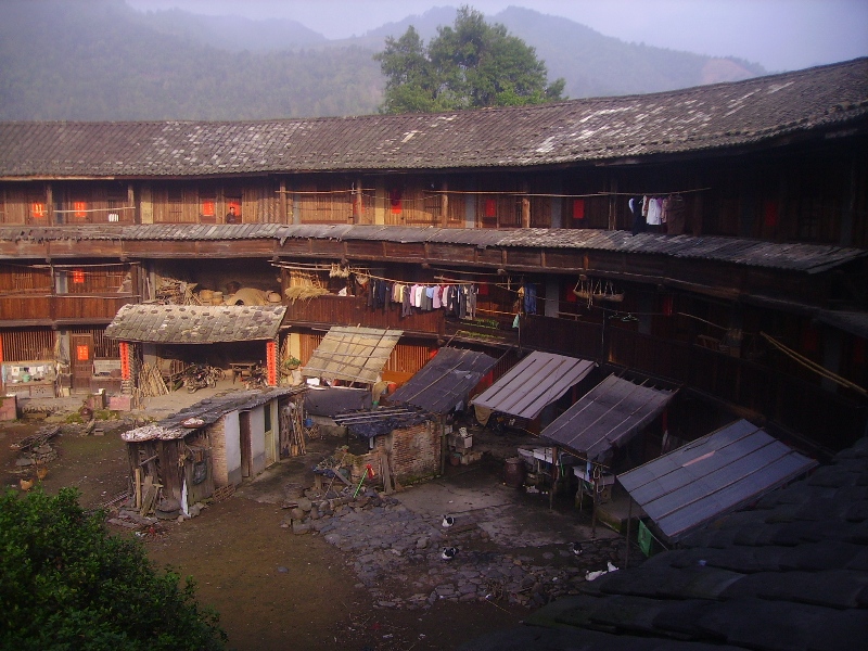 La campagne alentours que l’on va finalement parcourir à moto est tout simplement exceptionnelle, des champs de thé en terrasse, des montagnes aux cimes qui dépassent d’une brume épaisse blanche, des paysans qui rentrent des champs avec leur chapeau de paille, et puis ces maisons rondes qui telles des maisons extra terrestres fascinent. Les américains en pleine guerre froide ont cru voir en ces cylindres immenses des silos nucléaires que la Chine avait construit dans le secret. Les satellites de l’armée américaine avaient photographié la région et un grand étonnement autour de ces bases secrètes s’emparait de Washington. Des espions US sont donc parti voir de plus sur le terrain (ce qui a été avéré sur certains sites que j’ai lu sur le net, des hakkas ont rencontré des blancs à cette époque de la Chine fermée, nul doute qu’ils ont du surpris par la vérité).