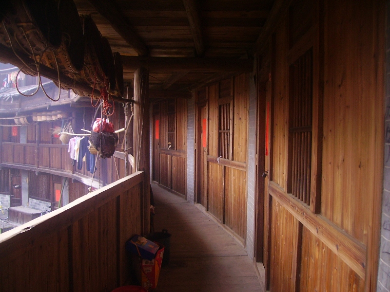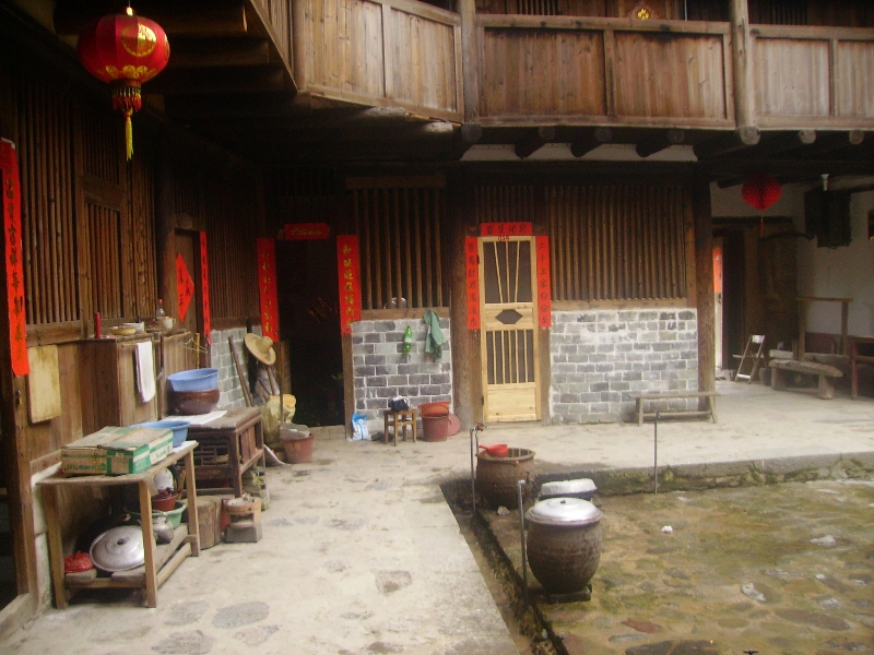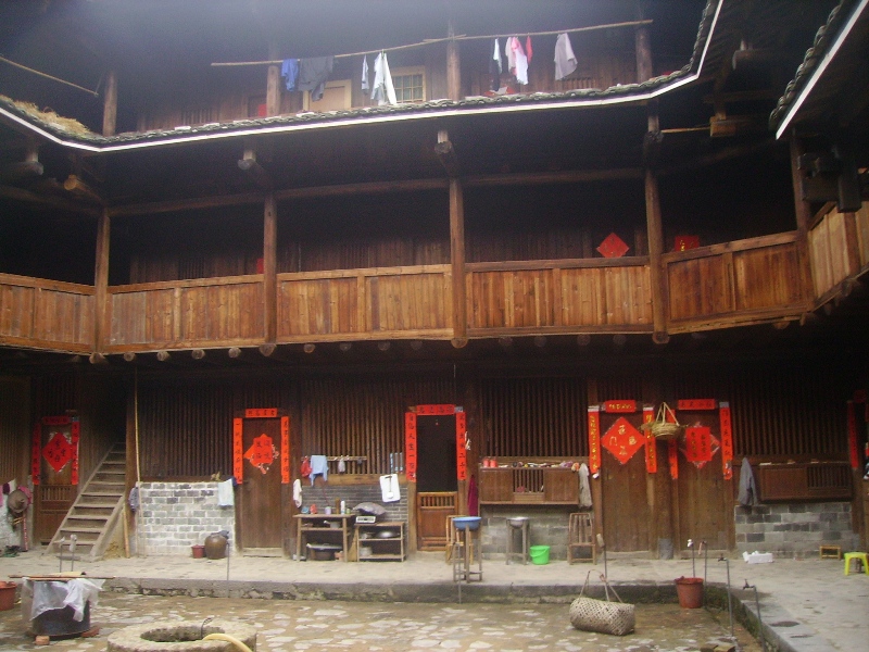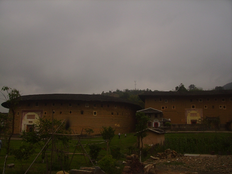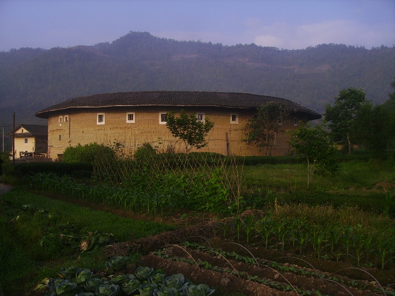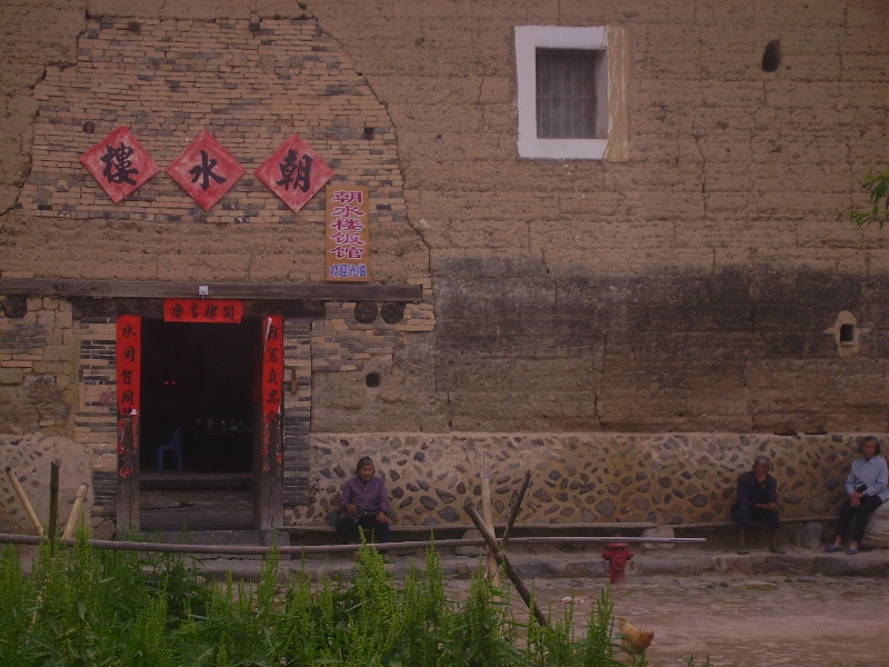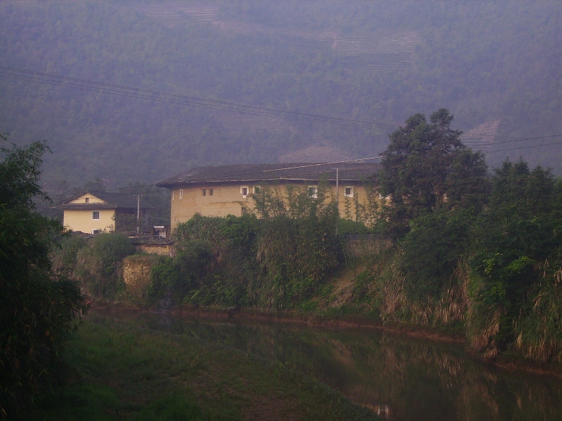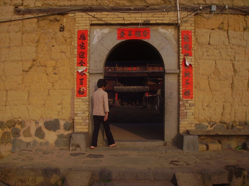 Après être descendu du bus Xiamen – Yongding en face de l’entrée d’une de ces maisons rondes, que les chinois appellent Tu Lou, nous décidons de s’éloigner des lieux les plus touristiques afin de se faire avant tout une balade en campagne. Nous demandons à un chauffeur d’une camionnette si il peut nous déposer un peu plus loin, histoire de se débarrasser des rabatteurs qui nous suivent à la trace depuis un moment. Il nous amène finalement vers un deuxième village de hakka, avec encore d’énormes battisses de vie commune. Ces battisses ressemblent d’ailleurs aux bâtiments collectifs pour ouvriers construits en France au XIXe siècle, aux grandes heures du patronat paternaliste. Il est d’ailleurs intéressant de noter à ce propos qu’en France comme en Chine, il y a une forme de fierté à vivre cette expérience de vie où toute forme de privé a été annihilée, dans des immeubles qui ont rapproché les hommes à en faire une grande famille.