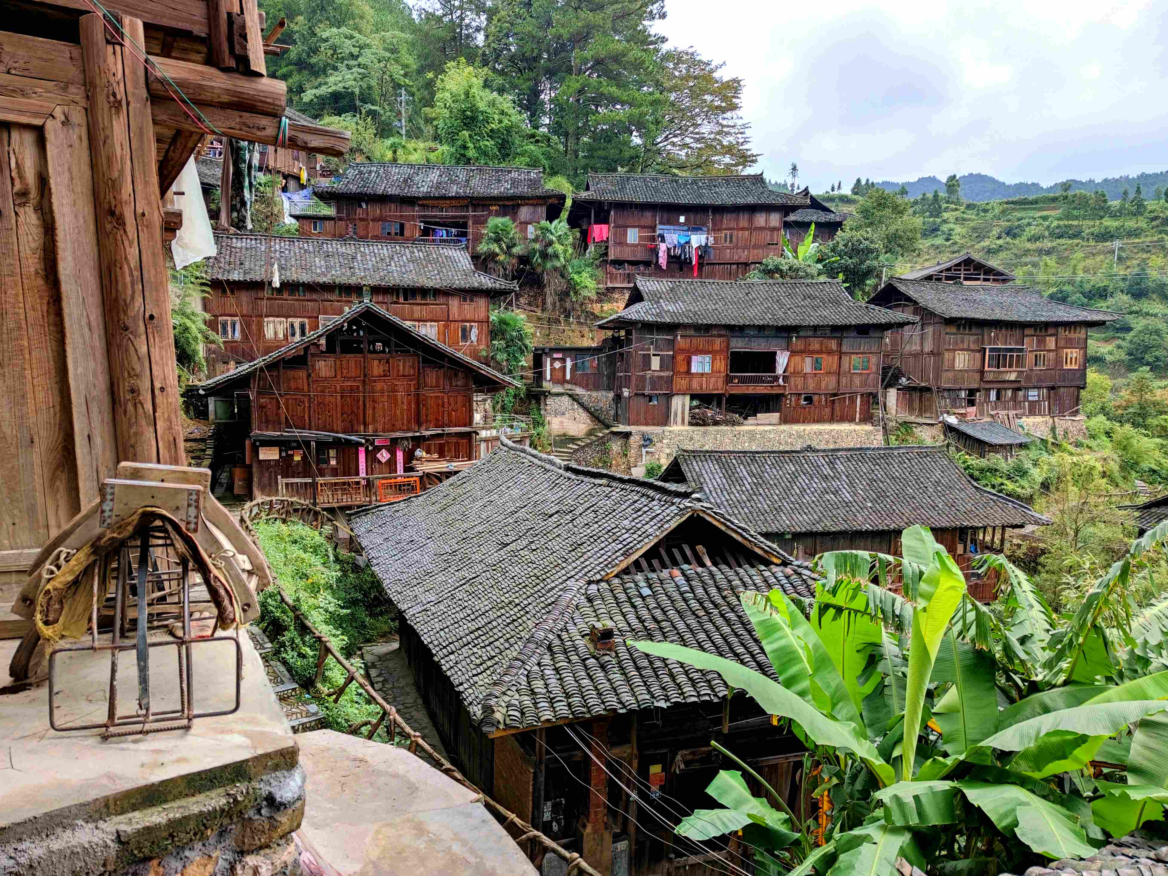 Quelques Miao sont assis et discutent, d’autres grimpent les nombreuses marches avec des marchandises suspendues sur un bambou. Leur dialecte m’est inconnu, je ne comprends pas un mot de leurs conversations. On passe devant de belles maisons en bois, et on a une vue différente du village.