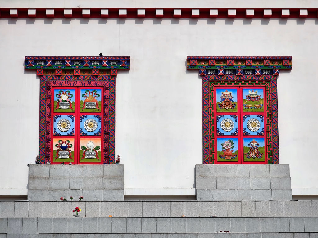 La décoration rappelle le style tibétain, le batiment semble assez contemporain mais en impose quand même par ses dimensions