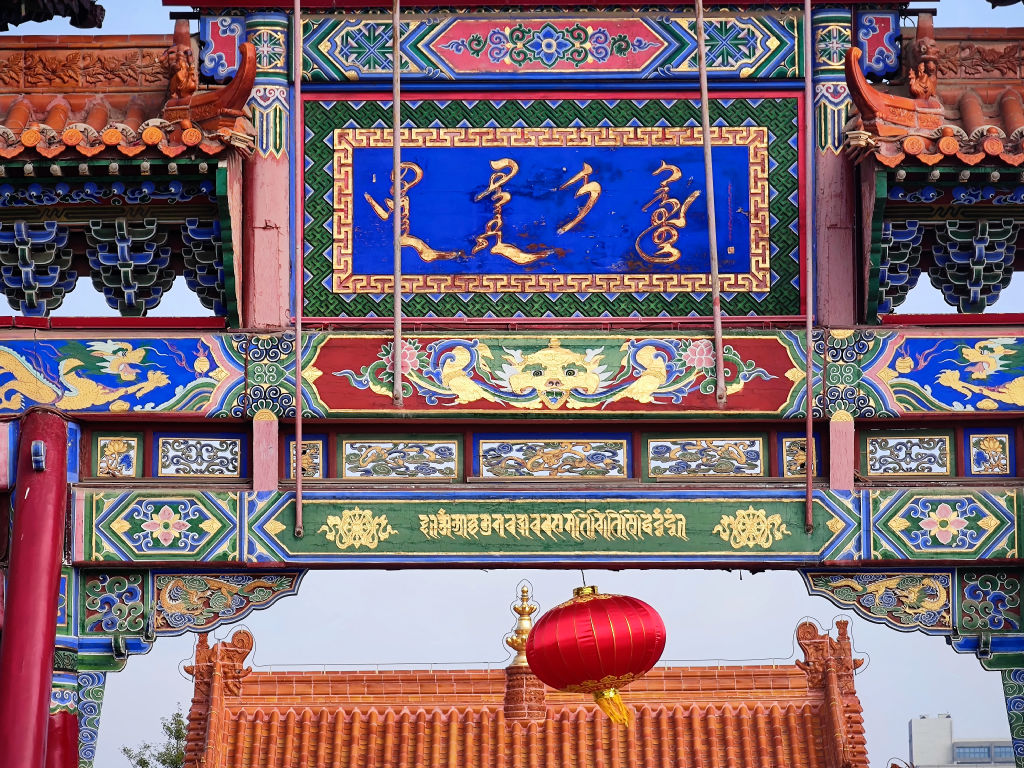 On remarque les inscriptions en chinois, en mongol et en tibétain sur la façade
