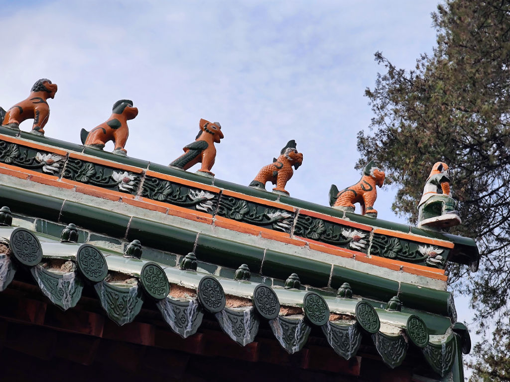 On commence par manger dans la cantine du temple, une cuisine qui ne sert que de la nourriture végétarienne, il n’y a pas de carte, le menu imposé est à 60 RMB par personne. Beaucoup de tofu et de légumes. Cela nous requinque pour la suite de la journée. Ensuite on pénètre dans le temple. Shaolin a été l’objet de nombreuses attaques dans le passé. Il a été complétement brulé en 1928 et reconstruit depuis. Certains batiments ont un aspect neuf mais on trouve quelques éléments historiques, comme cette statue à l'entrée.