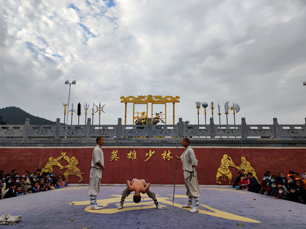 On passe devant un des centres d'entrainement au Kung Fu de Shaolin, les enfants font tournoyer leur baton au dessus de leur tête