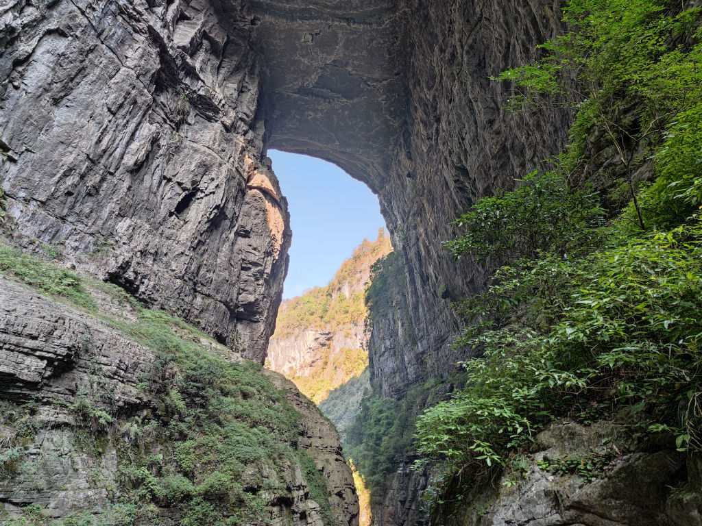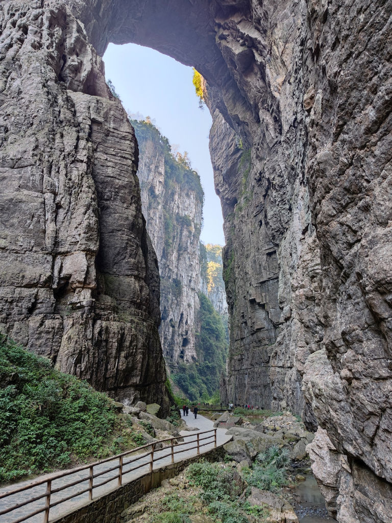Après une courte nuit, on prend un petit déjeuner matinal pour arriver tôt dans la zone de karst de Wulong. Cette partie du parc a été classée par l'UNESCO au patrimoine mondial de l'humanité. Il s'agit d'une énorme fracture dans la montagne, avec des ponts naturels au milieu desquels passent un ruisseau. C'est magnifiquement bucolique, mais il fait très froid dans la fracture, avec le vent qui s'engouffre dans les cavités. Il faut être bien couvert, mais la vue est tout simplement magique. Ce matin il n'y a pas trop de monde, de toute façon Xiannvshan n'est pas du tout un endroit très connu encore.