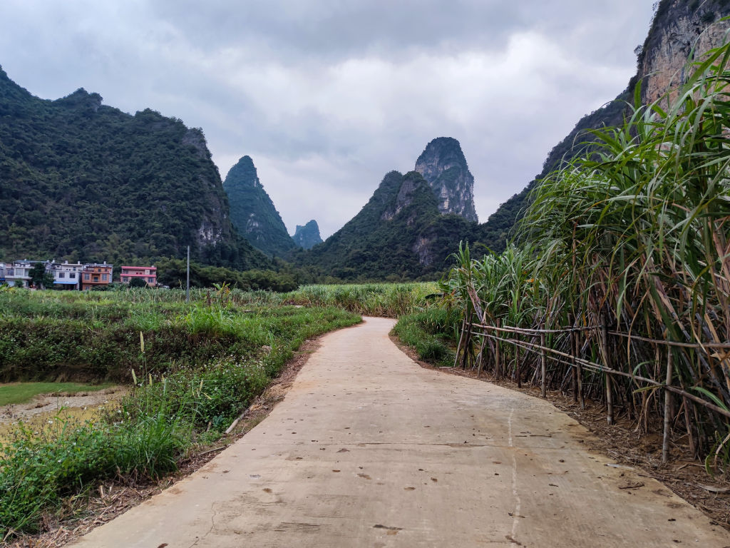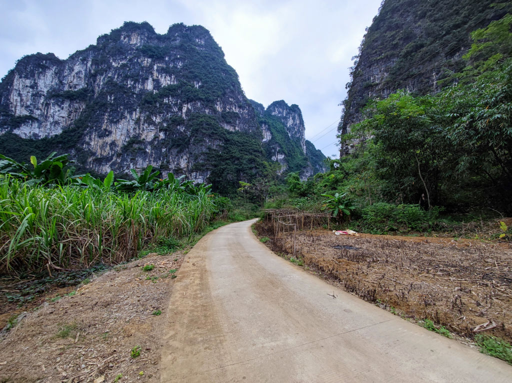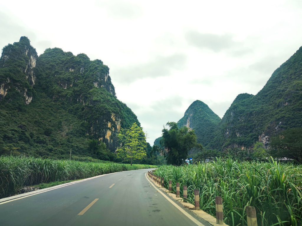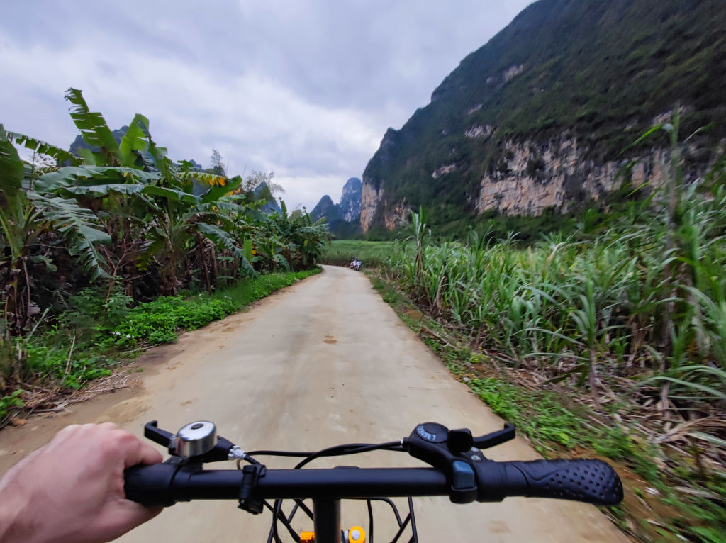 Après cette agréable promenade en bambou raft bien touristique en compagnie de ces mamies un peu folles, on retourne faire une petite pause à l’hotel. Notre aubergiste nous propose des vélos pour visiter des endroits un peu plus éloignés qui méritent le détour. On est très intéressé et accepte la proposition, elle nous indique donc un point GPS pour la fin de journée. En fait, une piste cyclable a été créée dans Mingshi pour faire le tour des villages alentour. On est subjugué par le paysage, la route passe au milieu de ces montagnes de karst vertigineuses, on traverse des champs de canne à sucre et on croise les mamies qui ramènent leur élevage de canards à la maison comme si c’était des moutons.