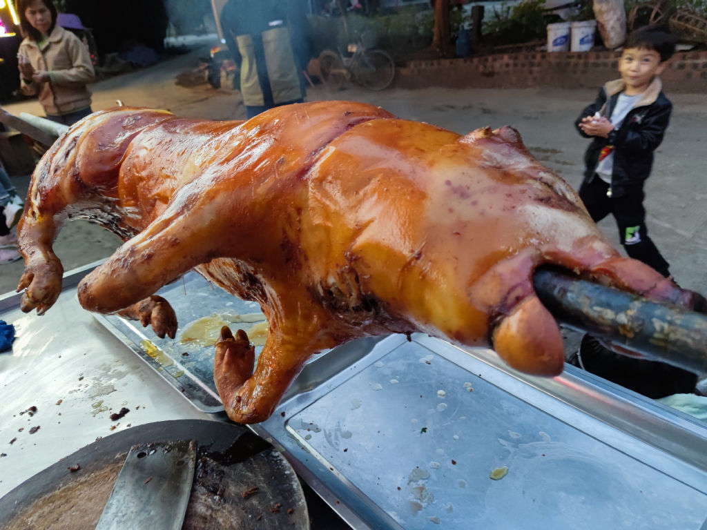 La nuit commence à tomber et il est temps de rentrer. On s’arrête sur le bord de la route principale, des restaurants ont installé une broche avec un cochon complet qui est en train de conduire. Ce sera un plat idéal pour finir cette journée.