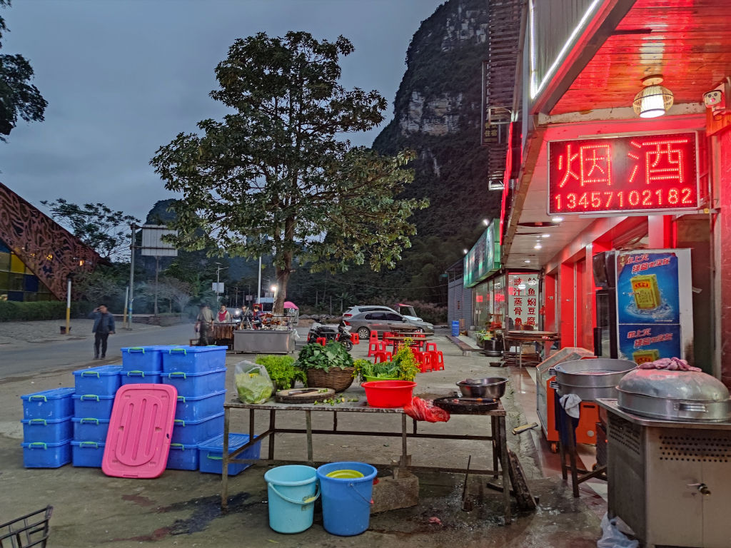 Il n’y a pas d’animation nocturne à Mingshi, si ce ne sont les pics de karst qui sont éclairés que l’on peut admirer depuis les grandes fenêtres de la chambre. On se couche rapidement car demain on a encore beaucoup de route. Le lever de soleil est tout aussi enchanteur, en ouvrant les rideaux on voit que le temps est bien plus beau, les nuages gris laissant la place à un ciel bleu, on s’installe pour un petit déjeuner gargantuesque, fait de vermicelles de riz.