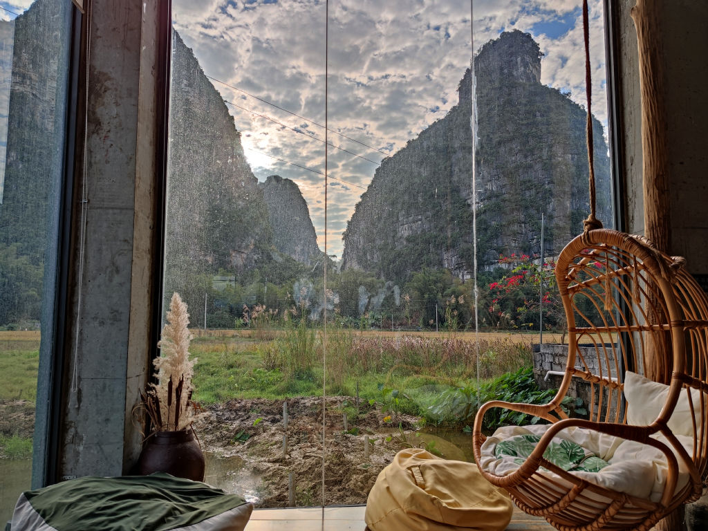D'ici on apprécie la vue sur les karsts qui se reflètent dans l’eau. Ici un hôtel a été construit et profite d’une vue incroyable (son prix aussi est incroyable)