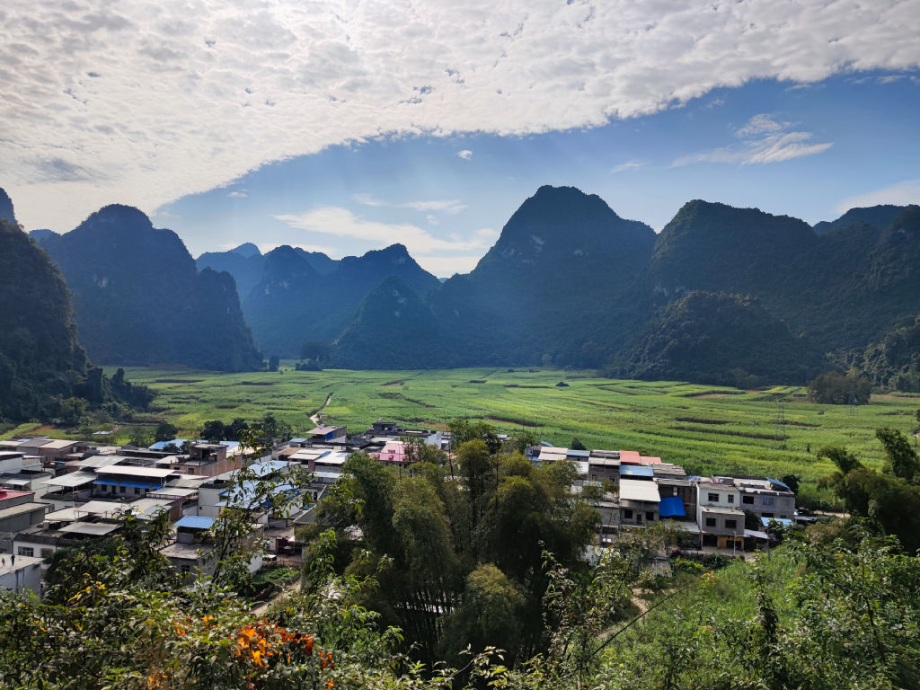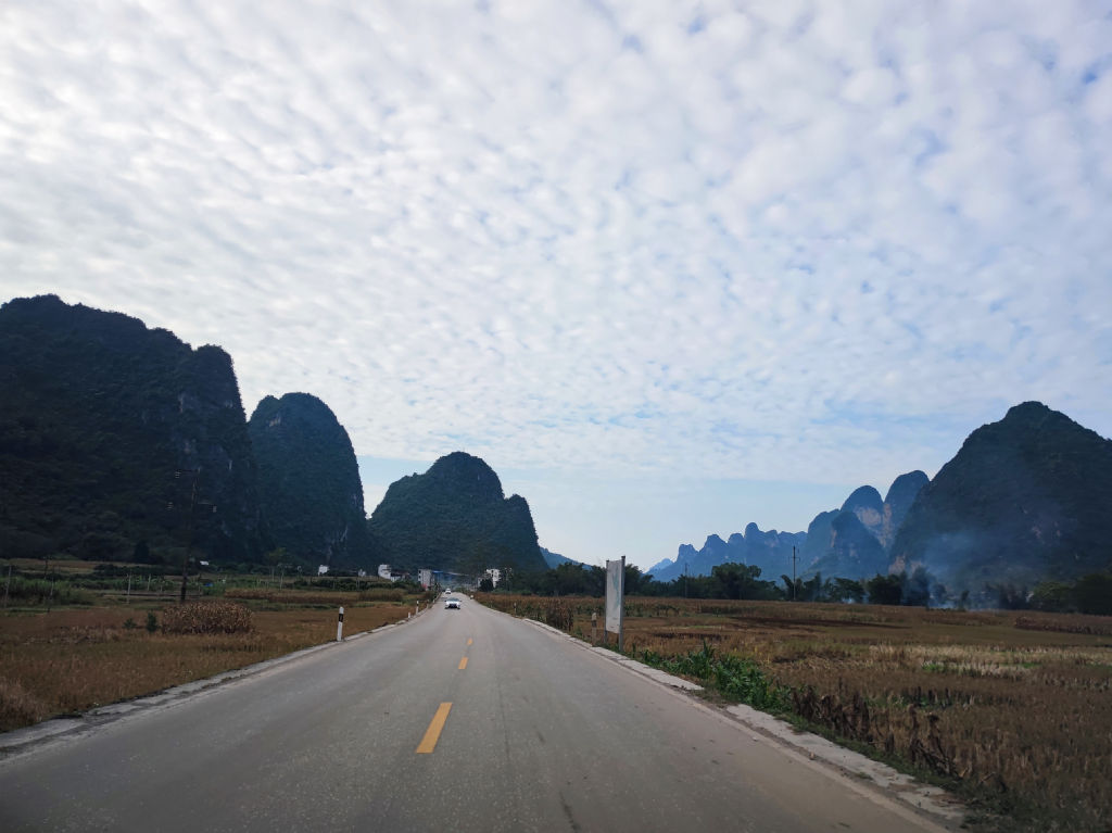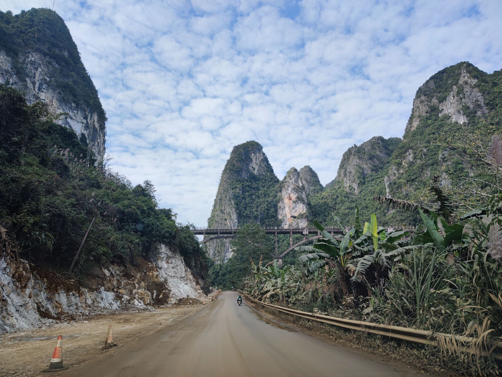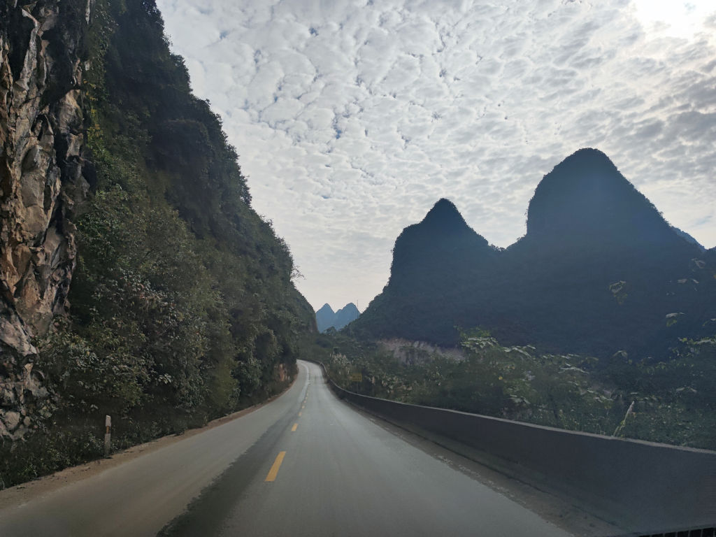 La route G219 part de la côte Sud Ouest de la Mer de Chine du Sud en bordure du Vietnam, à Fangchenggang et longe la frontière de la Chine jusqu’à la Russie, sur plus de 10 000 kilomètres. Elle suit le contour de la frontière, et traverse les plus beaux paysages du pays. Du littoral de Fangchenggang, aux paysages de Karst du Guangxi où nous nous trouvons actuellement, puis les zones tropicales du Yunnan, avant de monter sur le plateau tibétain, pour redescendre vers le désert du Xinjiang et les paysages alpins du Nord du Xinjiang avant d’arriver à la frontière russe. Assurément un plan de voyage qui ferait rêver tout voyageur, mais qui est bien sur off-limit pour les étrangers en solitaire de toute façon sur sa partie tibétaine. Aujourd’hui, nous allons en déguster une toute petite partie, sur la municipalité de Chongzuo, entre Mingshi et Detian. Et cette partie va nous mettre l’eau à la bouche. La route serpente au milieu des karsts vertigineux.