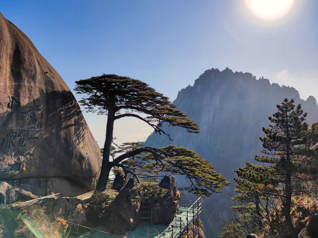 Nous arrivons rapidement devant un des pins les plus connus des Montagnes Jaunes, Yingke Shu, protégé derrière une barrière mais qui attire tous les touristes pour une photo souvenir avec cette vue classique en fond. En matinée, on a le soleil de face, ce qui n’est pas idéal pour les photos, pour cela il vaudrait mieux revenir en fin de journée, mais on sera de l’autre côté donc impossible malheureusement, c’est quand même un point noir de faire le sentier des montagnes jaunes dans le sens Ouest – Est.
